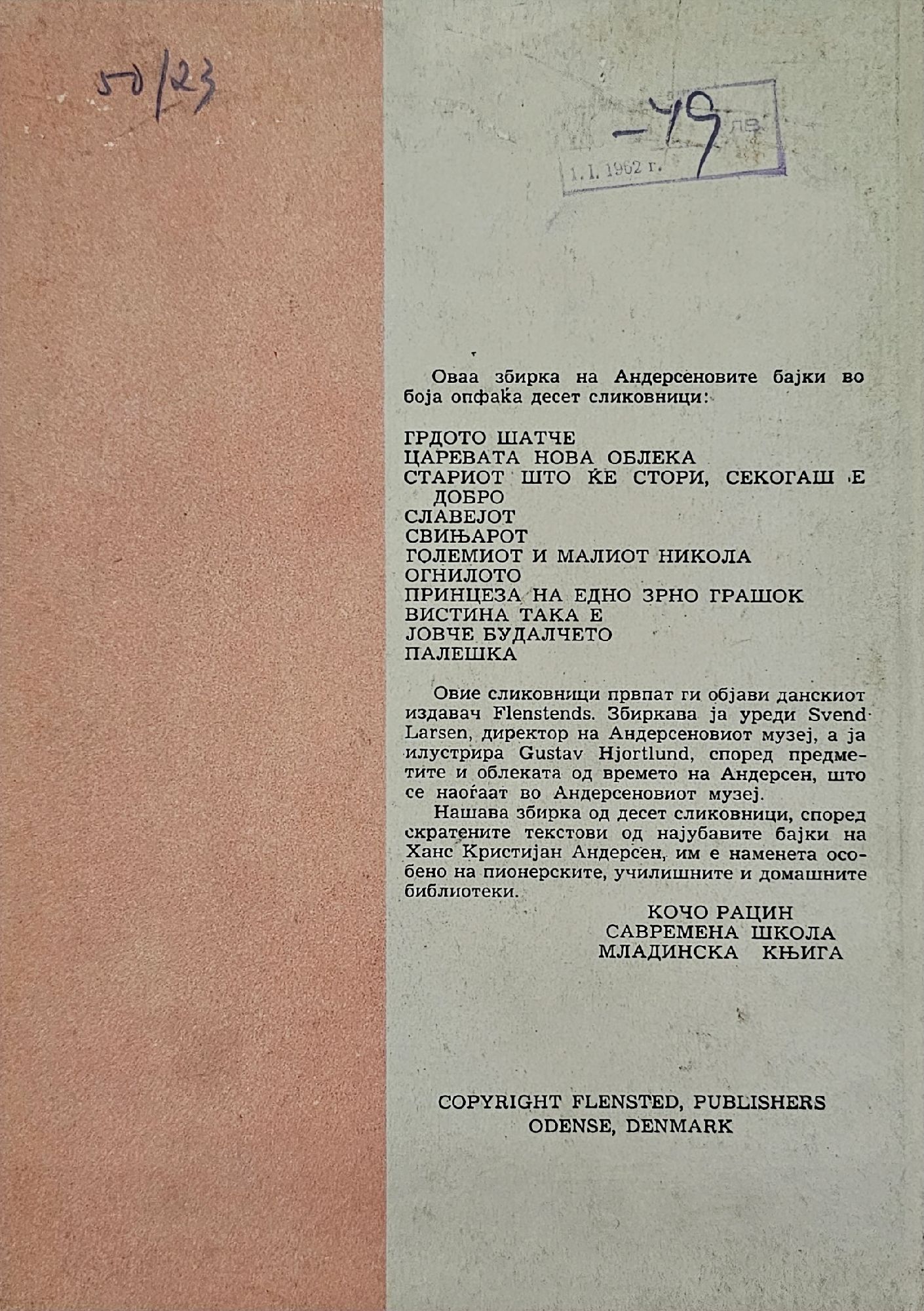 Стариош што ке стори секоiаш е добро. Царевата нова облека. Грдото шатче. Големиот и мал Никола. Jовче будалчето. Огнилото. Принцезата на едно зрно грашок. Славеjот