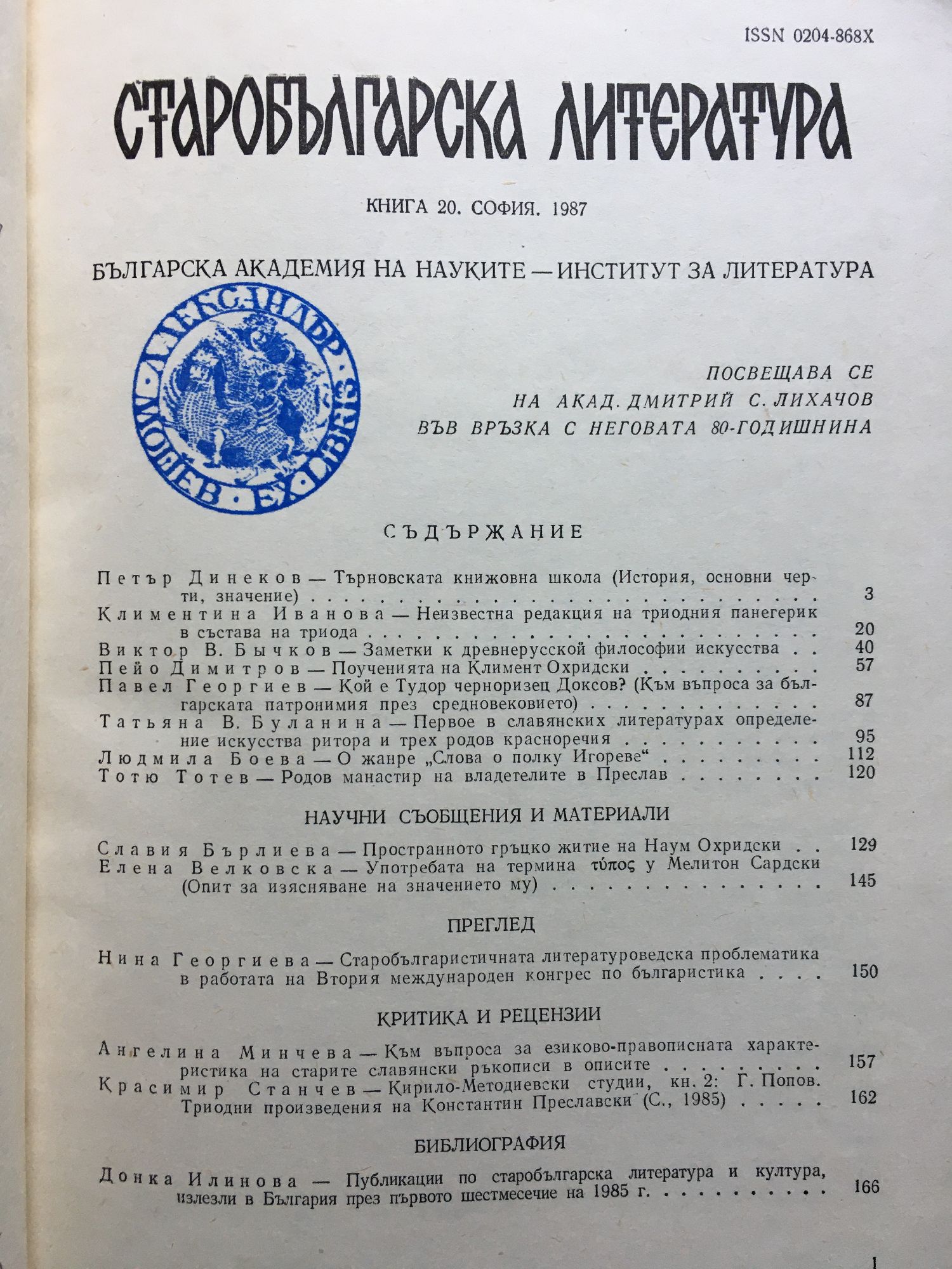 Посвещава се на акад. Димитрий С. Лихачов във връзка с неговата 80-годишнина