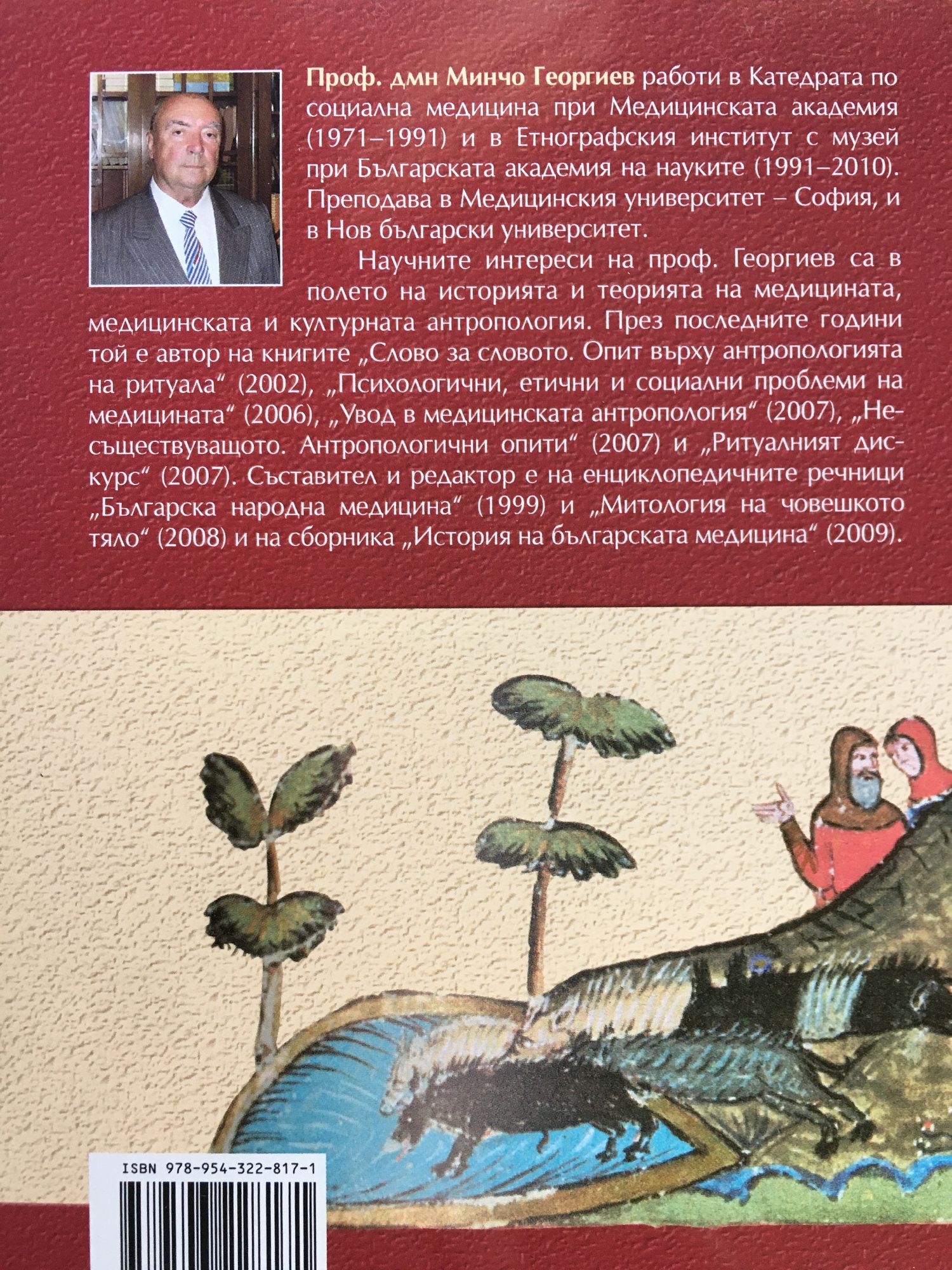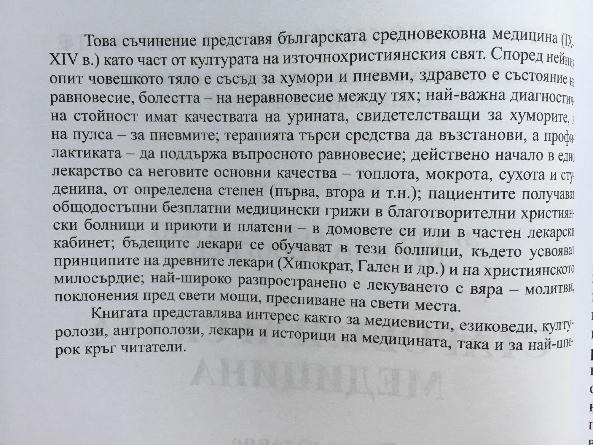 Проф. дмн Минчо Георгиев работи в Катедрата по социална медицина при Медицинската академия /1971-1991/ и в Етнографския институт с музей при Българската академия на науките /1991-2010/. Преподава в Медицинския университет - София, и в Нов български университет. Научните интереси на проф. Георгиев са в полето на историята и теорията на медицината, медицинската и културната антропология. Настоящото изследване предлага един цялостен поглед върху средновековните славянски и в частност български знания за човешкото тяло, неговите болки и начините за изцеляването им. То представя българската средновековна медицина като част от културата на източно християнския свят. Според нейния опит човешкото тяло е съсед за хумори и пневми, здравето е състояние на равновесие, болестта - на неравновесие между тях; най-важната диагностична стойност имат качествата на урината, свидетелстващи за хуморите, и на пулса - за пневмите; терапията търси средства да възстанови, а профилактиката - да поддържа въпросното равновесие. Действено начало в едно лекарство е неговото основно качество - топлота, мокрота, сухота и студенина; пациентите получават общодостъпни безплатни медицински грижи в благотворителни християнски болници и приюти и платени - в домовете си или в частен лекарски кабинет. Най-широко разпространено е лекуването с вяра - молитви, поклонения пред свети мощи, преспиване на свети места. Книгата представлява интерес както за медиевисти, езиковеди, културолози, антрополози, лекари и историци на медицината, така и за най-широк кръг читатели.