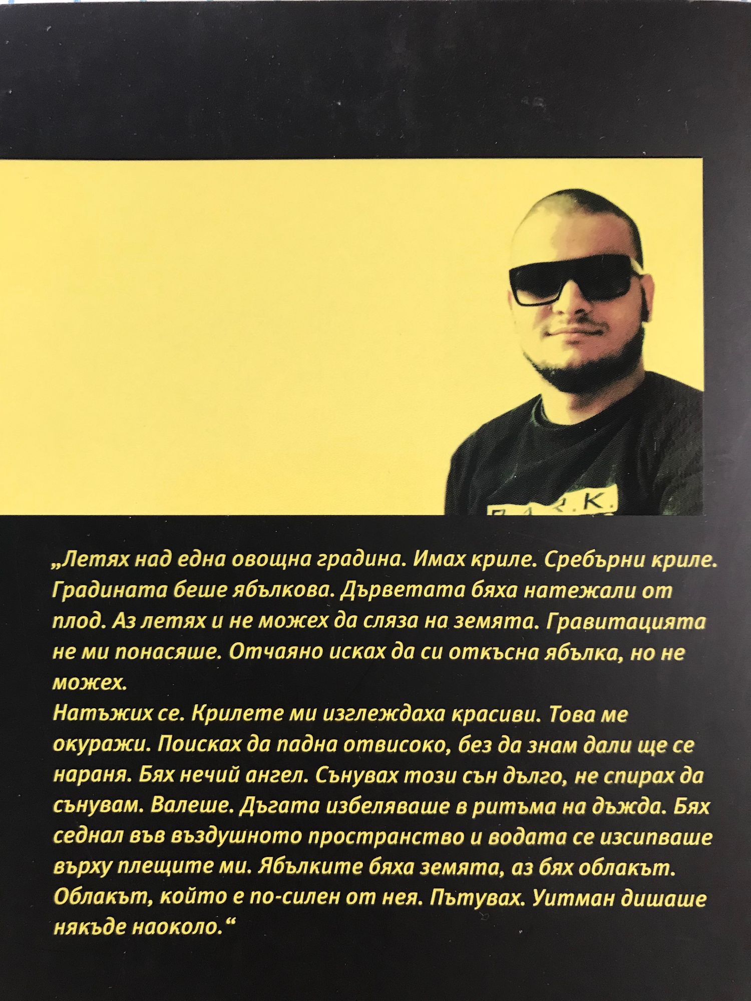 "Летях над една овощна градина. Имах криле. Сребърни клире. Градината беше ябълкова. Дърветата бяха натежали от плод. Аз летях и не можех да сляза на земята. Гравитацията не ми понасяше. Отчаяно исках да си откъсна ябълка, но не можех. Натъжих се. Крилете ми изглеждаха красиви. Това ме окуражи. Поисках да падна отвисоко, без да знам дали ще се нараня. Бях нечий ангел. Сънувах този сън дълго, не спирах да сънувам. Валеше. Дъгата избеляваше в ритъма на дъжда. Бях седнал във въздушното пространство и водата се изсипваше върху плещите ми. Ябълките бяха на земята, аз бях облакът. Облакът, който е по-силен от нея. Пътувах. Уитман дишаше някъде наоколо."