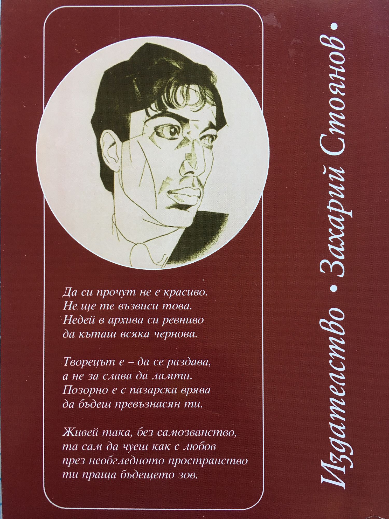 Да си прочут не е красиво. Не ще те възвиси това. Недей в архива си ревниво да къташ всяка чернова. Творецът е - да се раздава, а не за слава да ламти. Позорно е с пазарска врява да бъдеш превъзнасян ти. Живей така, без самозванство, та сам да чуеш как с любов през необгледното пространство ти праща бъдещето зов.