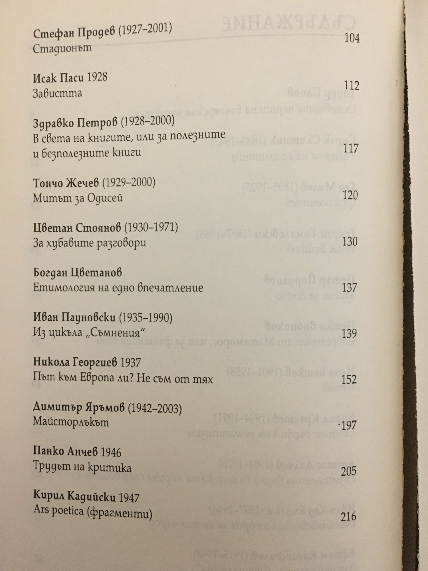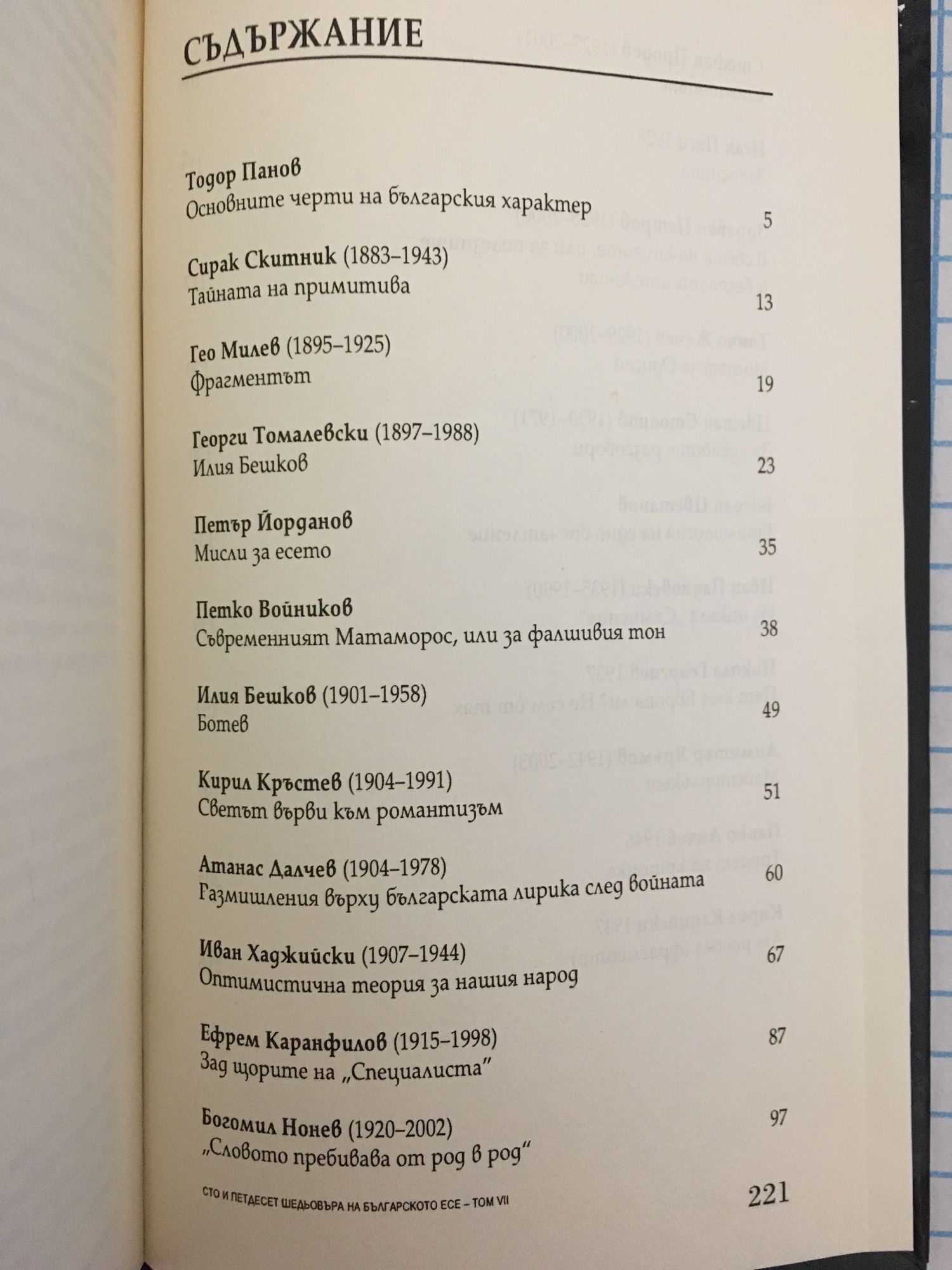 Настоящето издание съдържа есеистични творби на Тодор Панов, Сирак Скитник, Гео Милев, Георги Томалевски, Петър Йорданов, Петко Войников, Илия Бешков, Кирил Кръстев, Атанас Далчев, Иван Хаджийски, Ефрем Карамфилов, Богомил Нонев, Стефан Продев, Исак Паси, Здравко Петров, Тончо Жечев, Цветан Стоянов, Богдан Цветков, Иван Пауновски, Никола Георгиев, Димитър Яръмов, Панко Анчев, Кирил Кадийски.