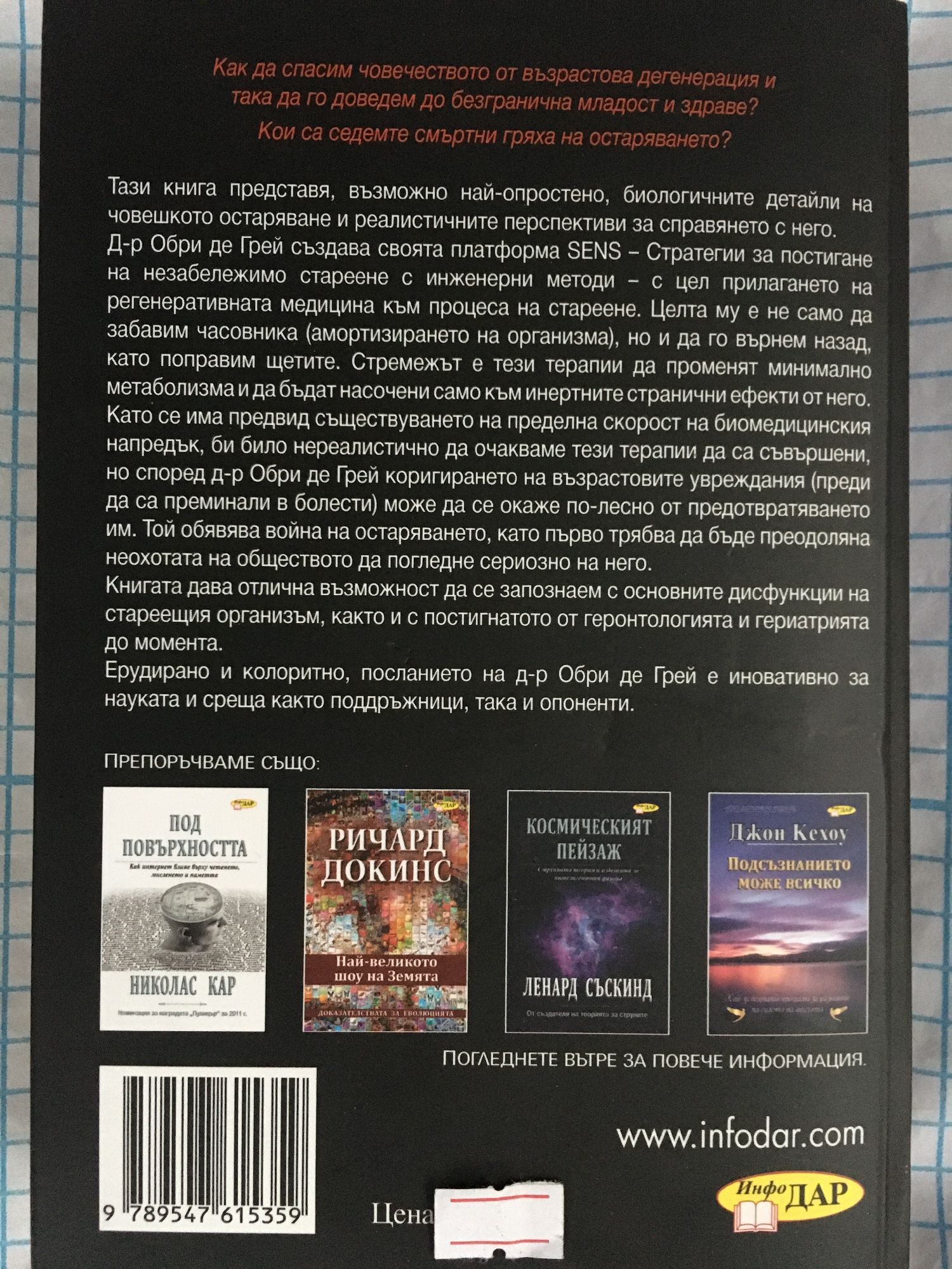 Как да спасим човечеството от възрастова дегенерация и така да го доведем до безгранична младост и здраве? Кои са седемте смъртни гряха на остаряването? Тази книга представя, възможно най-опростено, биологичните детайли на човешкото остаряване и реалистичните перспективи за справянето с него. Д-р Обри де Грей създава своята платформа SENS – Стратегии за постигане на незабележимо стареене с инженерни методи – с цел прилагането на регенеративната медицина към процеса на стареене. Целта му е не само да забавим часовника (амортизирането на организма), но и да го върнем назад, като поправим щетите. Стремежът е тези терапии да променят минимално метаболизма и да бъдат насочени само към инертните странични ефекти от него. Като се има предвид съществуването на пределна скорост на биомедицинския напредък, би било нереалистично да очакваме тези терапии да са съвършени, но според д-р Обри де Грей коригирането на възрастовите увреждания (преди да са преминали в болести) може да се окаже по-лесно от предотвратяването им. Той обявява война на остаряването, като първо трябва да бъде преодоляна неохотата на обществото да погледне сериозно на него. Книгата дава отлична възможност да се запознаем с основните дисфункции на стареещия организъм, както и с постигнатото от геронтологията и гериатрията до момента. Ерудирано и колоритно, посланието на д-р Обри де Грей е иновативно за науката и среща както поддръжници, така и опоненти.