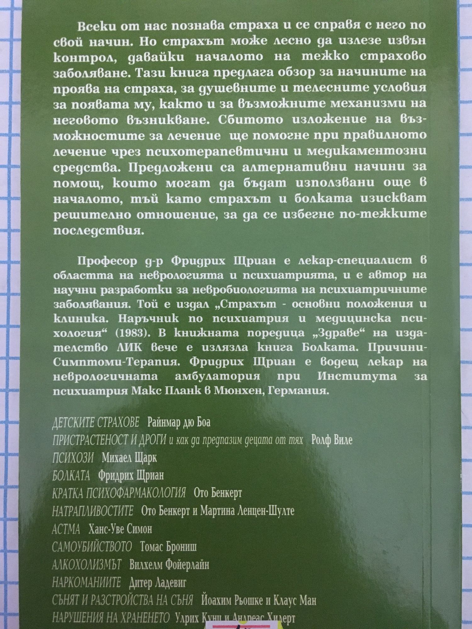 Всеки от нас познава страха и се справя с него по свой начин. Но страхът може лесно да излезе извън контрол, давайки началото на тежко страхово заболяване. Тази книга предлага обзор за начините на проява на страха, за душевните и телесните условия за появата му, както и за възможните механизми на неговото възникване. Сбитото изложение на възможностите за лечение ще помогне при правилното лечение чрез психотерапевтични и медикаментозни средства. Предложени са алтернативни начини за помощ, които могат да бъдат използвани още в началото, тъй като страхът и болката изискват решително отношение, за да се избегне по-тежките последствия.