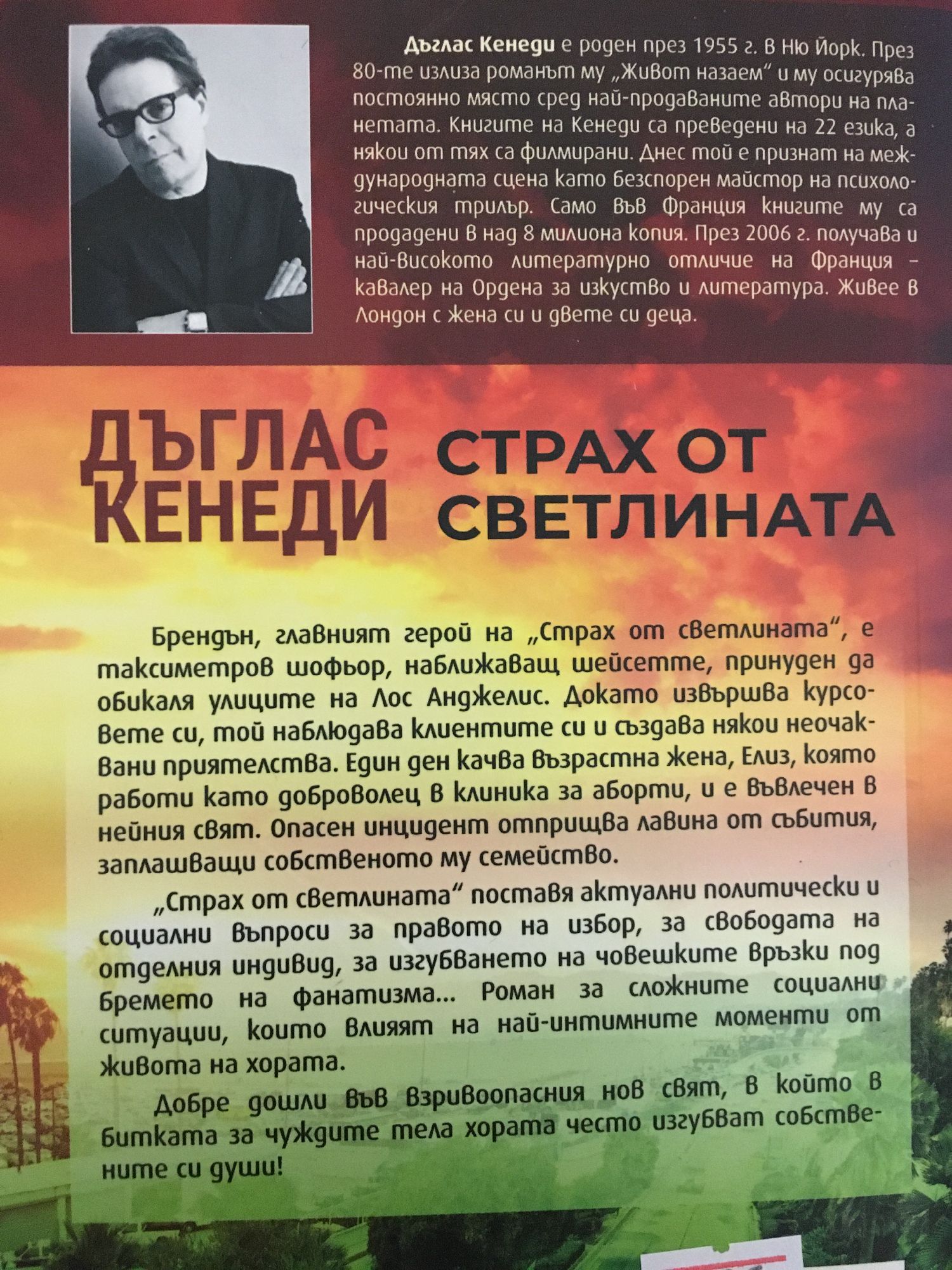 Брендън, главният герой на „Страх от светлината“, е таксиметров шофьор, наближаващ шейсетте, принуден да обикаля улиците на Лос Анджелис. Докато извършва курсовете си, той наблюдава клиентите си и създава някои неочаквани приятелства. Един ден качва възрастна жена, Елиз, която работи като доброволец в клиника за аборти, и е въвлечен в нейния свят. Опасен инцидент отприщва лавина от събития, заплашващи собственото му семейство. „Страх от светлината“ поставя актуални политически и социални въпроси за правото на избор, за свободата на отделния индивид, за изгубването на човешките връзки под бремето на фанатизма... Роман за сложните социални ситуации, които влияят на най-интимните моменти от живота на хората. Добре дошли във взривоопасния нов свят, в който в битката за чуждите тела хората често изгубват собствените си души!
