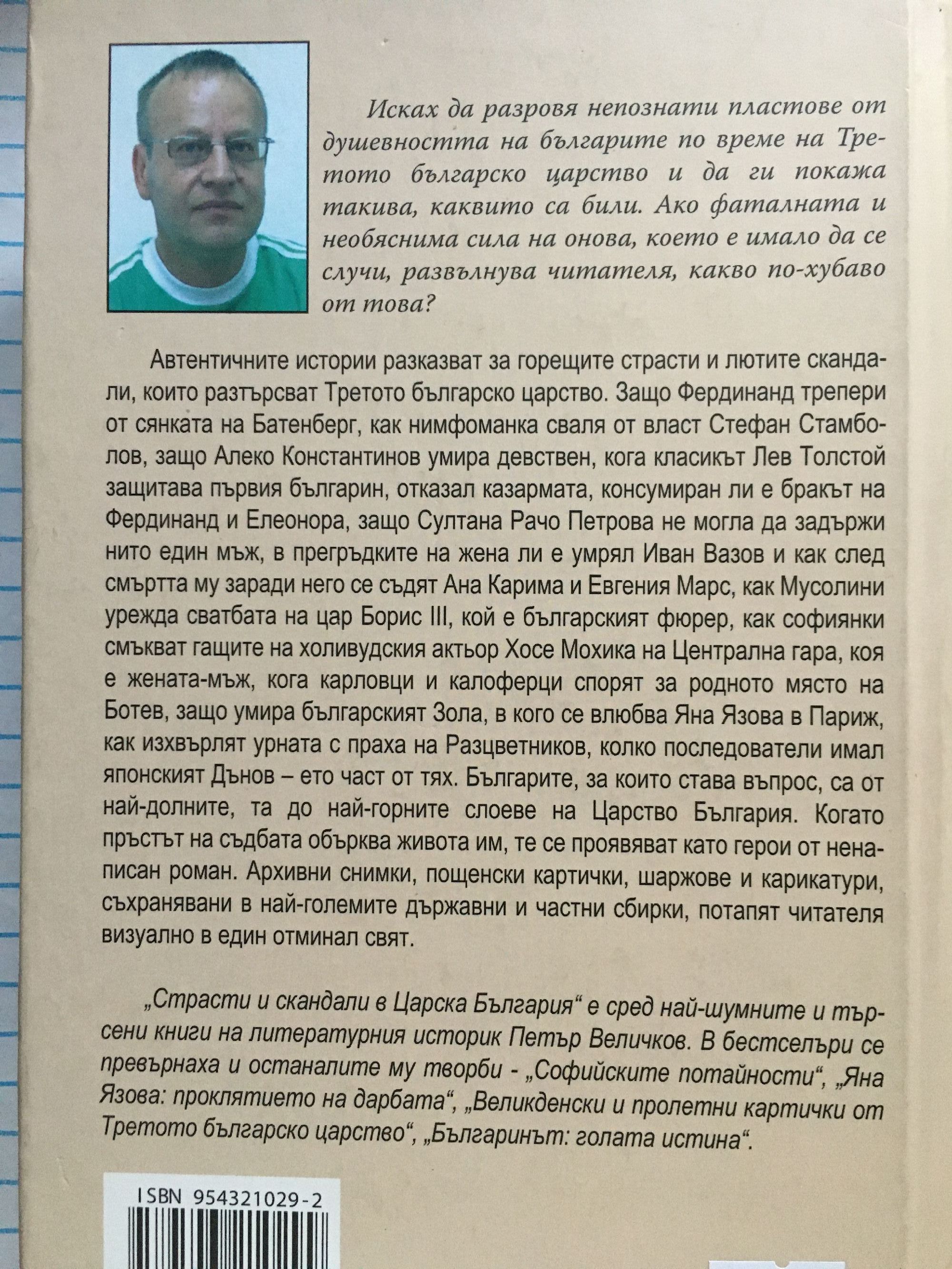 Исках да разровя непознати пластове от душевността на българите по време на Третото българско царство и да ги покажа такива, каквито са били. Ако фаталната и необяснима сила на онова, което е имало да се случи, развълнува читателя, какво по-хубаво от това? Автентичните истории разказват за горещите страсти и лютите скандали, които разтърсват Третото българско царство. Защо Фердинанд трепери от сянката на Батенберг, как нимфоманка сваля от власт Стефан Стамболов, защо Алеко Константинов умира девствен, кога класикът Лев Толстой защитава първия българин, отказал казармата, консумиран ли е бракът на Фердинанд и Елеонора, защо Султана Рачо Петрова не могла да задържи нито един мъж, в прегръдките на жена ли е умрял Иван Вазов и как след смъртта му заради него се съдят Ана Карима и Евгения Марс, как Мусолини урежда сватбата на цар Борис III, кой е българският фюрер, как софиянки смъкват гащите на холивудския актьор Хосе Мохика на Централна гара, коя е жената-мъж, кога карловци и калоферци спорят за родното място на Ботев, защо умира българският Зола, в кого се влюбва Яна Язова в Париж, как изхвърлят урната с праха на Разцветников, колко последователи имал японският Дънов – ето част от тях. Българите, за които става въпрос, са от най-долните, та до най-горните слоеве на Царство България. Когато пръстът на съдбата обърква живота им, те се проявяват като герои от ненаписан роман. Архивни снимки, пощенски картички, шаржове и карикатури, съхранявани в най-големите държавни и частни сбирки, потапят читателя визуално в един отминал свят. „Страсти и скандали в Царска България“ е сред най-шумните и търсени книги на литературния историк д-р Петър Величков. В бестселъри се превърнаха и останалите му творби - „Софийските потайности“, „Яна Язова: проклятието на дарбата“, „Великденски и пролетни картички от Третото българско царство“, „Българинът: голата истина“, „Прототипи и герои“.