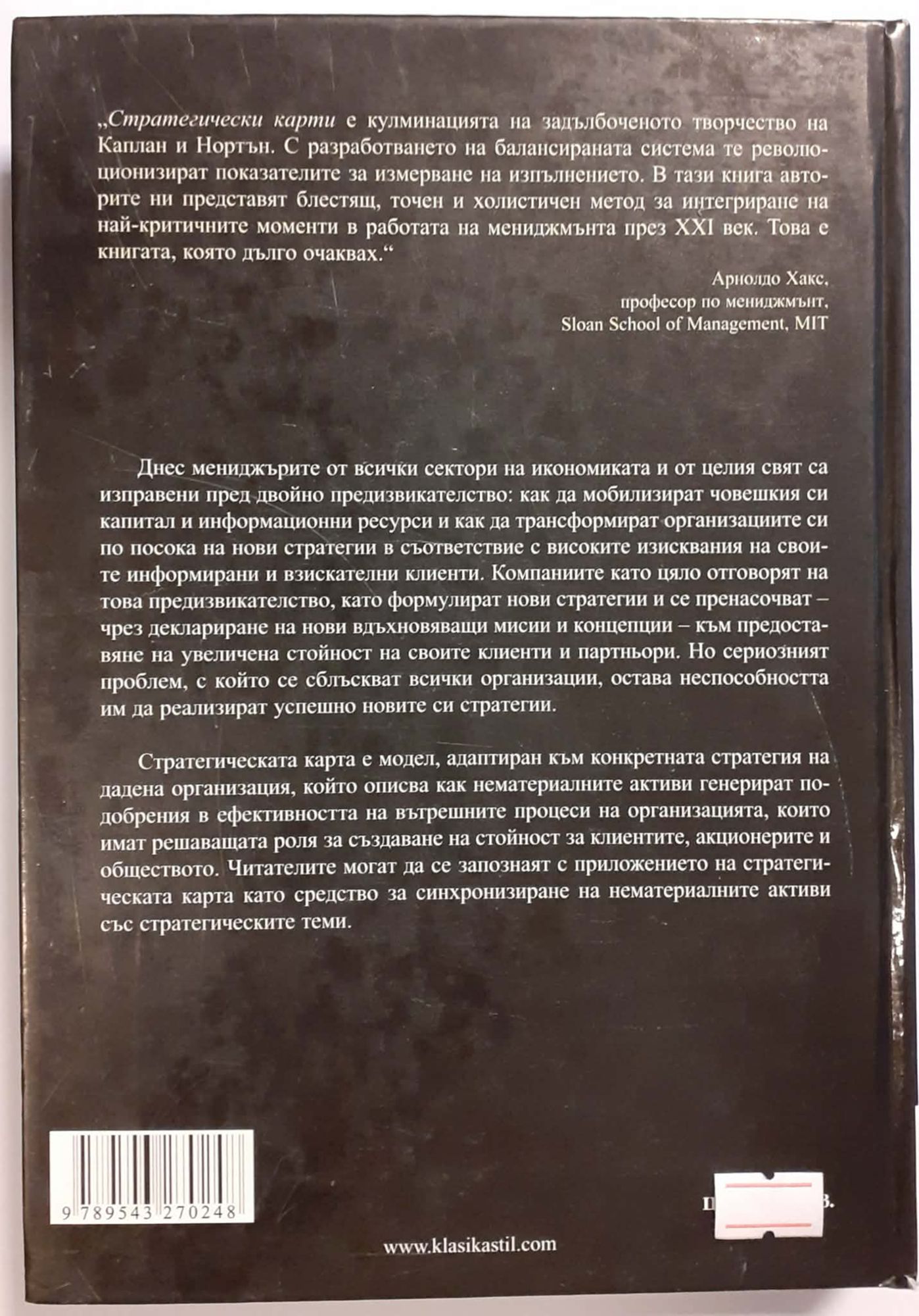 Днес мениджърите от всички сектори на икономиката и от целия свят са изправени пред двойно предизвикателство: как да мобилизират човешкия си капитал и информационни ресурси и как да трансформират организациите си по посока на нови стратегии, в съответствие с високите изисквания на своите информирани и взискателни клиенти. Компаниите като цяло отговорят на това предизвикателство, като формулират нови стратегии и се пренасочват – чрез деклариране на нови вдъхновяващи мисии и концепции – към предоставяне на увеличена стойност на своите клиенти и партньори. Но сериозният проблем, с който се сблъскват всички организации, остава неспособността им да реализират успешно новите си стратегии. Стратегическата карта е модел, адаптиран към конкретната стратегия на дадена организация, който описва как нематериалните активи генерират подобрения в ефективността на вътрешните процеси на организацията, които имат решаващата роля за създаване на стойност за клиентите, акционерите и обществото. Читателите могат да се запознаят с приложението на стратегическата карта като средство за синхронизиране на нематериалните активи със стратегическите теми