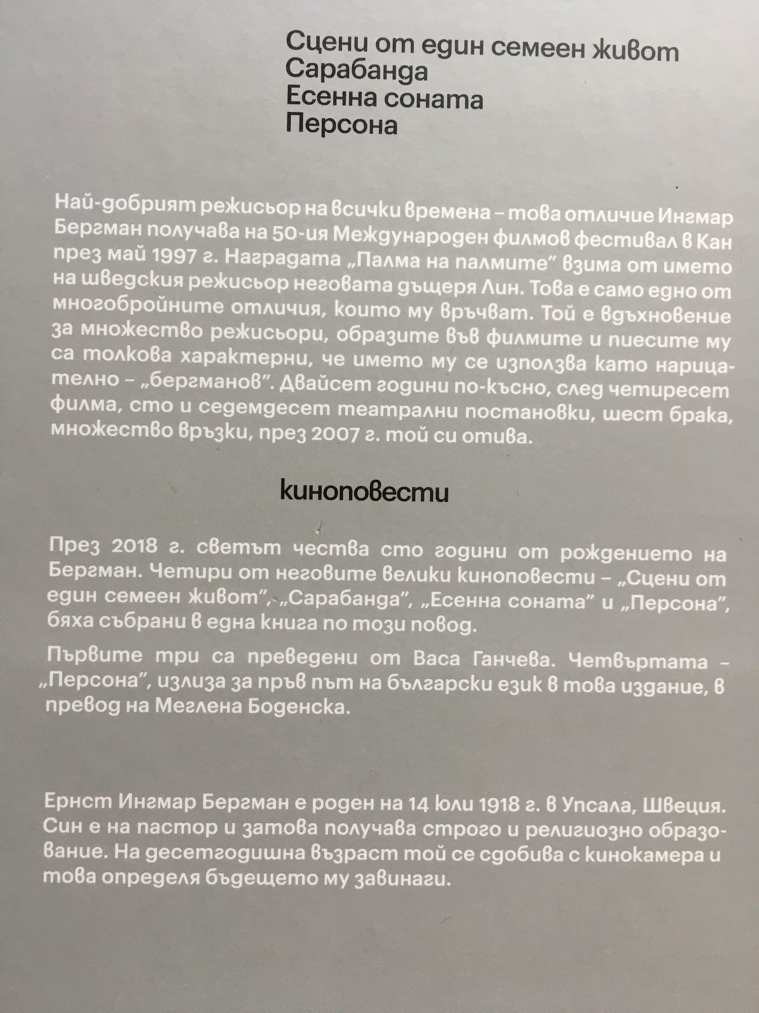 През 2018 г. светът чества сто години от рождението на Бергман. Четири от неговите велики киноновели - "Сцени от един семеен живот", "Сарабанда", "Есенна соната" и "Персона", бяха събрани в една книга по този повод. Първите три са преведени от Васа Ганчева. Четвъртата - "Персона", излиза за пръв път на български в това издание в превод на Меглена Боденска. Ернст Ингмар Бергман е роден на 14 юли 1918 г. в Упсала, Швеция. Син е на пастор и затова получава строго и религиозно образование. На десетгодишна възраст той се сдобива с кинокамера и това определя бъдещето му завинаги. Най-добрият режисьор на всички времена - това отличие Ингмар Бергман получава на 50-ия Международен филмов фестивал в Кан през май 1997 г. Наградата "Палма на палмите" взима от името на шведския режисьор неговата дъщеря Лин. Това е само едно от многобройните отличия, които му връчват. Той е вдъхновение за множество режисьори, образите във филмите и пиесите му са толкова характерни, че името му се използва като нарицателно - "бергманов". Двайсет години по-късно, след четиридесет филма, сто и седемдесет театрални постановки, шест брака, множество връзки, през 2007 г. той си отива от този свят.