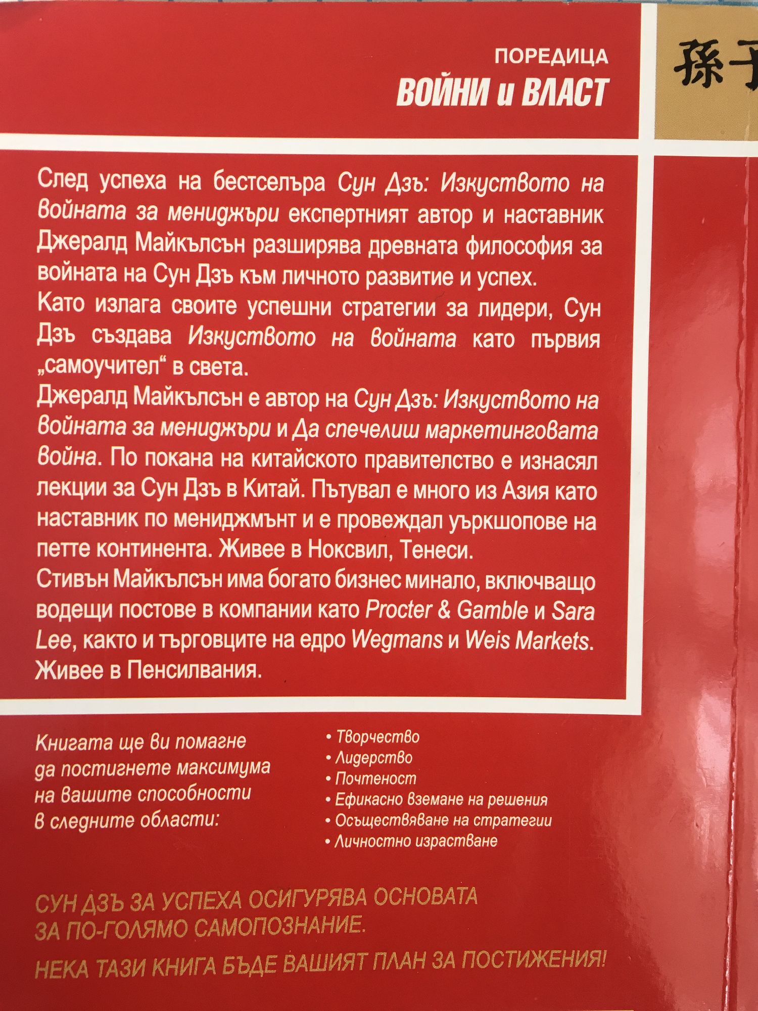 След успеха на бестселъра Сун Дзъ: Изкуството на войната за мениджъри експертният автор и наставник Джералд Майкълсън разширява древната философия за войната на Сун Дзъ към личното развитие и успех. Като излага своите успешни стратегии за лидери, Сун Дзъ създава Изкуството на войната като първия „самоучител“ в света. Джералд Майкълсън е автор на Сун Дзъ: Изкуството на войната за мениджъри и Да спечелиш маркетинговата война. По покана на китайското правителство е изнасял лекции за Сун Дзъ в Китай. Пътувал е много из Азия като наставник по мениджмънт и е провеждал уъркшопове на петте континента. Живее в Ноксвил, Тенеси. Стивън Майкълсън има богато бизнес минало, включващо водещи постове в компании като Procter & Gamble и Sara Lee, както и търговците на едро Wegmans и Weis Markets. Живее в Пенсилвания. Книгата ще ви помагне да постигнете максимума на вашите способности в следните области: • Творчество • Лидерство • Почтеност • Ефикасно вземане на решения • Осъществяване на стратегии • Личностно израстване Сун Дзъ за успеха осигурява основата за по-голямо самопознание. Нека тази книга бъде вашият план за постижения!