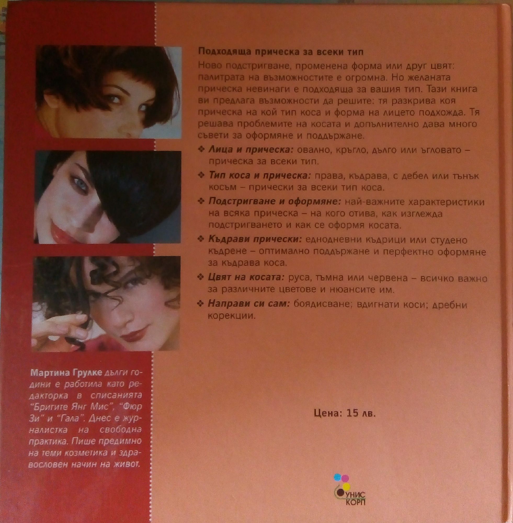 Подходяща прическа за всеки тип. Ново подстригване, променена форма или друг цвят: палитрата на възможностите е огромна. Но желаната прическа невинаги е подходяща за вашия тип. Тази книга и предлага възможности да решите: тя разкрива коя прическа на кой тип коса и форма на лицето подхожда. Тя решава проблемите на косата и допълнително дава много съвети за оформяне и поддържане. - Лица и прическа: овално, кръгло, дълго или ъгловато -прическа за всеки тип. - Тип коса и прическа: права, къдрава, с дебел или тънък косъм - прически за всеки тип коса. - Подстригване и оформяне: най-важните характеристики на всяка прическа - на кого отива, как изглежда подстригването и как се оформя косата. - Къдрави прически: еднодневни къдрици или студено къдрене - оптимално поддържане и перфектно оформяне за къдрава коса. - Цвят на косата: руса, тъмна или червена - всичко важно за различните цветове и нюансите им. - Направи си сам: боядисване; вдигнати коси; дребни корекции.