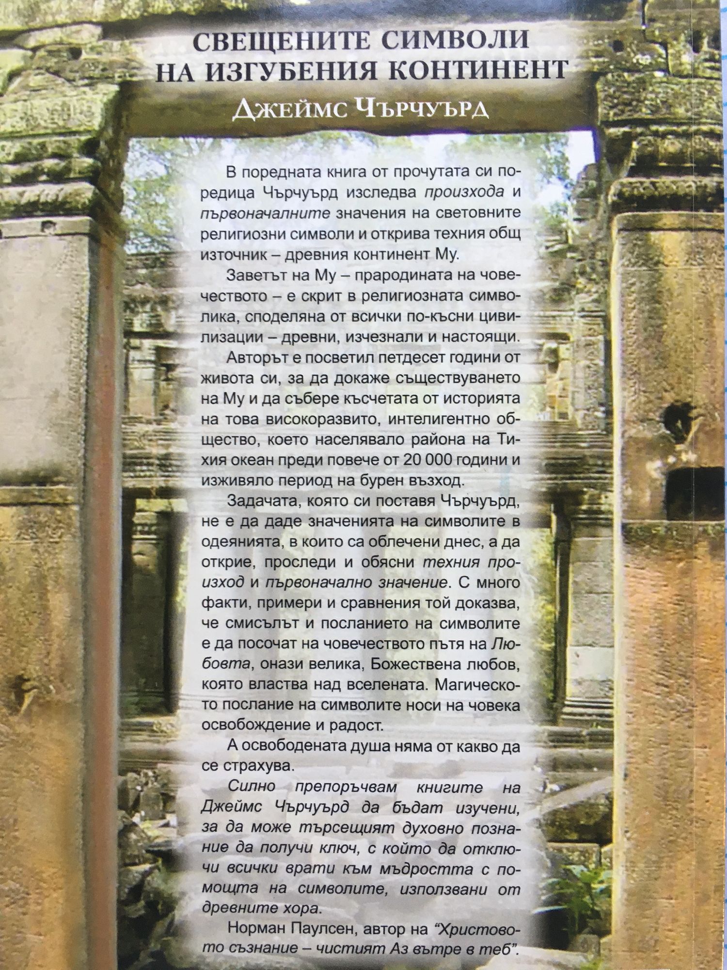 В поредната книга от прочутата си поредица Чърчуърд изследва произхода и първоначалните значения на световните религиозни символи и открива техния общ източник - древния континент Му. Заветът на Му - прародината на човечеството - е скрит в религиозната символика, споделяна от всички по-късни цивилизации - древни, изчезнали и настоящи. Авторът е посветил петдесет години от живота си, за да докаже съществуването на Му и да събере късчетата от историята на това високоразвито, интелигентно общество, което населявало района на Тихия океан преди повече от 20 000 години и изживяло период на бурен възход. Задачата, която си поставя Чърчуърд, не е да даде значенията на символите в одеянията, в които са облечени днес, а да открие, проследи и обясни техния произход и първоначално значение. С много факти, примери и сравнения той доказва, че смисълът и посланието на символите е да посочат на човечеството пътя на Любовта, онази велика, Божествена любов, която властва над вселената. Магическото послание на символите носи на човека освобождение и радост. А освободената душа няма от какво да се страхува. Силно препоръчвам книгите на Джеймс Чърчуърд да бъдат изучени, за да може търсещият духовно познание да получи ключ, с който да отключи всички врати към мъдростта с помощта на символите, използвани от древните хора. Норман Паулсен, автор на "Христовото съзнание - чистият Аз вътре в теб".