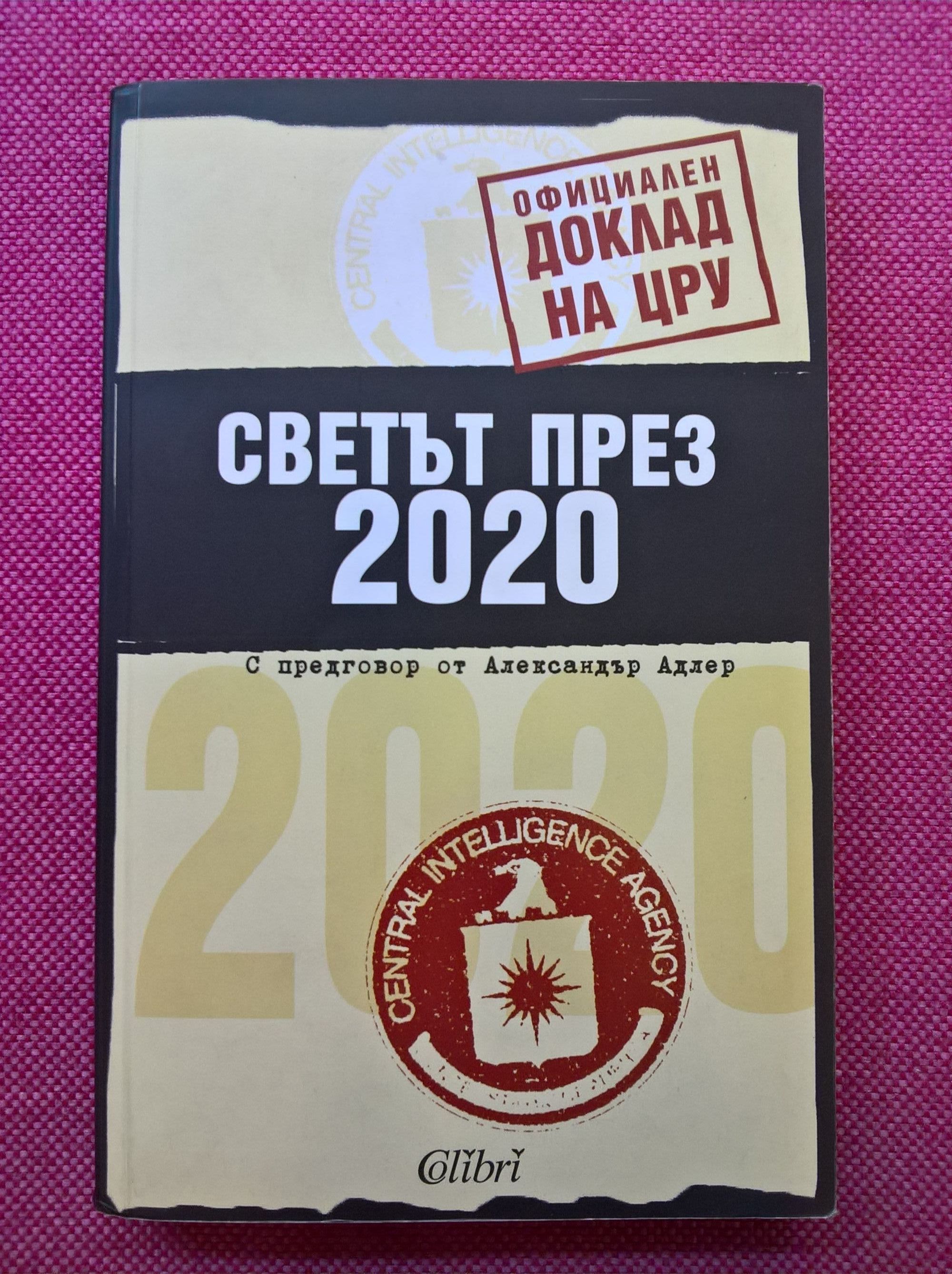 Светът през 2020 е третият разсекретен доклад на Националния разузнавателен съвет към ЦРУ, подготвен през последните години. Това е теоретичен документ, който има за цел да изработи дългосрочна визия за бъдещето. В доклада се разглеждат четири главни сценария, по които би могъл да се развива светът през следващите петнайсет години: Pax americana, Светът според Давос, Един нов халифат, Цикълът на страха. Довеждайки до крайност тези сценарии, авторите ни разкриват техните специфични елементи, които след това откъсват от първоначалната структура, за да формират основата на окончателния вариант, представящ мнението им. Привидният екстремизъм на сценариите ги превръща в своеобразни парници, където се отглеждат някои основни понятия, за да бъдат присадени на финалния етап към един все по-близък до действителността модел. Александър Адлер Съдържателният, добре построен и интелигентен текст, който ще прочетете, идва непосредствено от Националния разузнавателен съвет (НРС). Тоест от консултативен орган, съставен изключително от дипломати, офицери от разузнаването, в по-голямата си част формирани в ЦРУ, както и от военни. Целта му е да улесни обобщенията и да даде тласък на фундаменталните изследвания в областта на разузнаването. Подобно на издателския съвет на вестник или списание, НРС не се занимава с оперативната работа и с краткосрочните проблеми, а по-скоро с дългосрочните перспективи, както и с разпространението на своите анализи най-вече вътре в ЦРУ, но и по върховете на изпълнителната власт (президентството), в основните министерства и в Държавния департамент, разполагащ със собствени изследователски звена. При все това, много рядко едно учреждение, участващо в практическата дейност на федералната държава, пристъпва към задълбочено проучване на големите тенденции на бъдещия свят. Видян в тази светлина, докладът придобива изключително значение. Робърт Л. Хъчингс Президент на Националния разузнавателен съвет