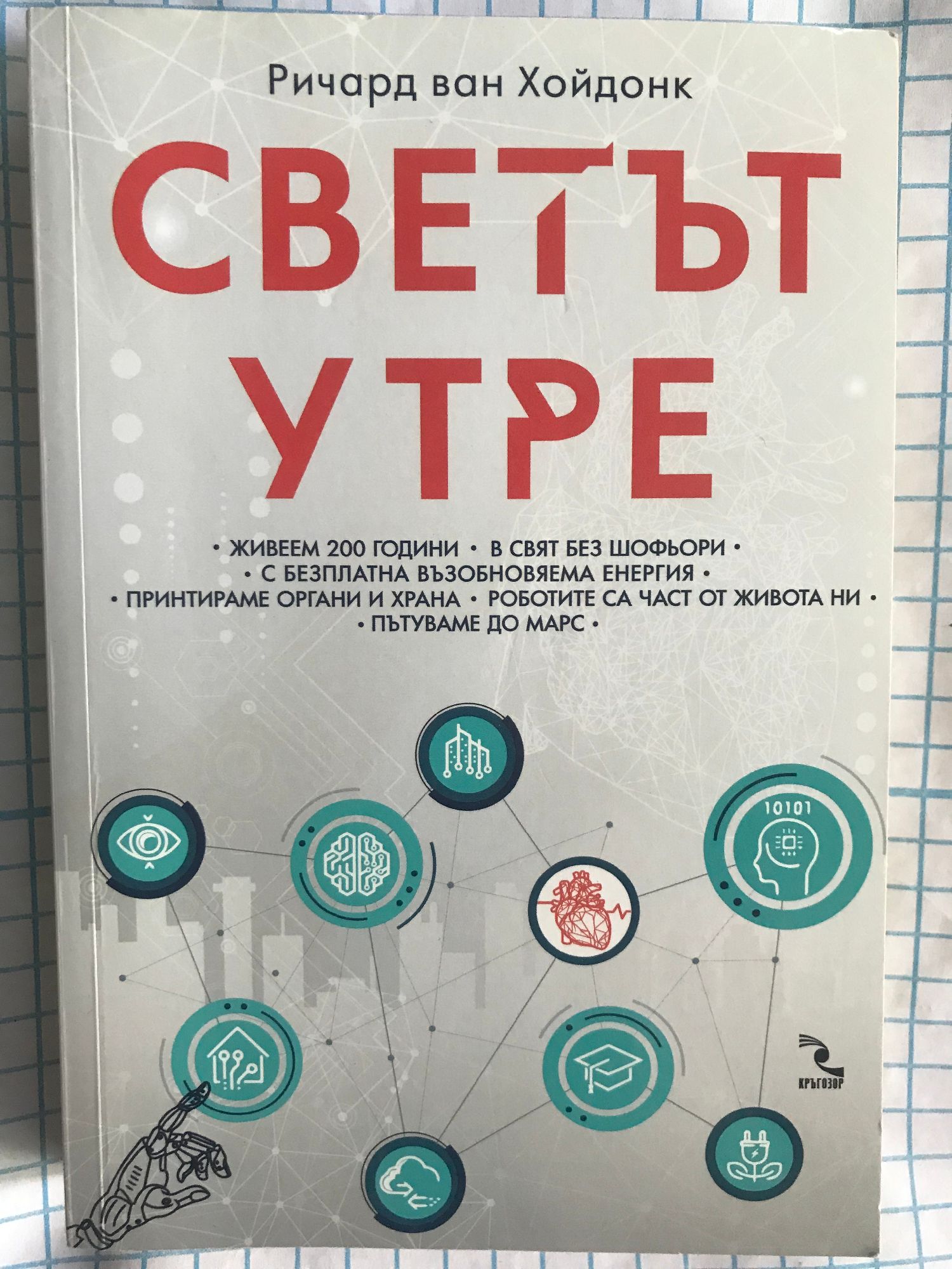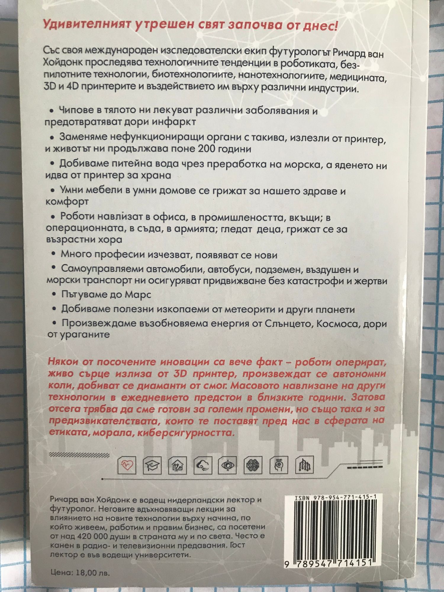 Удивителният утрешен свят започва от днес! Със своя международен изследователски екип футурологът Ричард ван Хойдонк проследява технологичните тенденции в роботиката, безпилотните технологии, биотехнологиите, нанотехнологиите, медицината, 3D и 4D принтерите и въздействието им върху различни индустрии. Чипове в тялото ни лекуват различни заболявания и предотвратяват дори инфаркт Заменяме нефункциониращи органи с такива, излезли от принтер, и животът ни продължава поне 200 години Добиваме питейна вода чрез преработка на морска, а яденето ни идва от принтер за храна Умни мебели в умни домове се грижат за нашето здраве и комфорт Роботи навлизат в офиса, в промишлеността, вкъщи; в операционната, в съда, в армията; гледат деца, грижат се за възрастни хора Много професии изчезват, появяват се нови Самоуправляеми автомобили, автобуси, подземен, въздушен и морски транспорт ни осигуряват придвижване без катастрофи и жертви Пътуваме до Марс Добиваме полезни изкопаеми от метеорити и други планети Произвеждаме възобновяема енергия от Слънцето, Космоса, дори от ураганите Някои от посочените иновации са вече факт – роботи оперират, живо сърце излиза от 3D принтер, произвеждат се автономни коли, добиват се диаманти от смог. Масовото навлизане на други технологии в ежедневието предстои в близките години. Затова отсега трябва да сме готови за големи промени, но също така и за предизвикателствата, които те поставят пред нас в сферата на етиката, морала, киберсигурността.