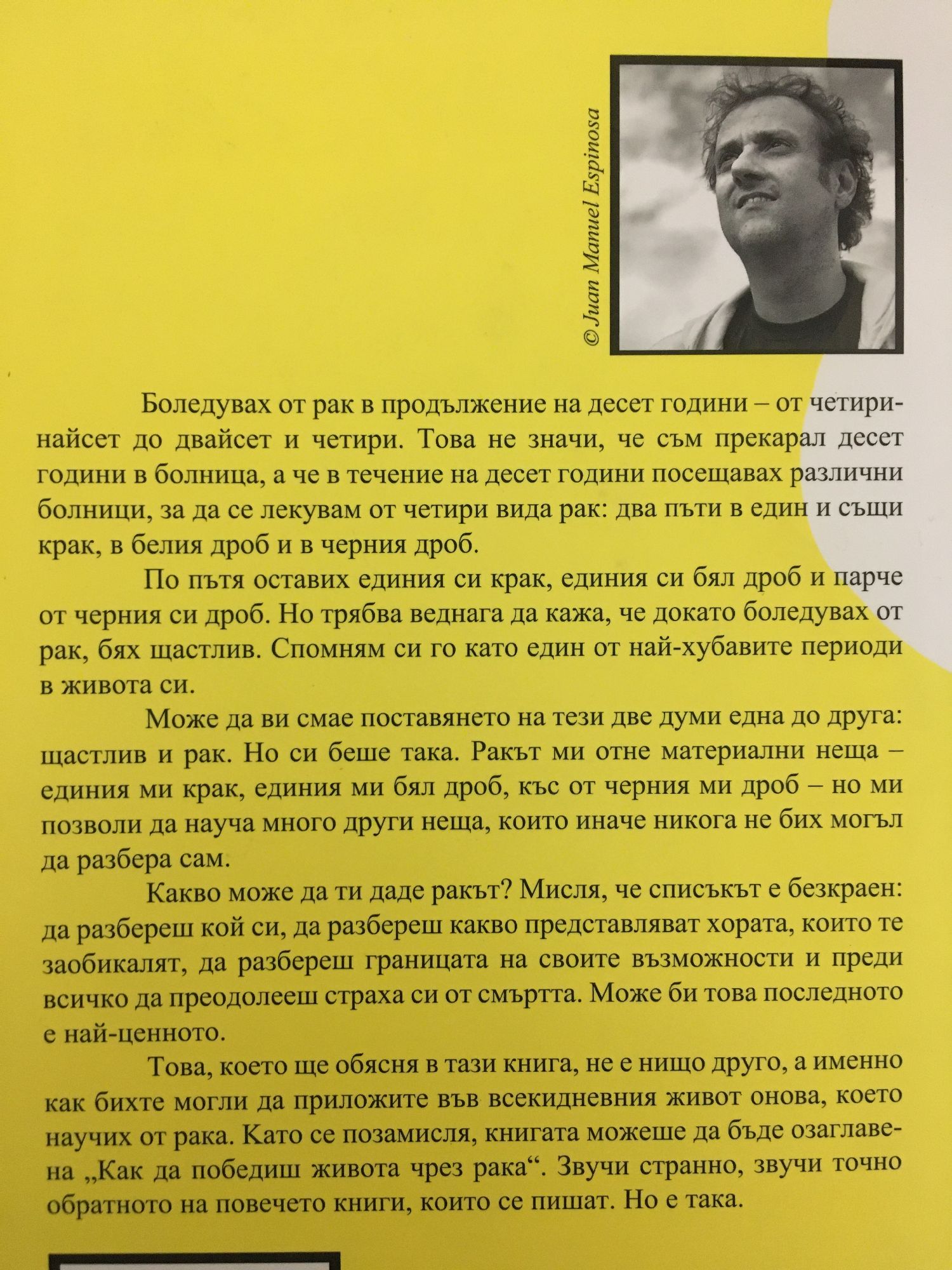 Боледувах от рак в продължение на десет години - от четиринайсет до двайсет и четири. Това не значи, че съм прекарал десет години в болница, а че в течение на десет години посещавах различни болници, за да се лекувам от четири вида рак: два пъти в един и същи крак, в белия дроб и в черния дроб. По пътя оставих единия си крак, единия си бял дроб и парче от черния си дроб. Но трябва веднага да кажа, че докато боледувах от рак, бях щастлив. Спомням си го като един от най-хубавите периоди в живота си. Може да ви смае поставянето на тези две думи една до друга: щастлив и рак. Но си беше така. Ракът ми отне материални неща - единия ми крак, единия ми бял дроб, къс от черния ми дроб - но ми позволи да науча много други неща, които иначе никога не бих могъл да разбера сам. Какво може да ти даде ракът? Мисля, че списъкът е безкраен: да разбереш кой си, да разбереш какво представляват хората, които те заобикалят, да разбереш границата на своите възможности и преди всичко да преодолееш страха си от смъртта. Може би това последното е най-ценното. Това, което ще обясня в тази книга, не е нищо друго, а именно как бихте могли да приложите във всекидневния живот онова, което научих от рака. Като се позамисля, книгата можеше да бъде озаглавена "Как да победиш живота чрез рака". Звучи странно, звучи точно обратното на повечето книги, които се пишат. Но е така.