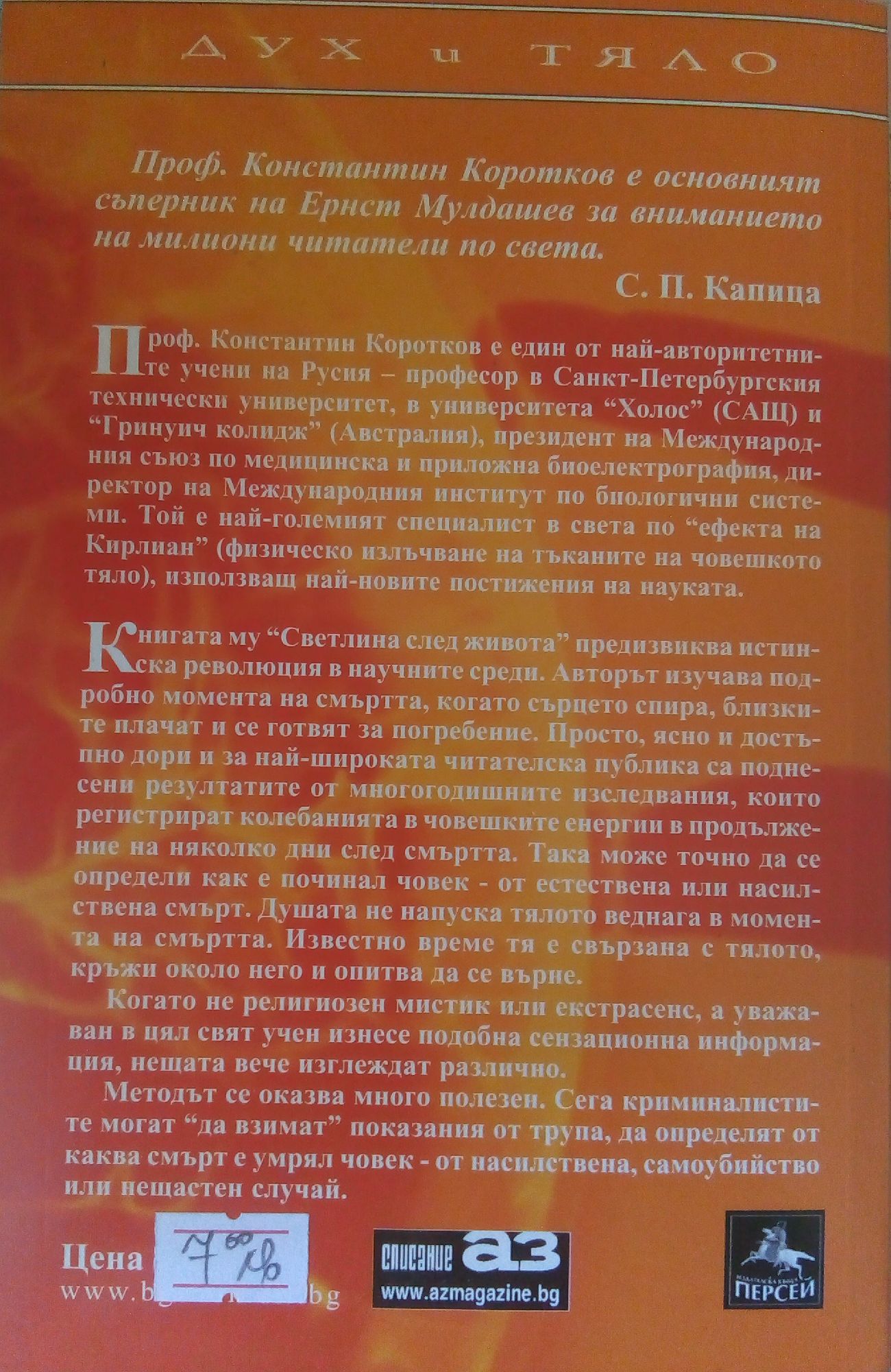 Научни свидетелства, че смъртта не превръща живото мислещо същество в прах, във вкочанена материя, а е процес на разделяне на безсмъртната душа с тленното тяло. Книгата на Константин Коротков "Светлина след живота" предизвиква истинска революция в научните среди. Авторът изучава подробно момента на смъртта, когато сърцето спира, близките плачат и се готвят за погребение. Просто, ясно и достъпно дори и за най-широката читателска публика са поднесени резултатите от многогодишните изследвания, които регистрират колебанията в човешките енергии в продължение на няколко дни след смъртта. Така може точно да се определи от как е починал човек - от естествена или насилствена смърт. Душата не напуска тялото веднага в момента на смъртта. Известно време тя е свързана с тялото, кръжи около него и проверява дали не би могла да се върне. Когато не религиозен мистик или екстрасенс, а уважаван в цял свят учен изнесе подобна сензационна информация, нещата вече изглеждат различно. Методът се оказва много полезен. Криминалистите вече могат "да взимат" показания от трупа, да определят от каква смърт е умрял човек - от насилствена, самоубийство или нещастен случай.