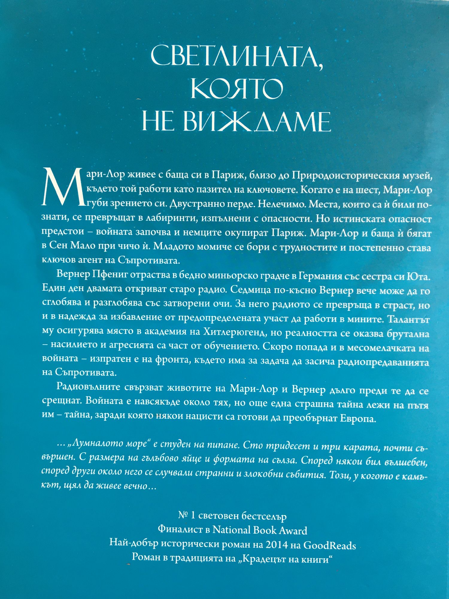 Мари-Лор живее с баща си в Париж, близо до Националния природо-исторически музей, където той работи като главен ключар. Когато е на шест, Мари-Лор губи зрението си, а познатият й свят се превръща в тайнствен лабиринт, изпълнен с опасности. За да й помогне, баща й измайсторява миниатюрно копие на квартала и я кара да наизусти пътищата около дома им. Скоро обаче нацистите окупират френската столица и двамата бягат в красивия крайбрежен град Сен Мало, където намират убежище в къщата на свой тайнствен роднина, която става и гнездо на Съпротивата. Вернер Пфениг отраства в сиропиталище в бедно миньорско градче в Германия. Един ден той и сестра му Юта откриват старо радио. Седмица по-късно Вернер вече може да го сглобява и разглобява със затворени очи. Радиотехниката се превръща в негова страст, но и в надежда за избавление от предопределената участ да работи в мините. Вместо това талантът му го обрича на изпълнено с насилие обучение в елитна нацистка академия, а след това е изпратен на фронта, за да засича вражески радиопредавания. Мари-Лор и Вернер не се познават, но радиовълните отдавна са свързали животите им и е въпрос на време да се срещнат. А в сърцевината на тяхната страшна приказка лежи още една тайна. Бащата на Мари-Лор е спасил от падналия Париж не само дъщеря си, а и най-ценния диамант на света, най-свято пазеното притежание на музея, обгърнато в легенди за вековно проклятие. И един настървен и жесток нацист е готов да преобърне Европа, но да го открие. В обречения на разруха Сен Мало се пресичат пътищата на тези, които не виждат светлината. За да изгрее новият ден на изкуплението.