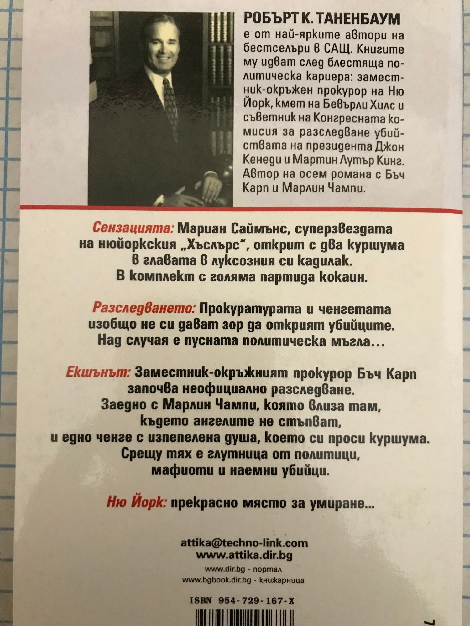 РОБЪРТ К. ТАНЕНБАУМ е от най-ярките автори на бестселъри в САЩ. Книгите му идват след блестяща политическа кариера: заместник-окръжен прокурор на Ню Йорк, кмет на Бевърли Хилс и съветник на Конгресната комисия за разследване убийствата на президента Джон Кенеди и Мартин Лутър Кинг. Автор на осем романа с Бъч Карп и Марлин Чампи. Сензацията: Мариан Саймънс, суперзвездата на нюйоркския „Хъслърс", открит с два куршума в главата в луксозния си кадилак. В комплект с голяма партида кокаин. Разследването: Прокуратурата и ченгетата изобщо не си дават зор да открият убийците. Над случая е пусната политическа мъгла... Екшънът: Заместник-окръжният прокурор Бъч Карп започва неофициално разследване. Заедно с Марлин Чампи, която влиза там, където ангелите не стъпват, и едно ченге с изпепелена душа, което си проси куршума. Срещу тях е глутница от политици, мафиоти и наемни убийци. Ню Йорк: прекрасно място за умиране...