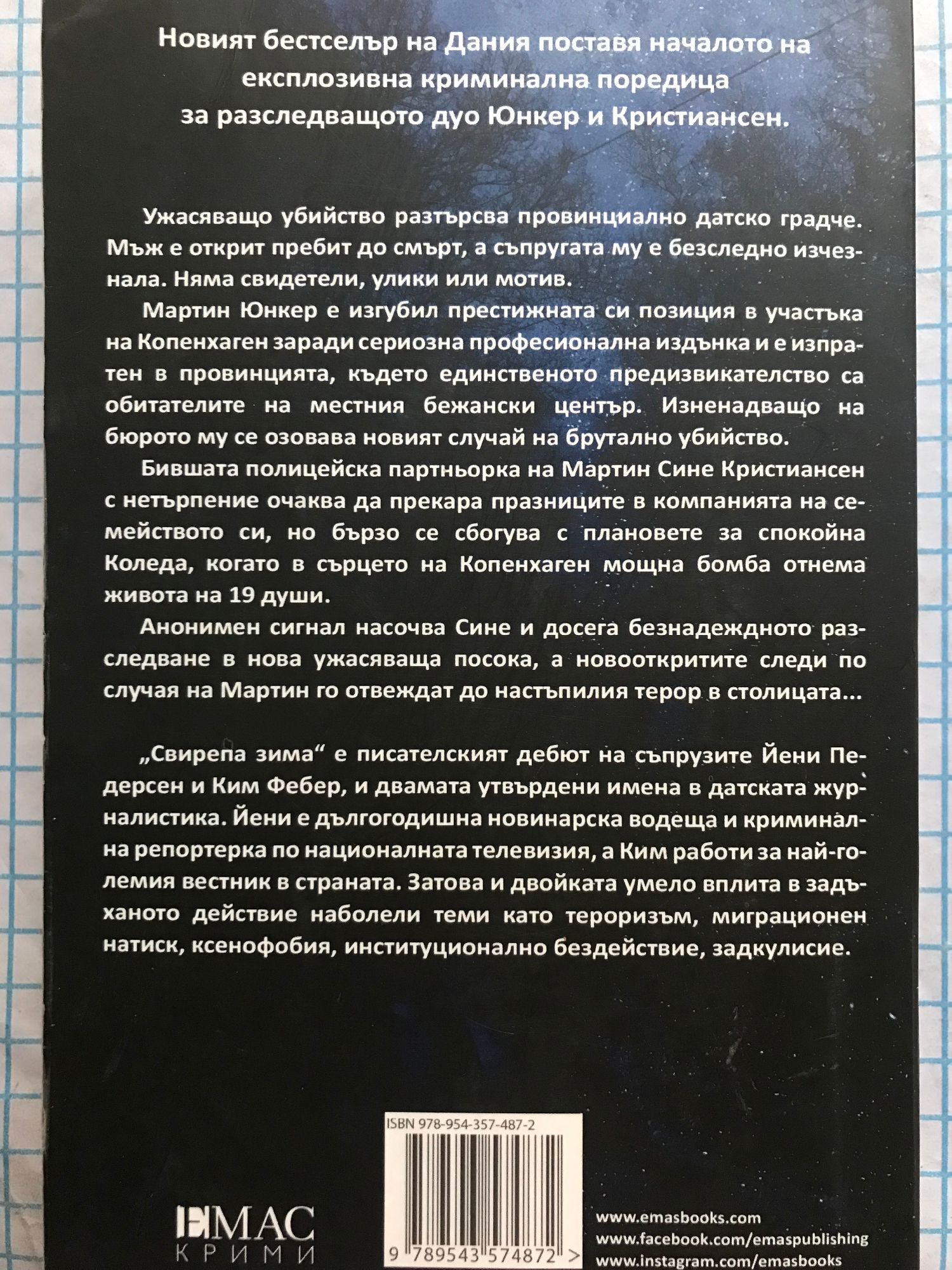 Новият бестселър на Дания поставя началото на експлозивна криминална поредица за разследващото дуо Юнкер и Кристиансен. Ужасяващо убийство разтърсва провинциално датско градче. Мъж е открит пребит до смърт, а съпругата му е безследно изчезнала. Няма свидетели, улики или мотив. Мартин Юнкер е изгубил престижната си позиция в участъка на Копенхаген заради сериозна професионална издънка и е изпратен в провинцията, където единственото предизвикателство са обитателите на местния бежански център. Изненадващо на бюрото му се озовава новият случай на брутално убийство. Бившата полицейска партньорка на Мартин Сине Кристиансен с нетърпение очаква да прекара празниците в компанията на семейството си, но бързо се сбогува с плановете за спокойна Коледа, когато в сърцето на Копенхаген мощна бомба отнема живота на 19 души. Анонимен сигнал насочва Сине и досега безнадеждното разследване в нова ужасяваща посока, а новооткритите следи по случая на Мартин го отвеждат до настъпилия терор в столицата... „Свирепа зима“ е писателският дебют на съпрузите Йени Педерсен и Ким Фебер, и двамата утвърдени имена в датската журналистика. Йени е дългогодишна новинарска водеща и криминална репортерка по националната телевизия, а Ким работи за най-големия вестник в страната. Затова и двойката умело вплита в задъханото действие наболели теми като тероризъм, миграционен натиск, ксенофобия, институционално бездействие, задкулисие.