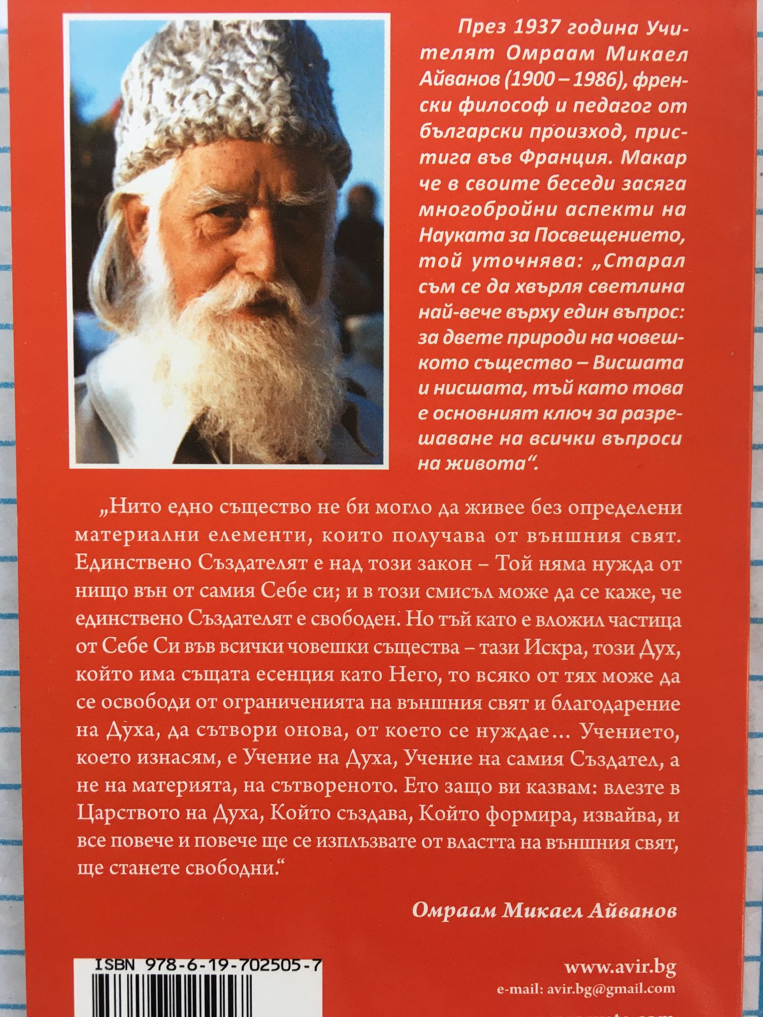 "Нито едно същество не би могло да живее без определени материални елементи, които получава от външния свят. Единствено Създателят е над този закон - Той няма нужда от нищо вън от самия Себе си, и в този смисъл може да се каже, че единствено Създателят е свободен. Но тъй като е вложил частица от Себе си във всички човешки същества - тази искра, този Дух, който има същата есенция като Него, то всяко от тях може да се освободи от ограниченията на външния свят и благодарение на Духа, да сътвори онова, от което се нуждае... Учението, което изнасям, е учение на Духа, учение на самия Създател, а не на материята, на сътвореното. Ето защо ви казвам: влезте в Царството на Духа, който създава, който формира, извайва, и все повече и повече ще се изплъзвате от властта на външния свят, ще станете свободни."