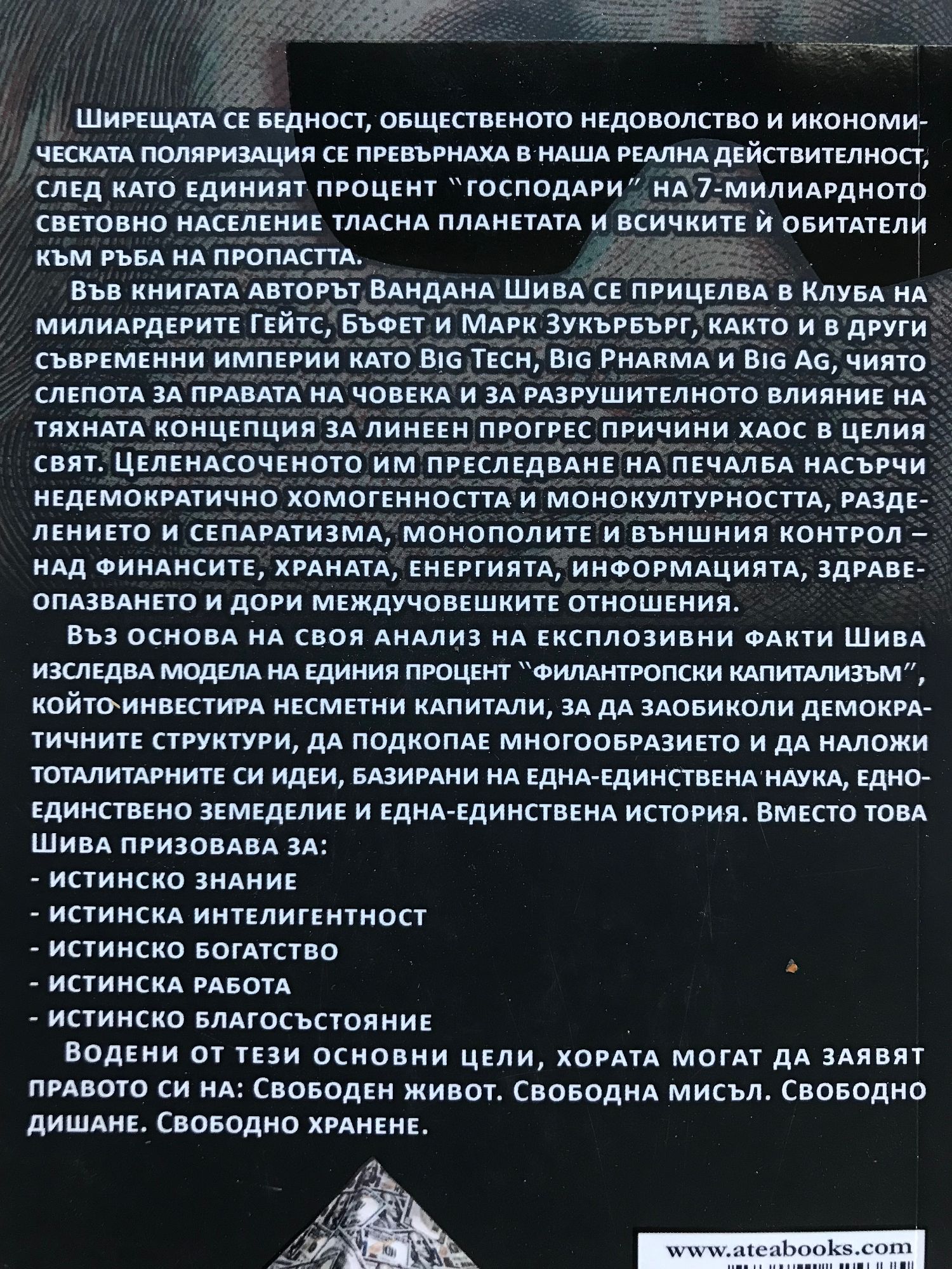 Ширещата се бедност, общественото недоволство и икономическата поляризация се превърнаха в наша реална действителност, след като единият процент господари на 7-милиардното световно население тласна планетата и всичките ѝ обитатели към ръба на пропастта. Във книгата авторът Вандана Шива се прицелва в Клуба на милиардерите Гейтс, Бъфет и Марк Зукърбърг, както и в други съвременни империи като Big Tech, Big Pharma и Big Ag, чиято слепота за правата на човека и за разрушителното влияние на тяхната концепция за линеен прогрес причини хаос в целия свят. Целенасоченото им преследване на печалба насърчи недемократично хомогенността и монокултурността, разделението и сепаратизма, монополите и външния контрол - над финансите, храната, енергията, информацията, здравеопазването и дори междучовешките отношения. Въз основа на своя анализ на експлозивни факти Шива изследва модела на единия процент филантропски капитализъм, който инвестира несметни капитали, за да заобиколи демократичните структури, да подкопае многообразието и да наложи тоталитарните си идеи, базирани на една-единствена наука, едно-единствено земеделие и една-единствена история. Вместо това Шива призовава за: истинско знание; истинска интелигентност; истинско богатство - истинска работа; истинско благосъстояние. Водени от тези основни цели, хората могат да заявят правото си на: Свободен живот. Свободна мисъл. Свободно дишане. Свободно хранене.