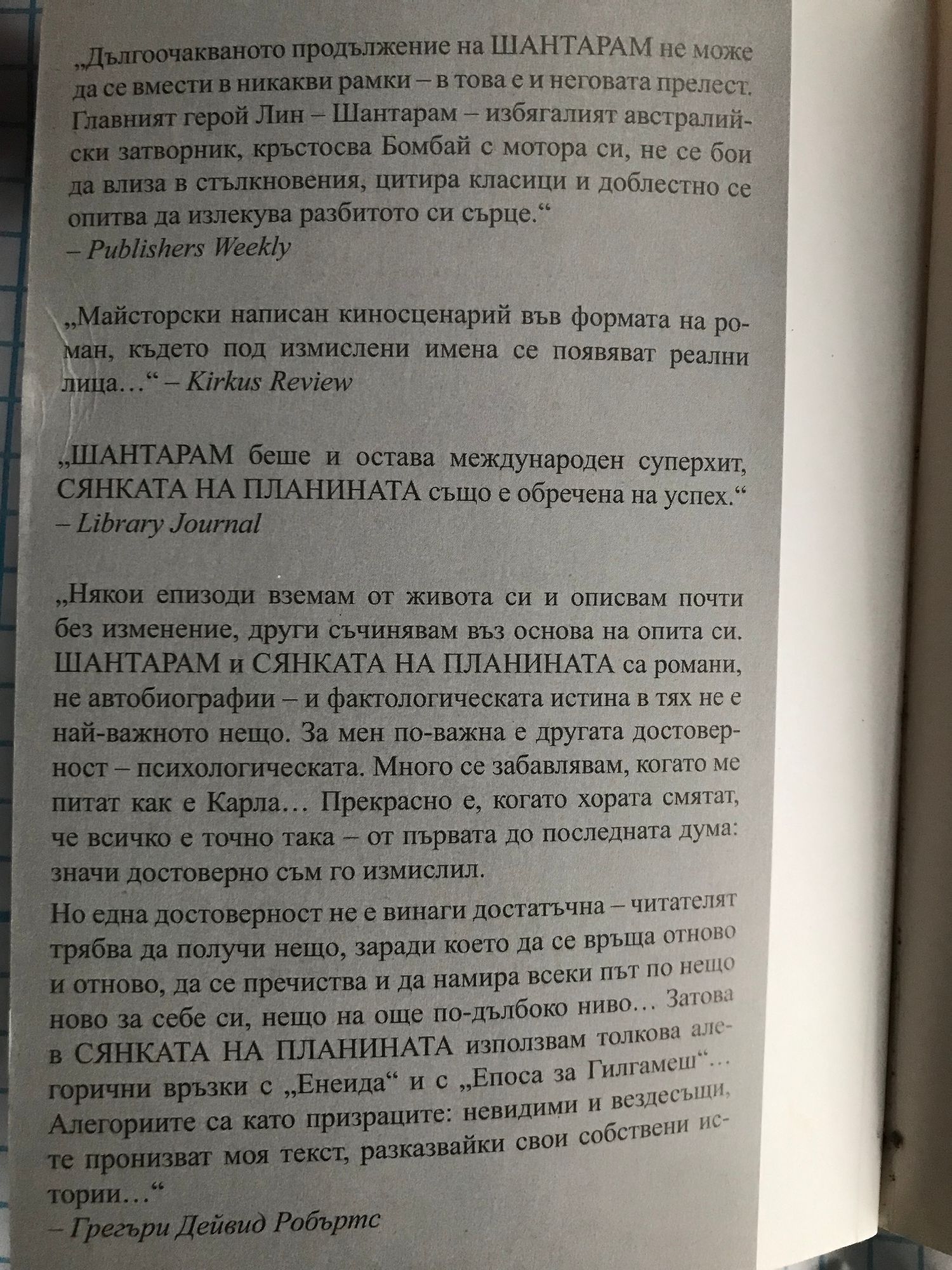 Дългоочакваното продължение на "Шантарам" не може да се вмести в никакви рамки - в това е и неговата прелест. Главният герой Лин - Шантарам - избягалият австралийски затворник, кръстосва Бомбай с мотора си, не се бои да влиза в стълкновения, цитира класици и доблестно се опитва да излекува разбитото си сърце. Майсторски написан киносценарий във формата на роман, където под измислени имена се появяват реални лица...