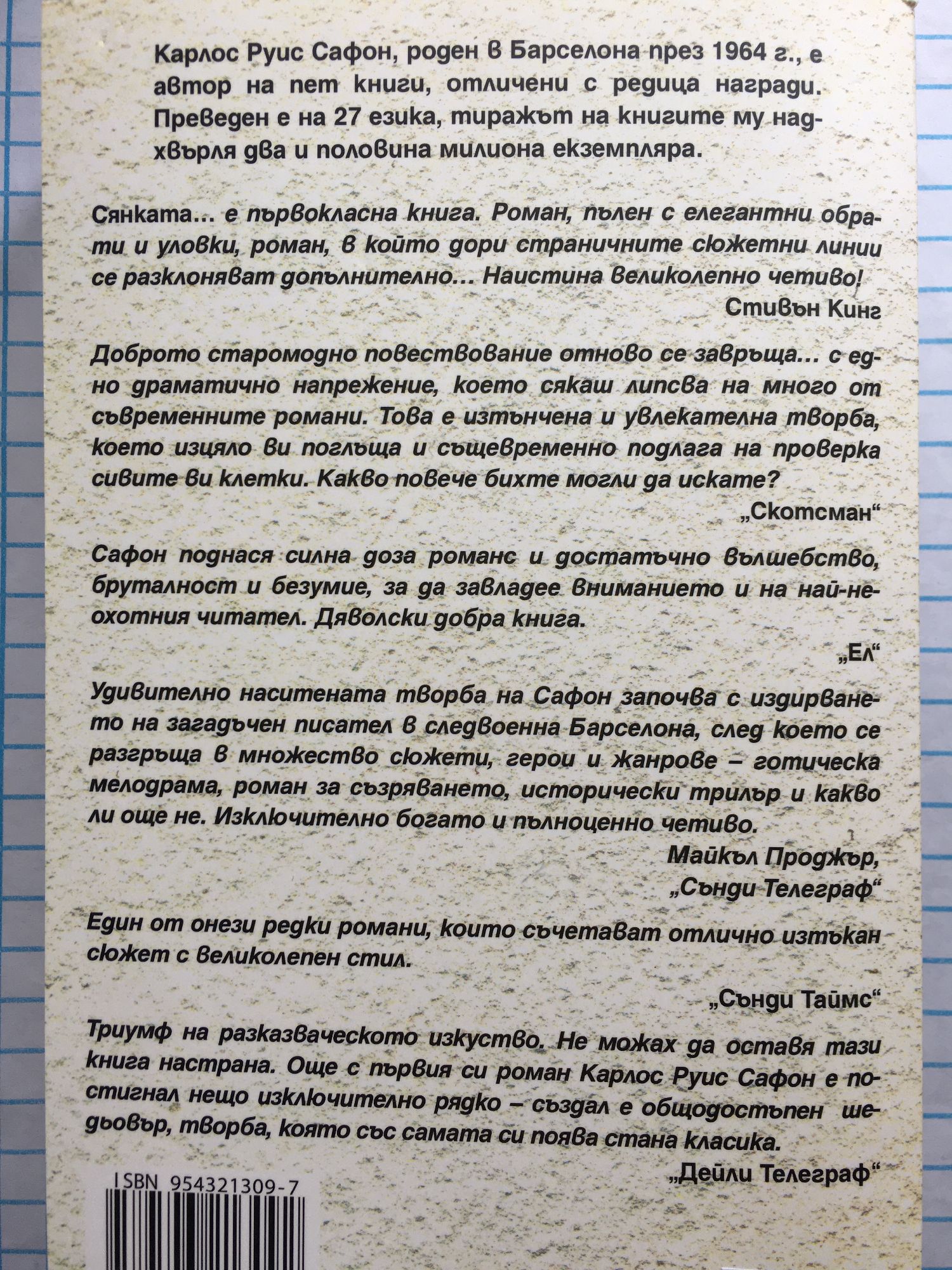 “Сянката…” е първокласна книга. Роман, пълен с елегантни обрати и уловки, роман, в който дори страничните сюжетни линии се разклоняват допълнително… Наистина великолепно четиво! Стивън Кинг Доброто старомодно повествование отново се завръща… с едно драматично напрежение, което сякаш липсва на много от съвременните романи. Това е изтънчена и увлекателна творба, което изцяло ви поглъща и същевременно подлага на проверка сивите ви клетки. Какво повече бихте могли да искате? Скотсман Сафон поднася силна доза романс и достатъчно вълшебство, бруталност и безумие, за да завладее вниманието и на най-неохотния читател. Дяволски добра книга! Ел Удивително наситената творба на Сафон започва с издирването на загадъчен писател в следвоенна Барселона, след което се разгръща в множество сюжети, герои и жанрове - готическа мелодрама, роман за съзряването, исторически трилър и какво ли още не. Изключително богато и пълноценно четиво. Майкъл Проджър, Сънди Телеграф Триумф на разказваческото изкуство. Не можех да оставя тази книга настрана. Още с първия си роман Карлос Руис Сафон е постигнал нещо изключително рядко - създал е общодостъпен шедьовър, творба, която със самата си поява стана класика. Дейли Телеграф Карлос Руис Сафон, роден в Барселона през 1964 г., е автор на пет книги, отличени с редица награди. Преведен е на 27 езика, тиражът на книгите му надхвърля два и половина милиона екземпляра.