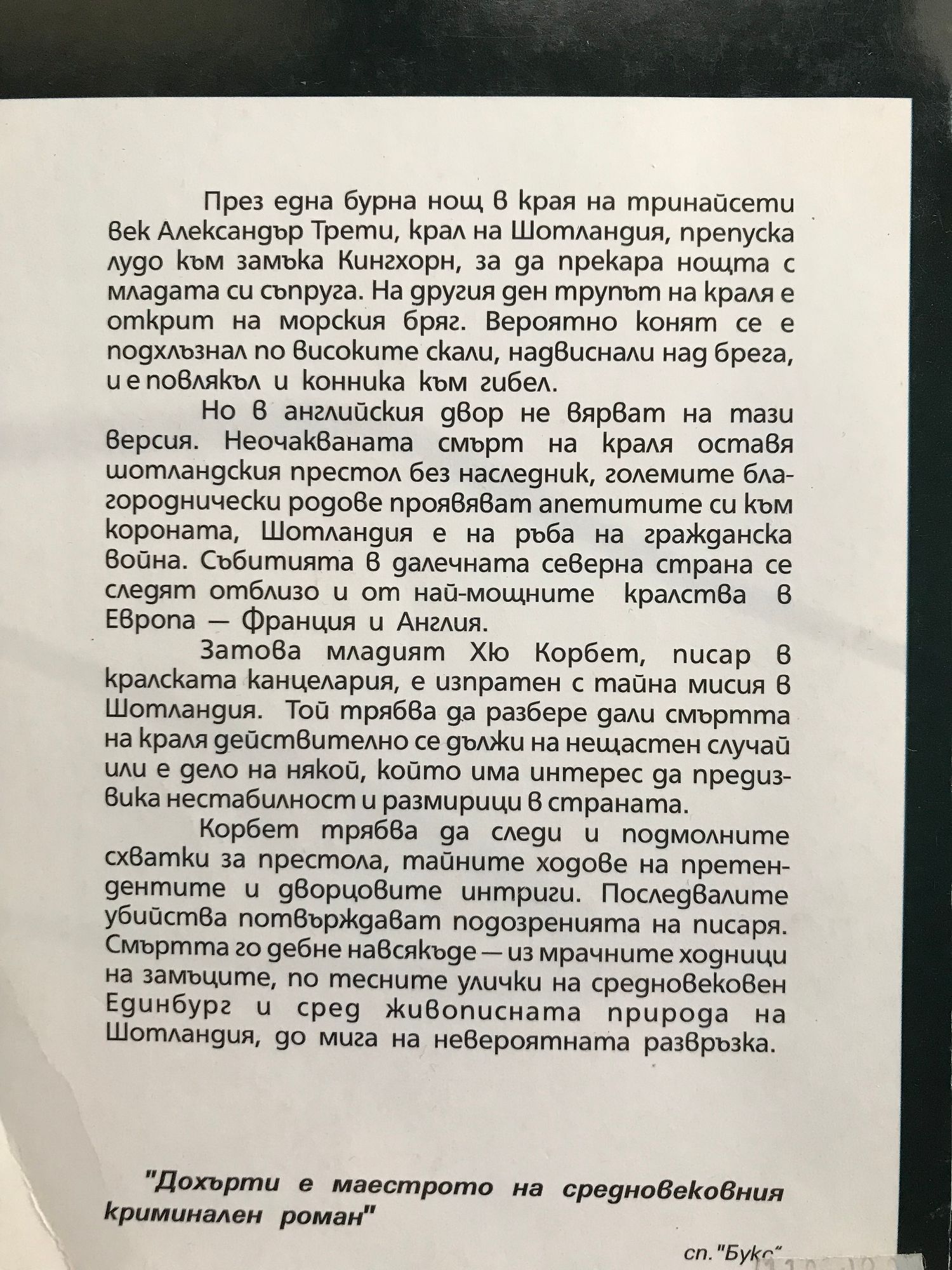 През една бурна нощ в края на тринайсети век Александър Трети, крал на Шотландия, препуска лудо към замъка Кингхорн, за да прекара нощта с младата си съпруга. На другия ден трупът на краля е открит на морски бряг. Вероятно конят се е подхлъзнал по високите скали, надвиснали над брега, и е повлякъл и конника към гибел. Но в английския двор не вярват на тази версия. Неочакваната смърт на краля оставя шотландския престол без наследник, големите благороднически родове проявяват апетитите си към короната, Шотландия е на ръба на гражданска война. Събитията в далечната северна страна се следят отблизо и от най-мощните кралства в Европа - Франция и Англия. Затова младият Хю Корбет, писар в кралската канцелария, е изпратен с тайна мисия в Шотландия. Той трябва да разбере дали смъртта на краля действително се дължи на нещастен случай или е дело на някой, който има интерес да предизвика нестабилност и размирици в страната. Корбет трябва да следи и подмолните схватки за престола, тайните ходове на претендентите и дворцовите интриги. Последвалите убийства потвърждават подозренията на писаря. Смъртта го дебне навсякъде - из мрачните ходници на замъците, по тесните улички на средновековен Единбург и сред живописната природа на Шотландия, до мига на невероятната развръзка.