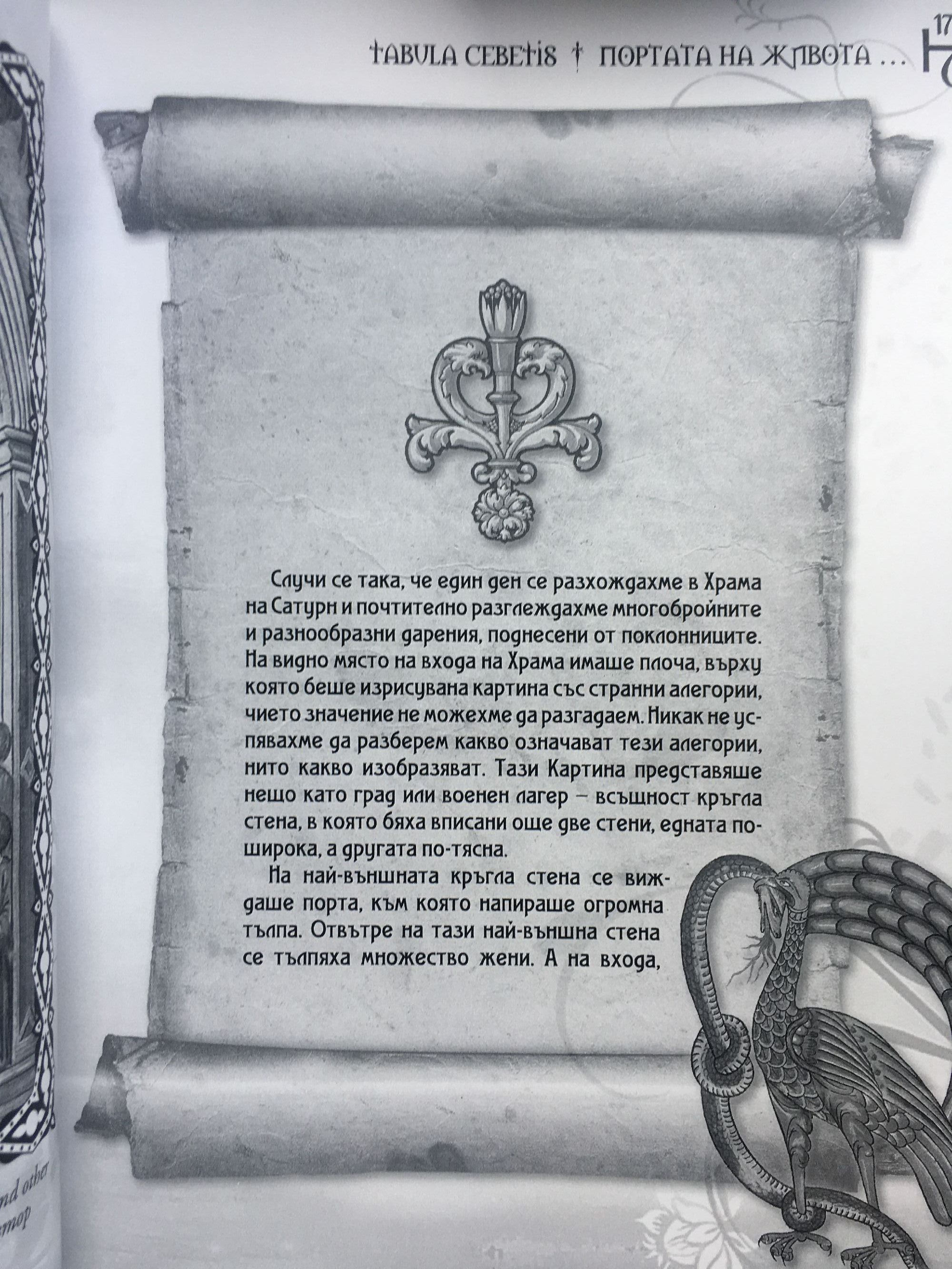 „TABULA CEBETIS“ или „Πιναξ“ („Картина на човешкия живот“) е шедьовър на античната литература, наричан още инициатично произведение, призвано да разкрие на хората пътя към Мъдростта. В продължение на векове, от 5 в. пр. Хр. до 19 в., този странен кратък текст, създаден на кръстопътя на литературните жанрове - филипика, диалог, алегория, ексфрасис и т. н.. - се ползва с огромен успех и е включван в множество наръчници и учебници за обучение на младежи и възрастни в принципите на моралното поведение. За съжаление от началото на 20 в. текстът-алегория е почти забравен и е предмет за изучаване единствено на изследователите на античната литература - тъжен факт, тъй като увлеченото от техническата революция и процес на глобализация човечество би могло да почерпи от него дълбоката философска мъдрост за смисъла на човешкия живот. Настоящият превод, дело на Мария Арабаджиева, е направен от френски по книгата на Жил Боало (1631-1669 г.) - „La vie et la philosophie d'Épictète: Avec le Tableau de Cébès“ („Животът и философията на Епиктет и Tabula Cebetis“), 1772 г., и е сравнен с книгите на английски език „The Emperor-Marcus Antonius: his conversation with himself. together with the mythological picture of Cebes the Theban, etc. Tr. into English from the respective originals, by Jeremy Collier“ („Император Марк Аврелий: неговият Разговор със себе си, заедно с митологичната картина на Кебет от Тива, превод от оригинала от Джереми Колие“),1702 г., и „The Greek Pilgrim's progress. Generally known as the Picture, by Kebes. Translated by Kenneth Sylvan Guthrie“ („Пътят на гръцките поклонници, наричан Картина на човешкия живот“, превод на Кенет Силвън Гутри), 1910 г., както и с българското старопечатно издание „Кевита Тивейскаго таблица“ (1850 г.), преведено от старогръцки от Параскев П. Константинович Сливиянина. Изданието е луксозно с твърда подвързия, илюстрирано с картини и гравюри от ценни старинни книги, описващи „Tabula Cebetis“, алегоричната Картина на човешкия живот.