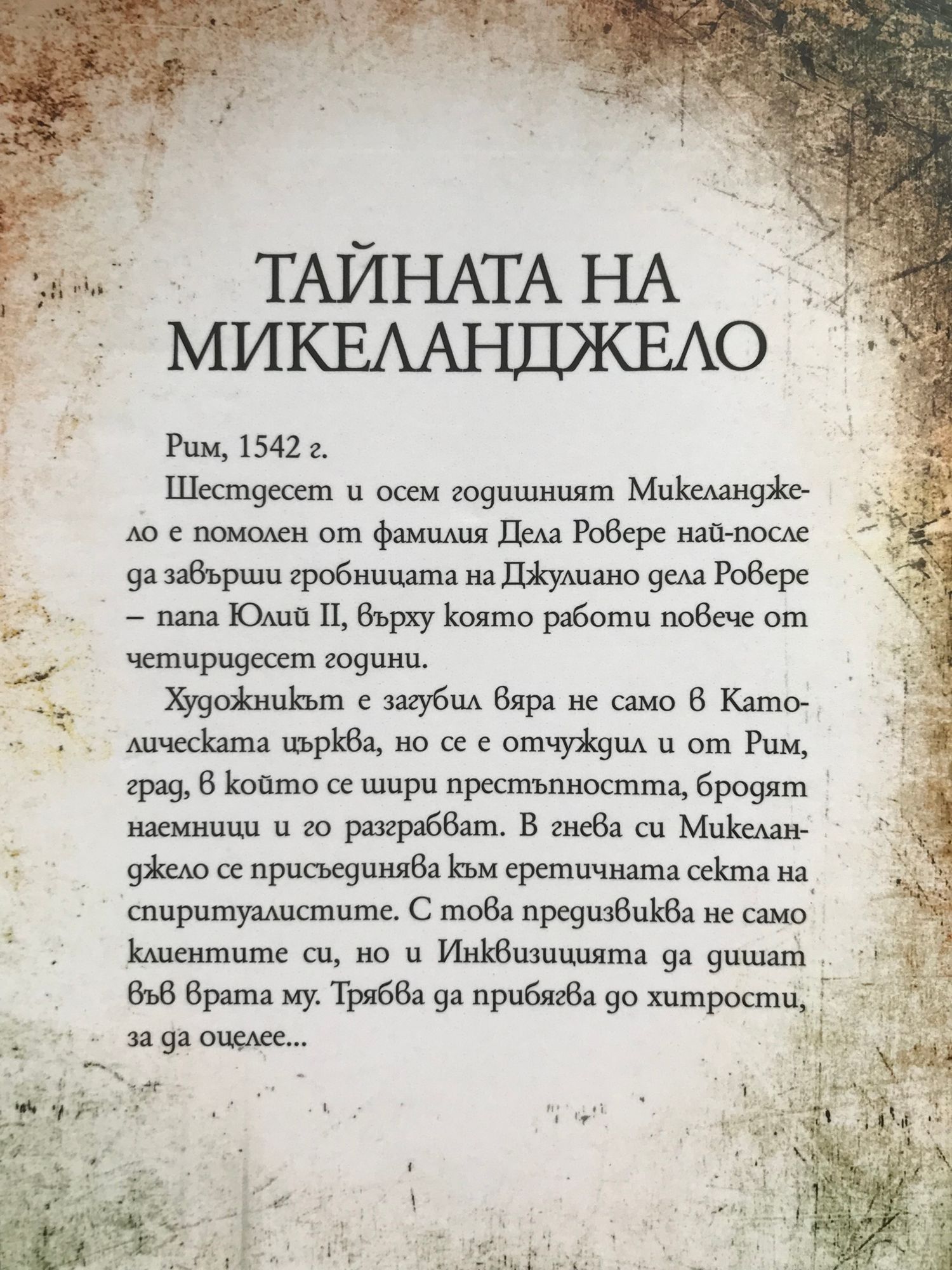 Рим, 1542 г. Шестдесет и осем годишният Микеланджело е помолен от фамилия Дела Робере най-после да завърши гробницата на Джулиано дела Ровере - папа Юлий II, върху която работи повече от четиридесет години. Художникът е загубил вяра не само в Католическата църква, но се е отчуждил и от Рим, град, в който се шири престъпността, бродят наемници и го разграбват. В гнева си Микеланджело се присъединява към еретичната секта на спиритуалистите. С това предизвиква не само клиентите си, но и Инквизицията да дишат във врата му. Трябва да прибягва до хитрости, за да оцелее...