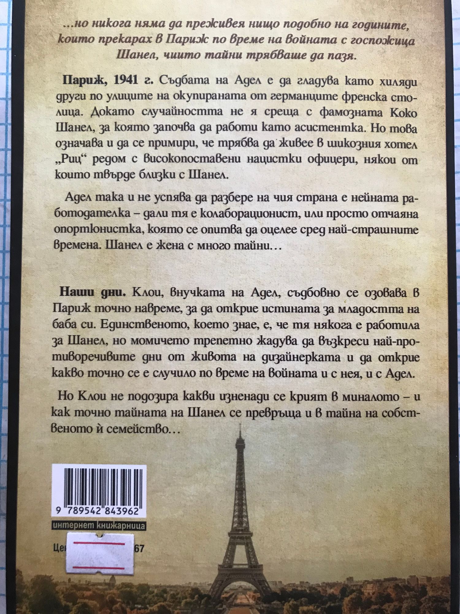 …но никога няма да преживея нищо подобно на годините, които прекарах в Париж по време на войната с госпожица Шанел, чиито тайни трябваше да пазя. Париж, 1941 г. Съдбата на Адел е да гладува като хиляди други по улиците на окупираната от германците френска столица. Докато случайността не я среща с фамозната Коко Шанел, за която започва да работи като асистентка. Но това означава и да се примири, че трябва да живее в шикозния хотел „Риц“ редом с високопоставени нацистки офицери, някои от които твърде близки с Шанел. Адел така и не успява да разбере на чия страна е нейната работодателка – дали тя е колаборационист, или просто отчаяна опортюнистка, която се опитва да оцелее сред най-страшните времена. Шанел е жена с много тайни… Наши дни. Клои, внучката на Адел, съдбовно се озовава в Париж точно навреме, за да открие истината за младостта на баба си. Единственото, което знае, е, че тя някога е работила за Шанел, но момичето трепетно жадува да възкреси най-противоречивите дни от живота на дизайнерката и да открие какво точно се е случило по време на войната и с нея, и с Адел. Но Клои не подозира какви изненади се крият в миналото – и как точно тайната на Шанел се превръща и в тайна на собственото ѝ семейство…