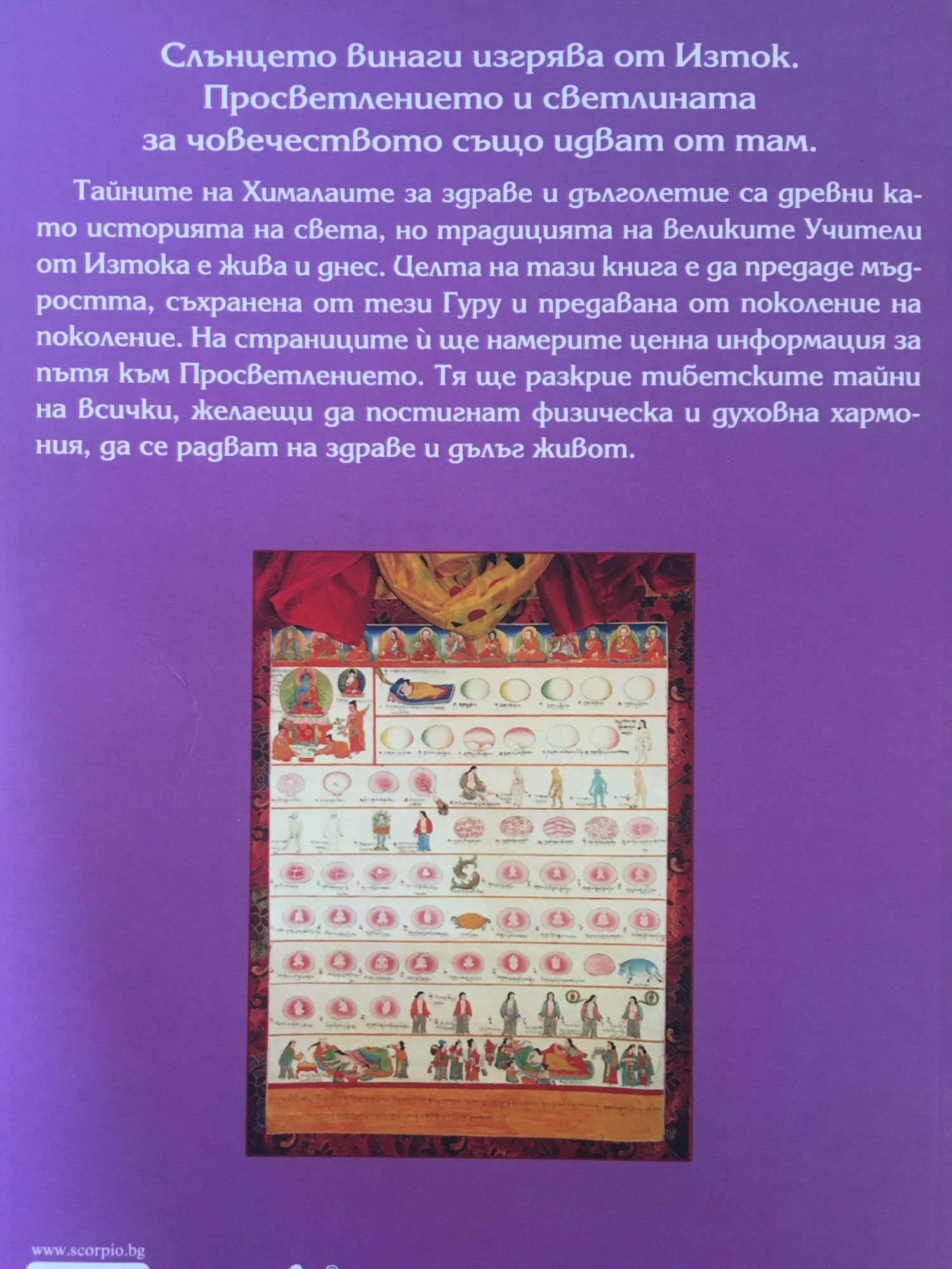 Слънцето винаги изгрява от Изток. Просветлението и светлината за човечеството също идват от там. Тайните на Хималаите за здраве и дълголетие са древни като историята на света, но традицията на великите Учители от Изтока е жива и днес. Целта на тази книга е да предаде мъдростта, съхранена от тези Гуру и предавана от поколение на поколение. На страниците й ще намерите ценна информация за пътя към Просветлението. Тя ще разкрие тибетските тайни на всички, желаещи да постигнат физическа и духовна хармония, да се радват на здраве и дълъг живот.