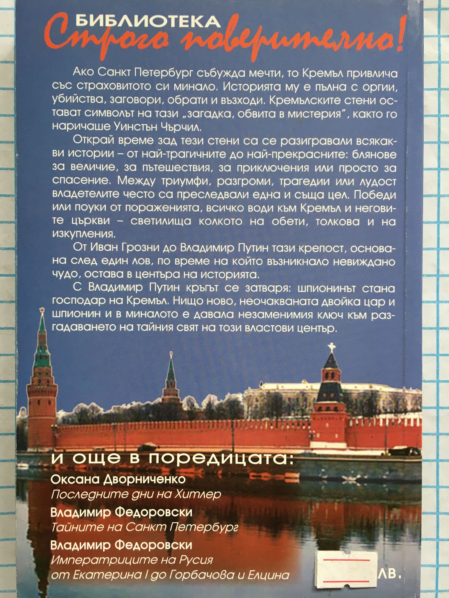 Ако Санкт Петербург събужда мечти, то Кремъл привлича със страховитото си минало. Историята му е пълна с оргии, убийства, заговори, обрати и възходи. Кремълските стени остават символът на тази загадка, обвита в мистерия", както го наричаше Уинстън Чърчил. Открай време зад тези стени са се разигравали всякакви истории - от най-трагичните до най-прекрасните: блянове за величие, за пътешествия, за приключения или просто за спасение. Между триумфи, разгроми, трагедии или лудост владетелите често са преследвали една и съща цел. Победи или поуки от пораженията, всичко води към Кремъл и неговите църкви -- светилища колкото на обети, толкова и на изкупления. От Иван Грозни до Владимир Путин тази крепост, основана след един лов, по време на който възникнало невиждано чудо, остава в центъра на историята. С Владимир Путин кръгът се затваря: шпионинът стана господар на Кремъл. Нищо ново, неочакваната двойка цар и шпионин и в миналото е давала незаменимия ключ към разгадаването на тайния свят на този властови център.