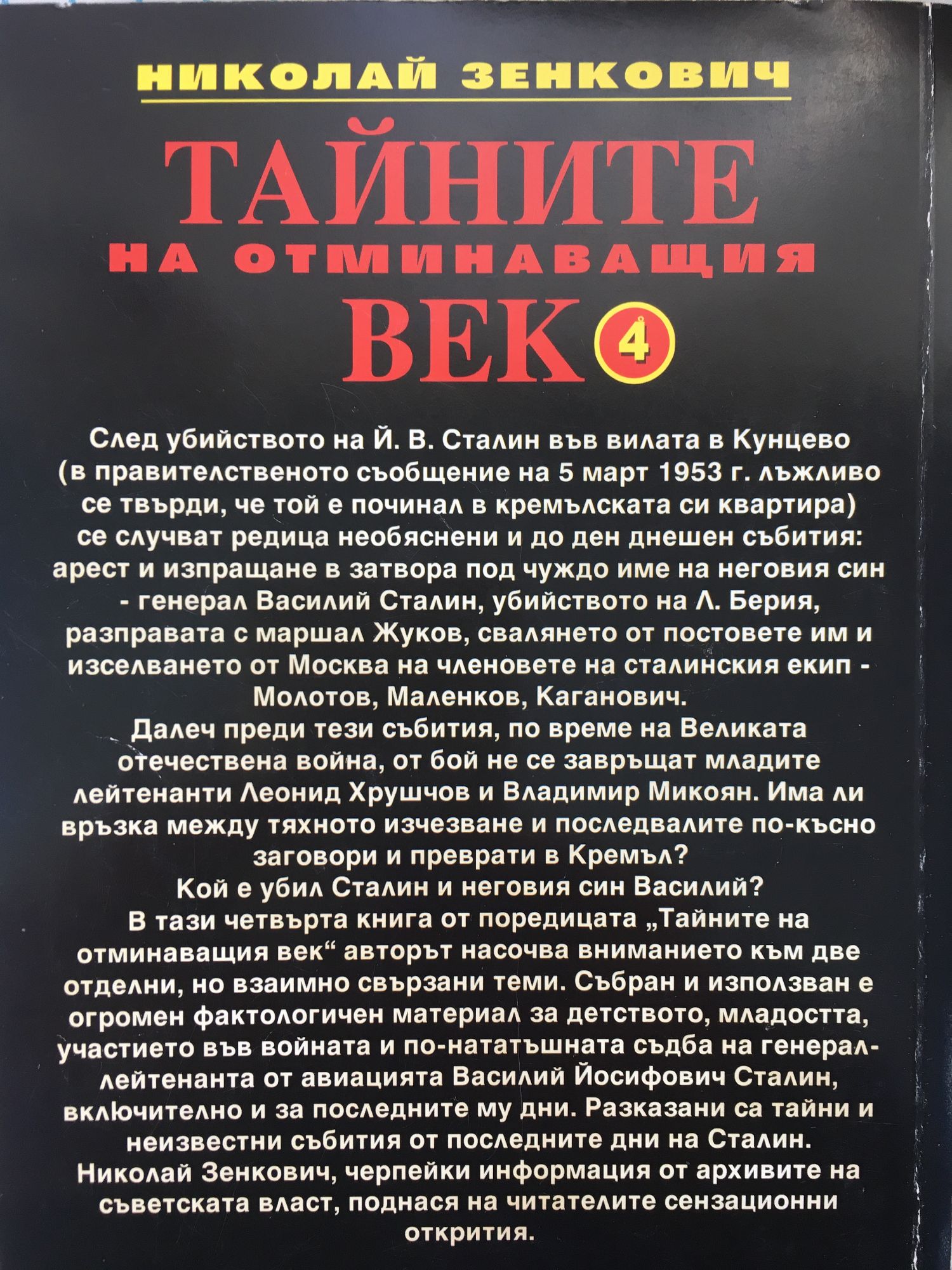 След убийството на Й. В. Сталин във вилата в Кунцево (в правителственото съобщение на 5 март 1953 г. лъжливо се твърди, че той е починал в кремълската си квартира) се случват редица необяснени и до ден днешен събития: арест и изпращане в затвора под чуждо име на неговия син - генерал Василий Сталин, убийството на Л. Берия, разправата с маршал Жуков, свалянето от постовете им и изселването от Москва на членовете на сталинския екип - Молотов, Маленков, Каганович. Далеч преди тези събития, по време на Великата отечествена война, от бой не се завръщат младите лейтенанти Леонид Хрушчов и Владимир Микоян. Има ли връзка между тяхното изчезване и последвалите по-късно заговори и преврати в Кремъл? Кой е убил Сталин и неговия син Василий? В тази четвърта книга от поредицата 'Тайните на отминаващия век' авторът насочва вниманието към две отделни, но взаимно свързани теми. Събран и използван е огромен фактологичен материал за детството, младостта, участието във войната и по-нататъшната съдба на генерал-лейтенанта от авиацията Василий Йосифович Сталин, включително и за последните му дни. Разказани са тайни и неизвестни събития от последните дни на Сталин. Николай Зенкович, черпейки информация от архивите на съветската власт, поднася на читателите сензационни открития.