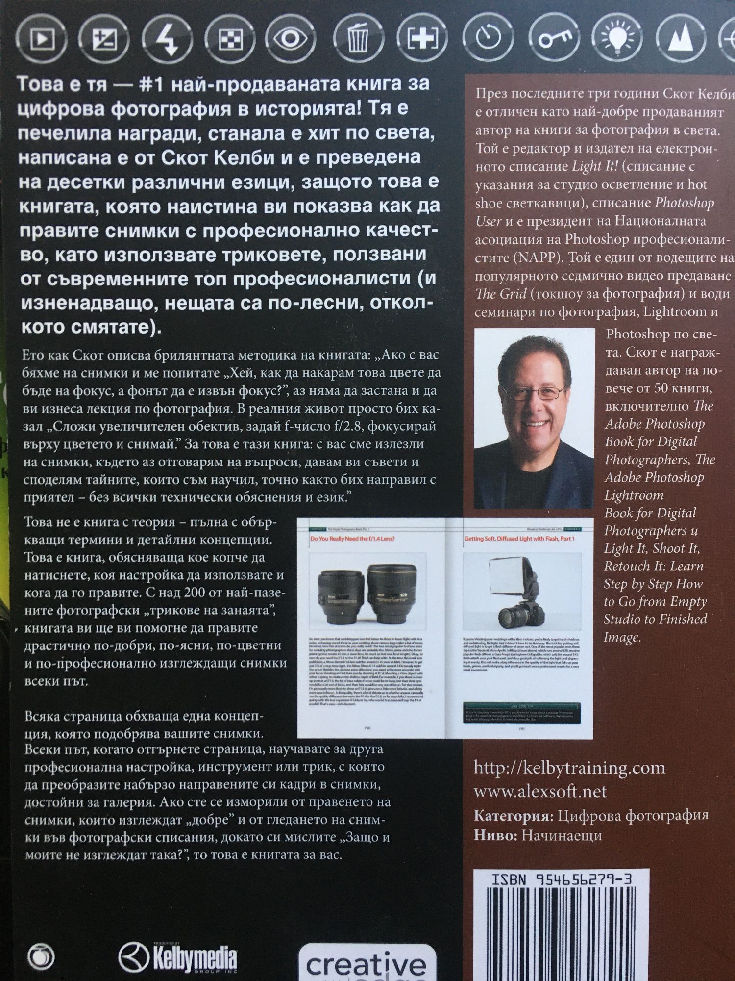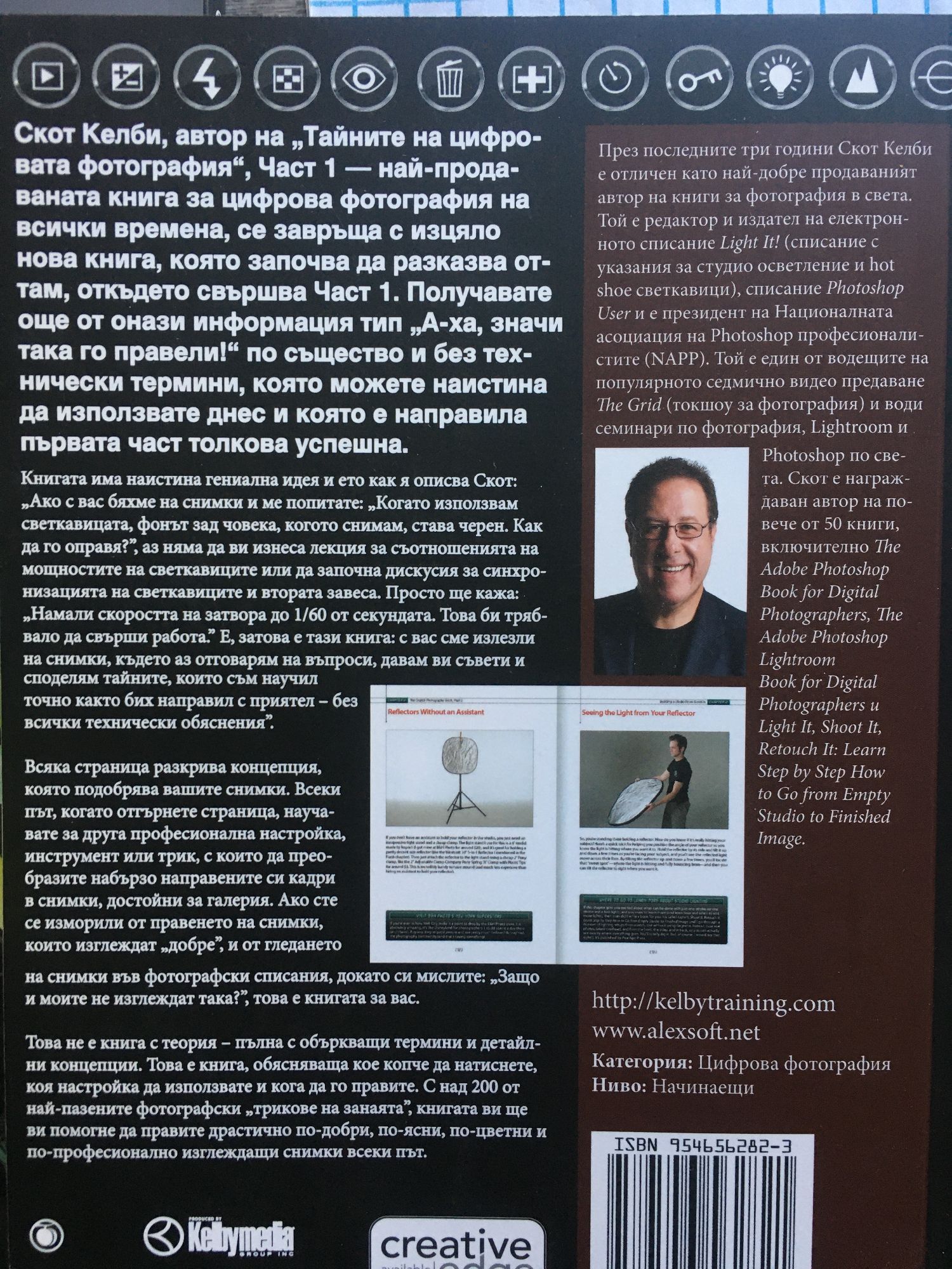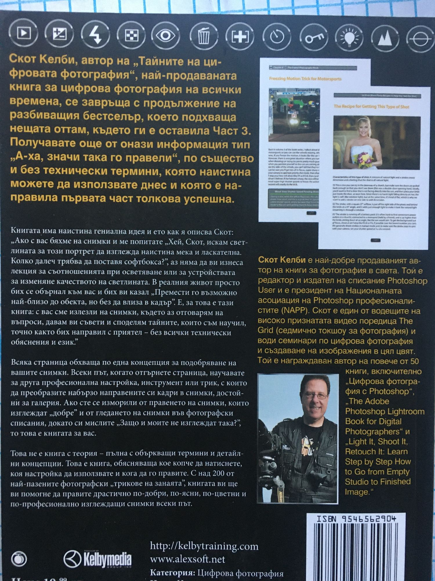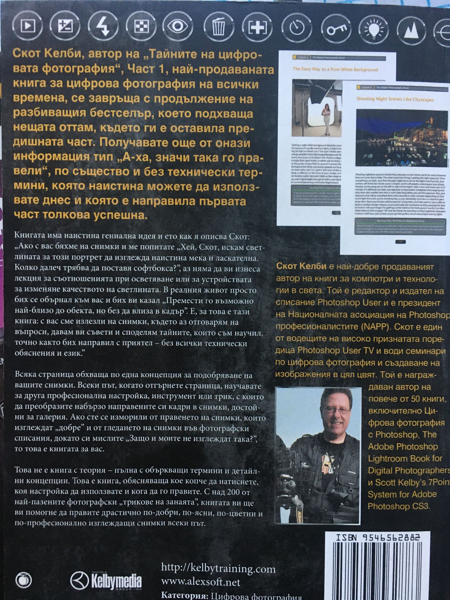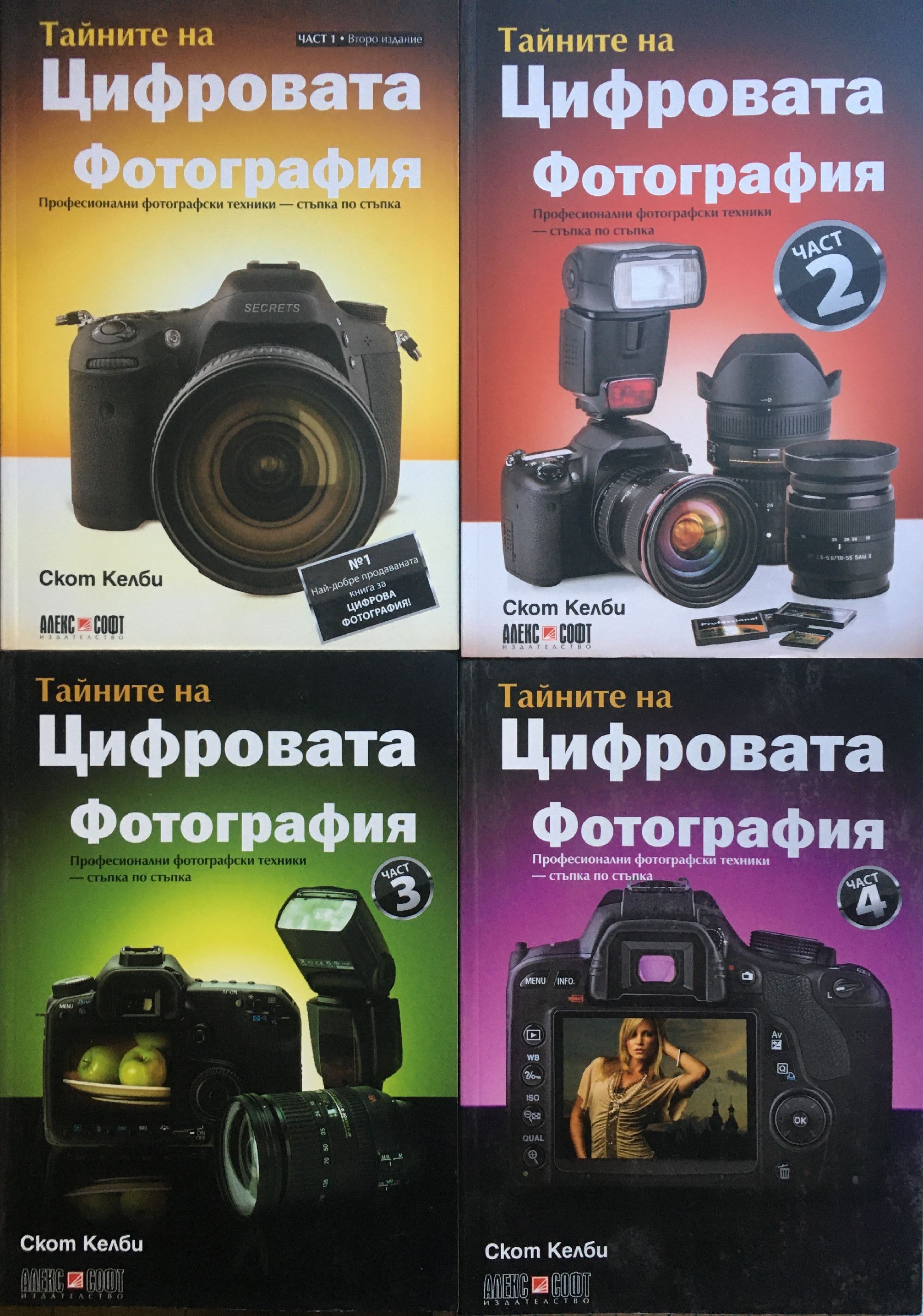 Част 1: Това е тя - №1 най-продаваната книга за цифрова фотография в историята! Тя е печелила награди, станала е хит по света, написана е от Скот Келби и е преведена на десетки различни езици, защото това е книгата, която наистина ви показва как да правите снимки с професионално качество, като използвате триковете, ползвани от съвременните топ професионалисти (и изненадващо, нещата са по-лесни, отколкото смятате). Ето как Скот описва брилянтната методика на книгата: „Ако с вас бяхме на снимки и ме попитате „Хей, как да накарам това цвете да бъде на фокус, а фонът да е извън фокус?”, аз няма да застана и да ви изнеса лекция по фотография. В реалния живот просто бих казал „Сложи увеличителен обектив, задай f-число f/2.8, фокусирай върху цветето и снимай.” За това е тази книга: с вас сме излезли на снимки, където аз отговарям на въпроси, давам ви съвети и споделям тайните, които съм научил, точно както бих направил с приятел – без всички технически обяснения и език.” Това не е книга с теория – пълна с объркващи термини и детайлни концепции. Това е книга, обясняваща кое копче да натиснете, коя настройка да използвате и кога да го правите. С над 200 от най-пазените фотографски „трикове на занаята”, книгата ви ще ви помогне да правите драстично по-добри, по-ясни, по-цветни и по-професионално изглеждащи снимки всеки път. Всяка страница обхваща една концепция, която подобрява вашите снимки. Всеки път, когато отгърнете страница, научавате за друга професионална настройка, инструмент или трик, с които да преобразите набързо направените си кадри в снимки, достойни за галерия. Ако сте се изморили от правенето на снимки, които изглеждат „добре” и от гледането на снимки във фотографски списания, докато си мислите „Защо и моите не изглеждат така?”, то това е книгата за вас. Част 2: Скот Келби, автор на "Тайните на цифровата фотография - част 1" - най-продаваната книга за цифрова фотография на всички времена, се завръща с изцяло нова книга, която започва да разказва оттам, откъдето свършва първата част. Получавате още от онази информация тип "А-ха, значи така го правели!" по същество и без технически термини, която можете наистина да използвате днес и която е направила първата част толкова успешна.Книгата има наистина гениална идея и ето как я описва Скот: "Ако с вас бяхме на снимки и ме попитате: "Когато използвам светкавицата, фонът зад човека, когото снимам, става черен. Как да го оправя?", аз няма да ви изнеса лекция за съотношенията на мощностите на светкавиците или да започна дискусия за синхронизацията на светкавиците и втората завеса. Просто ще кажа: "Намали скоростта на затвора до 1/60 от секундата. Това би трябвало да свърши работа". Е, затова е тази книга: с вас сме излезли на снимки, където аз отговарям на въпроси, давам ви съвети и споделям тайните, които съм научил точно както бих направил с приятел – без всички технически обяснения".Всяка страница разкрива концепция, която подобрява вашите снимки. Всеки път, когато отгърнете страница, научавате за друга професионална настройка, инструмент или трик, с които да преобразите набързо направените си кадри в снимки, достойни за галерия. Ако сте се изморили от правенето на снимки, които изглеждат "добре", и от гледането на снимки във фотографски списания, докато си мислите: "Защо и моите не изглеждат така?", това е книгата 