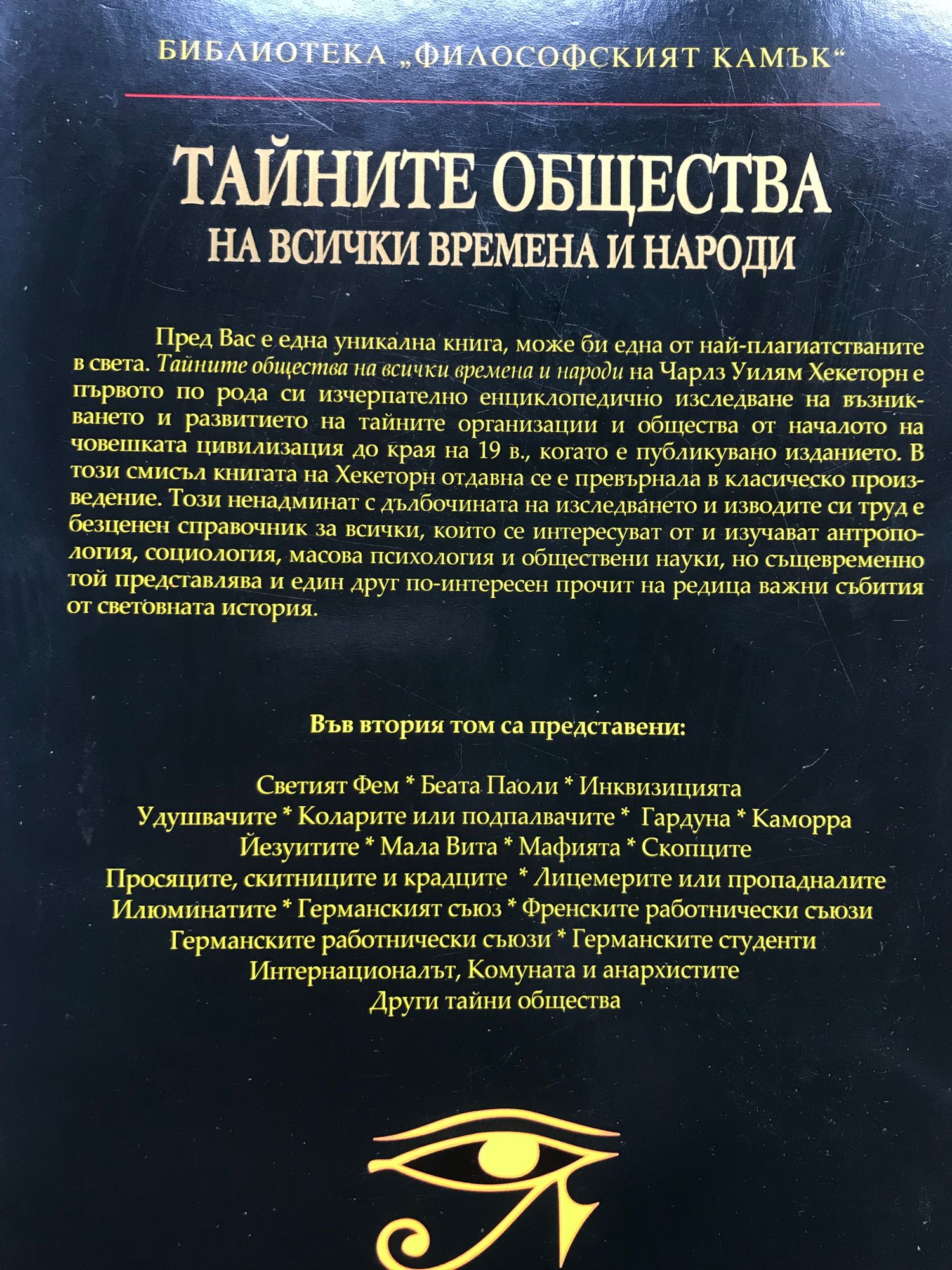 Пред вас е една уникална книга, може би една от най-плагиатстваните книги в света. "Тайните общества на всички времена и народи" на Чарлз Уилям Хекеторн е първото по рода си изчерпателно енциклопедично изследване на възникването и развитието на тайните организации и общества от началото на човешката цивилизация до края на 19 в., когато е публикувано изданието. В този смисъл книгата на Хекеторн отдавна се е превърнала в класическо произведение. Този ненадминат с дълбочината на изследването и изводите си труд е безценен справочник за всички, които се интересуват от и изучават антропология, социология, масова психология и обществени науки, но същевременно той представлява и един друг по-интересен прочит на редица важни събития в световната история.