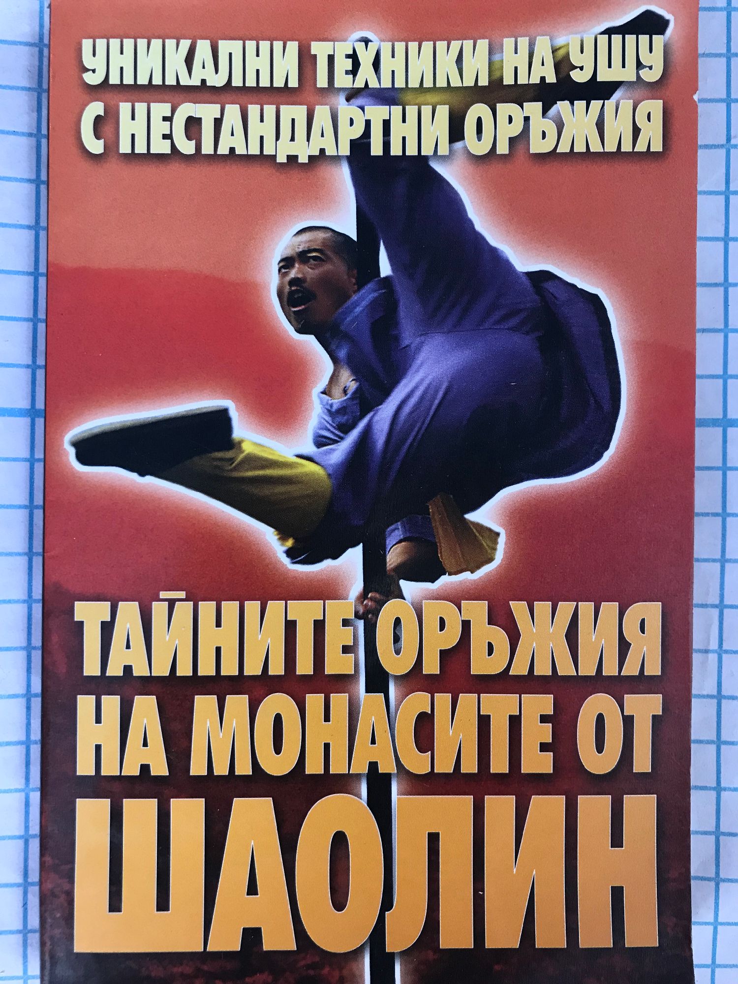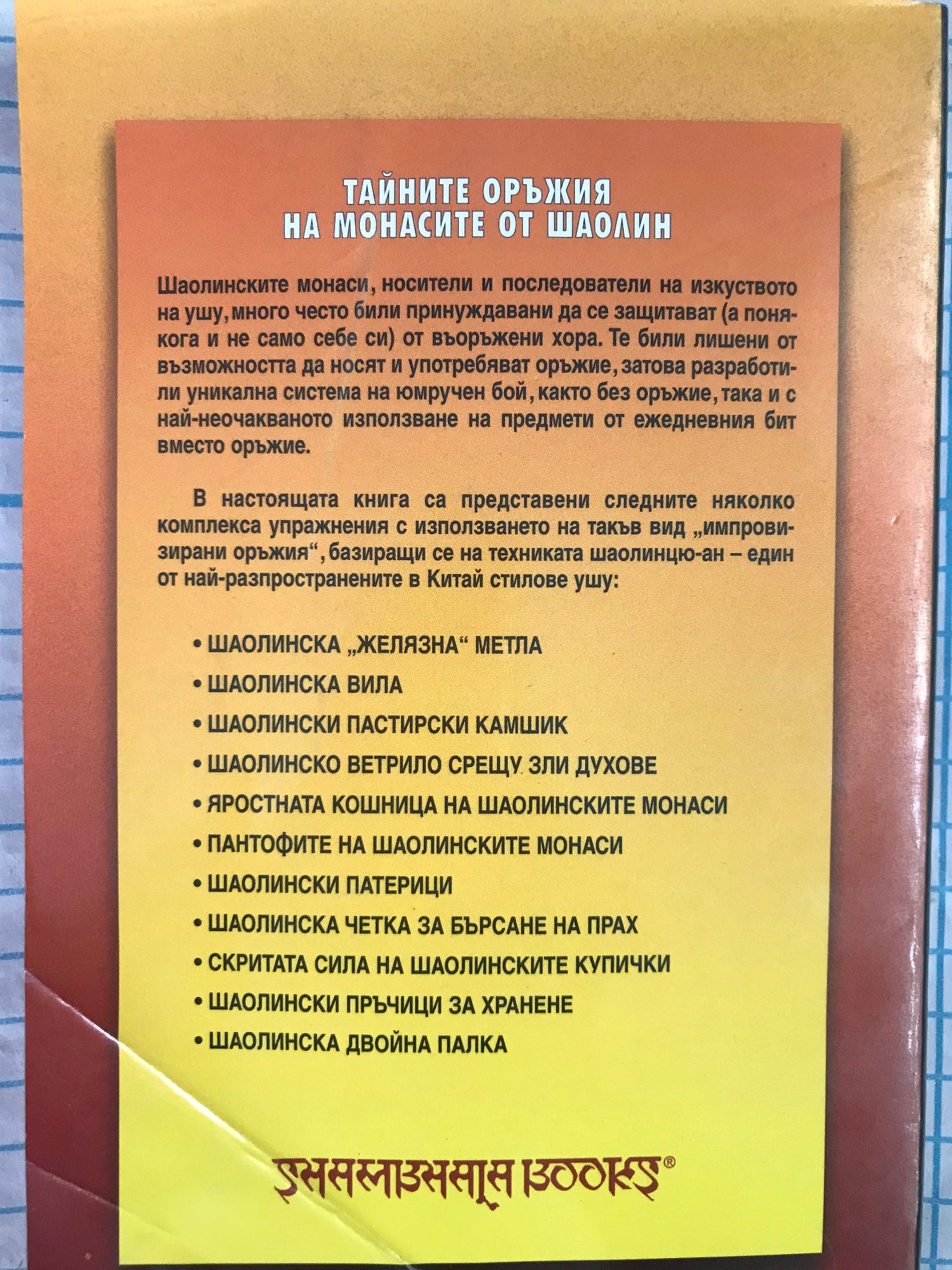 Шаолинските монаси, носители и последователи на изкуството на ушу, много често били принуждавани да се защитават (а понякога и не само себе си) от въоръжени хора. Те били лишени от възможността да носят и употребяват оръжие, затова разработили уникална система на юмручен бой, както без оръжие, така и с най-неочакваното използване на предмети от ежедневния бит вместо оръжие. В настоящата книга са представени следните няколко комплекса упражнения с използването на такъв вид „импровизирани оръжия", базиращи се на техниката шаолинцю-ан - един от най-разпространените в Китай стилове ушу: • ШАОЛИНСКА „ЖЕЛЯЗНА" МЕТЛА • ШАОЛИНСКА ВИЛА • ШАОЛИНСКИ ПАСТИРСКИ КАМШИК • ШАОЛИНСКО ВЕТРИЛО СРЕЩУ ЗЛИ ДУХОВЕ • ЯРОСТНАТА КОШНИЦА НА ШАОЛИНСКИТЕ МОНАСИ • ПАНТОФИТЕ НА ШАОЛИНСКИТЕ МОНАСИ • ШАОЛИНСКИ ПАТЕРИЦИ • ШАОЛИНСКА ЧЕТКА ЗА БЪРСАНЕ НА ПРАХ • СКРИТАТА СИЛА НА ШАОЛИНСКИТЕ КУПИЧКИ • ШАОЛИНСКИ ПРЬЧИЦИ ЗА ХРАНЕНЕ • ШАОЛИНСКА ДВОЙНА ПАЛКА