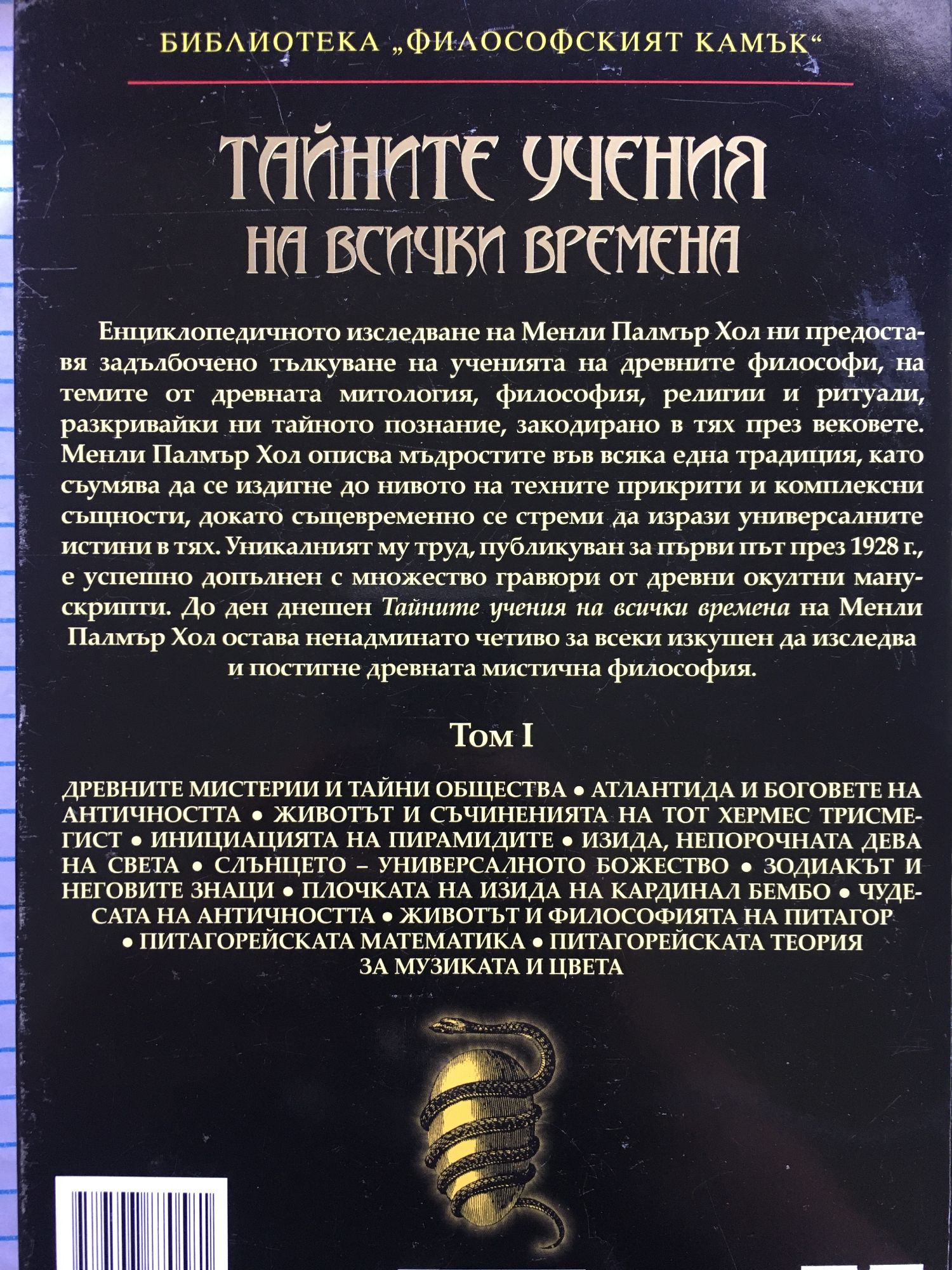 Енциклопедичното изследване на Менли Палмър Хол ни предоставя задълбочено тълкуване на ученията на древните философи, на темите от древната митология, философия, религии и ритуали, разкривайки ни тайното познание, закодирано в тях през вековете. Менли Палмър Хол описва мъдростите във всяка една традиция, като съумява да се издигне до нивото на техните прикрити и комплексни същности, докато същевременно се стреми да изрази универсалните истини в тях. Уникалният му труд, публикуван за първи път през 1928 г., е успешно допълнен с множество гравюри от древни окултни манускрипти. До ден днешен "Тайните учения на всички времена" на Менли Палмър Хол остава ненадминато четиво за всеки изкушен да изследва и постигне древната мистична философия. Том I съдържа информация за: Древните мистерии и тайни общества, които оказват влияние върху съвременната масонска символика Чудесата на античността Животът и философията на Питагор Питагорейската математика Питагорейската теория за музиката и цвета