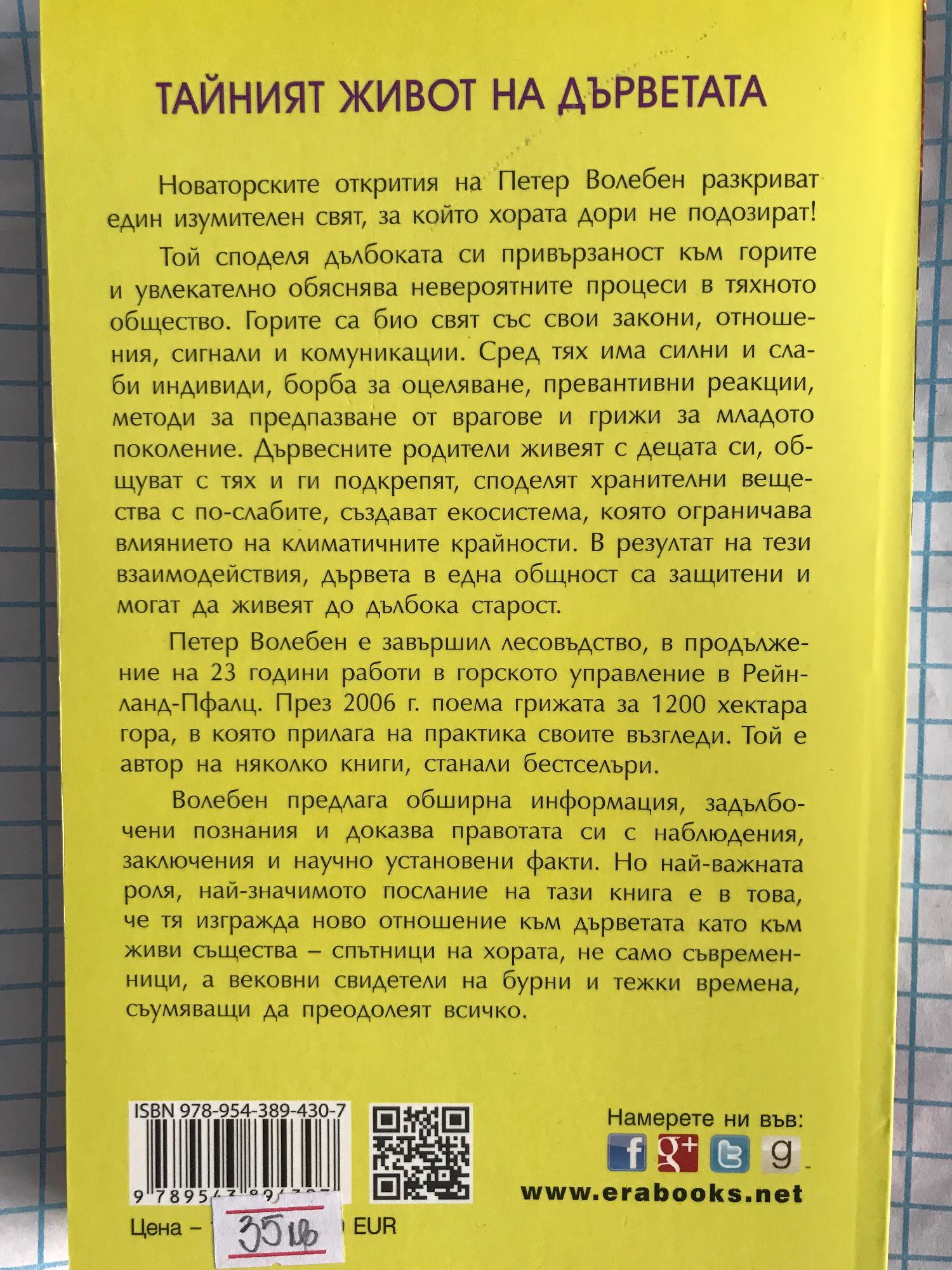 Новаторските открития на Петер Волебен разкриват един изумителен свят, за който хората дори не подозират! Той споделя дълбоката си привързаност към горите и увлекателно обяснява невероятните процеси в тяхното общество. Горите са био свят със свои закони, отношения, сигнали и комуникации. Сред тях има силни и слаби индивиди, борба за оцеляване, превантивни реакции, методи за предпазване от врагове и грижи за младото поколение. Дървесните родители живеят с децата си, общуват с тях и ги подкрепят, споделят хранителни вещества с по-слабите, създават екосистема, която ограничава влиянието на климатичните крайности. В резултат на тези взаимодействия, дървета в една общност са защитени и могат да живеят до дълбока старост. Петер Волебен е лесовъд, в продължение на 23 години работи в горското управление в провинция Рeйнланд-Пфалц. През 2006 г. поема грижата за 1200 хектара гора, в която прилага на практика своите възгледи. Той е автор на няколко книги, станали бестселъри. Волебен предлага обширна информация, задълбочени познания и доказва правотата си с наблюдения, заключения и научно установени факти. Но най-важната роля, най-значимото послание на тази книга е в това, че тя изгражда ново отношение към дърветата като към живи същества – спътници на хората, не само съвременници, а вековни свидетели на бурни и тежки времена, съумяващи да преодолеят всичко.