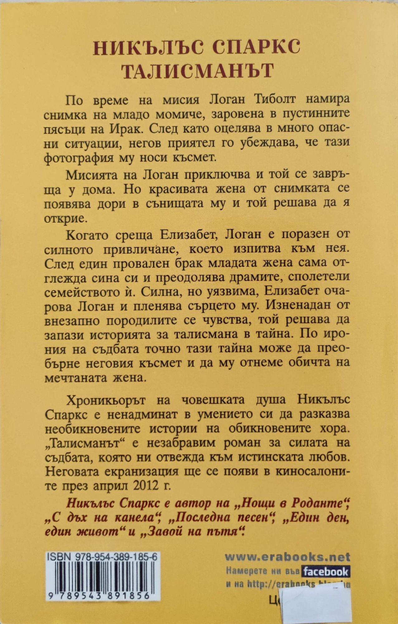 По време на мисия Логан Тиболт намира снимка на младо момиче, заровена в пустинните пясъци на Ирак. След като оцелява в много опасни ситуации, негов приятел го убеждава, че тази фотография му носи късмет. Мисията на Логан приключва и той се завръща у дома. Но красивата жена от снимката се появява дори в сънищата му и той решава да я открие. Когато среща Елизабет, Логан е поразен от силното привличане, което изпитва към нея. След един провален брак младата жена сама отглежда сина си и преодолява драмите, сполетели семейството й. Силна, но уязвима, Елизабет очарова Логан и пленява сърцето му. Изненадан от внезапно породилите се чувства, той решава да запази историята за талисмана в тайна. По ирония на съдбата точно тази тайна може да преобърне неговия късмет и да му отнеме обичта на мечтаната жена. Хроникьорът на човешката душа Никълъс Спаркс е ненадминат в умението си да разказва необикновените истории на обикновените хора. „Талисманът” е незабравим роман за силата на съдбата, която ни отвежда към истинската любов. Неговата екранизация ще се появи в киносалоните през април 2012 г.
