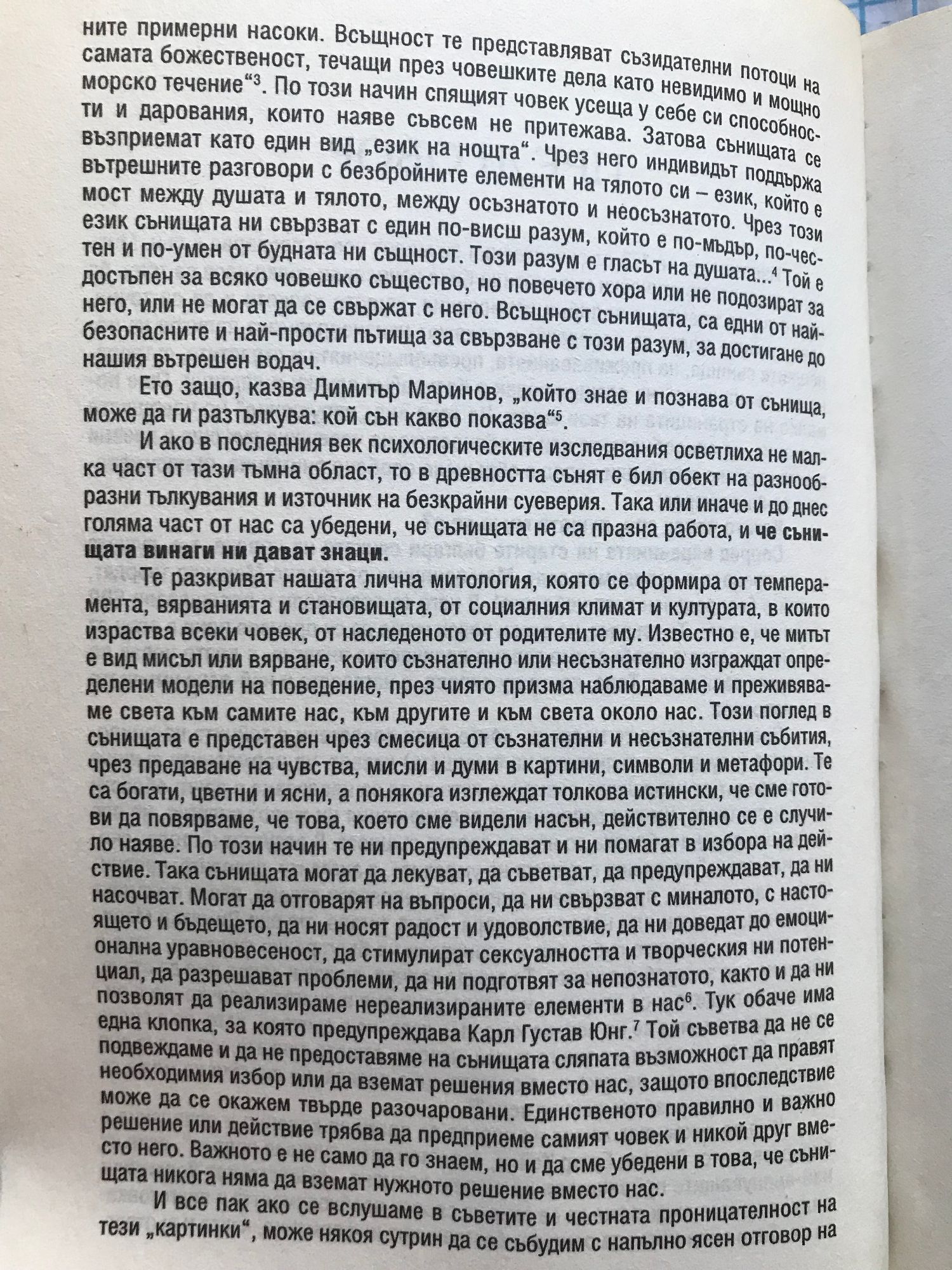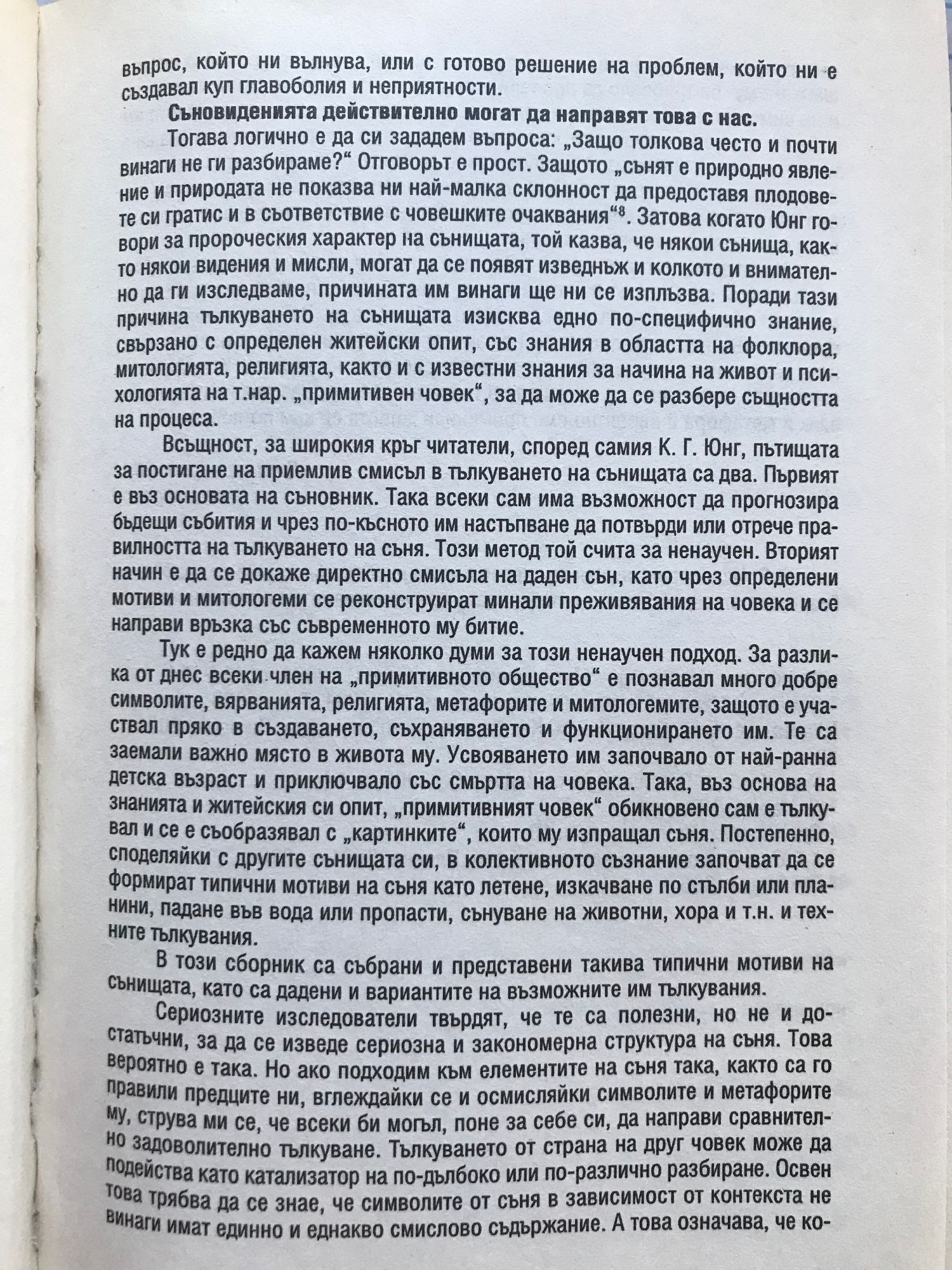 Когато човек спи, душата му къде е? Според вярванията на старите българи сянката на човека, т.е. душата му, се пренася в невидимия свят. Магьосниците от древно Мексико твърдят, че той е безпределен като небесата. В него те познавали и посещавали 600 различни свята. Те твърдят, че всеки човек може да се пренесе поне в един от тях. Но за целта е необходимо голямо количество енергия, с която човек по рождение разполага. Това, което му липсва, е нагласата и най-вече умението да я използва. Онези от древните мъдреци, които били посветени в тайните на ониромантията (науката за тълкуване на сънищата) казват, че нормалните сънища се използват от човешкото съзнание като вход за навлизане в други области на възприятието, имащи различна от всекидневния ни живот енергия, но все пак много сходна и близка до нас по своята същност. В резултат на това "сянката на човека" се среща с душите на умрелите, с ангелите, дяволите, орисниците и самовилите, пренася се в далечни и непознати страни, влиза в контакт с далечни, познати или непознати хора. Само тогава, твърди Димитър Маринов, един от големите събирачи и познавачи на българския фолклор, "тя е в общение със задгробния живот. Тя вижда всичко, вижда и какво има да стане, защото бъдещето й се открива, и когато се върне в снагата, всичко що е видяла, представлява се на човека като сън, като, че е сънувал, като, че е видял на сън. Само, че тоя сън е много тъмен, неясен, защото сянката, като се върне в снагата, разказва на духа и на снагата що е видяла, но снагата не може да запомни или да разбере всичко ясно". В съня духовният живот на човека се променя коренно в сравнение с бодърстването. Според Едгар Кейси, известен като "спящия пророк", един от най-вълнуващите прорицатели на всички времена, "съществуват Всемирни сили, с които човек може да се свърже според необходимост и подготовката си. Тези сили могат да осигурят безгранична информация, както и сьответните примерни насоки. Всъщност те представляват съзидателни потоци на самата божественост, течащи през човешките дела като невидимо и мощно морско течение". По този начин спящият човек усеща у себе си способности и дарования, които наяве съвсем не притежава. Затова сънищата се възприемат като един вид "език на нощта". Чрез него индивидът поддържа вътрешните разговори с безбройните елементи на тялото си - език, който е мост между душата и тялото, между осъзнатото и неосъзнатото. Чрез този език сънищата ни свързват с един по-висш разум, който е по-мъдър, по-честен и по-умен от будната ни същност. Този разум е гласът на душата... Той е достъпен за всяко човешко същество, но повечето хора или не подозират за него, или не могат да се свържат с него. Всъщност сънищата, са едни от най-безопасните и най-прости пътища за свързване с този разум, за достигане до нашия вътрешен водач. Ето защо, казва Димитър Маринов, "който знае и познава от сънища, може да ги разтълкува: кой сън какво показва". И ако в последния век психологическите изследвания осветлиха не малка част от тази тъмна област, то в древността сънят е бил обект на разнообразни тълкувания и източник на безкрайни суеверия. Така или иначе и до днес голяма част от нас са убедени, че сънищата не са празна работа, и че сънищата винаги ни дават знаци.