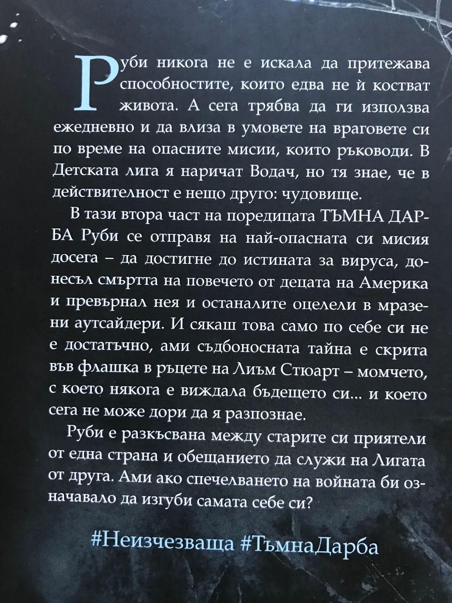 Книга 1: Когато Руби се буди на десетия си рожден ден, нещо в нея е различно. Нещо достатъчно притеснително, че да подтикне родителите й да я заключат в гаража и да повикат полицията. Нещо, което я изпраща в Търмънд, брутален правителствен „рехабилитационен лагер“. В действителност Руби успява да преживее мистериозното заболяване, което погубва повечето деца в Америка. Но тя и останалите като нея оцеляват, като се сдобиват с нещо много плашещо — умения, които не могат да контролират. Вече на шестнайсет, Руби е една от опасните. Книга 2: Руби никога не е искала да притежава способностите, които едва не й костват живота. А сега трябва да ги използва ежедневно и да влиза в умовете на враговете си по време на опасните мисии, които ръководи. В Детската лига я наричат Водач, но тя знае, че в действителност е нещо друго: чудовище. В тази втора част на поредицата ТЪМНА ДАРБА Руби се отправя на най-опасната си мисия досега - да достигне до истината за вируса, донесъл смъртта на повечето от децата на Америка и превърнал нея и останалите оцелели в мразени аутсайдери. И сякаш това само по себе си не е достатъчно, ами съдбоносната тайна е скрита във флашка в ръцете на Лиъм Стюарт - момчето, с което някога е виждала бъдещето си... и което сега не може дори да я разпознае. Руби е разкъсвана между старите си приятели от една страна и обещанието да служи на Лигата от друга. Ами ако спечелването на войната би означавало да изгуби самата себе си?