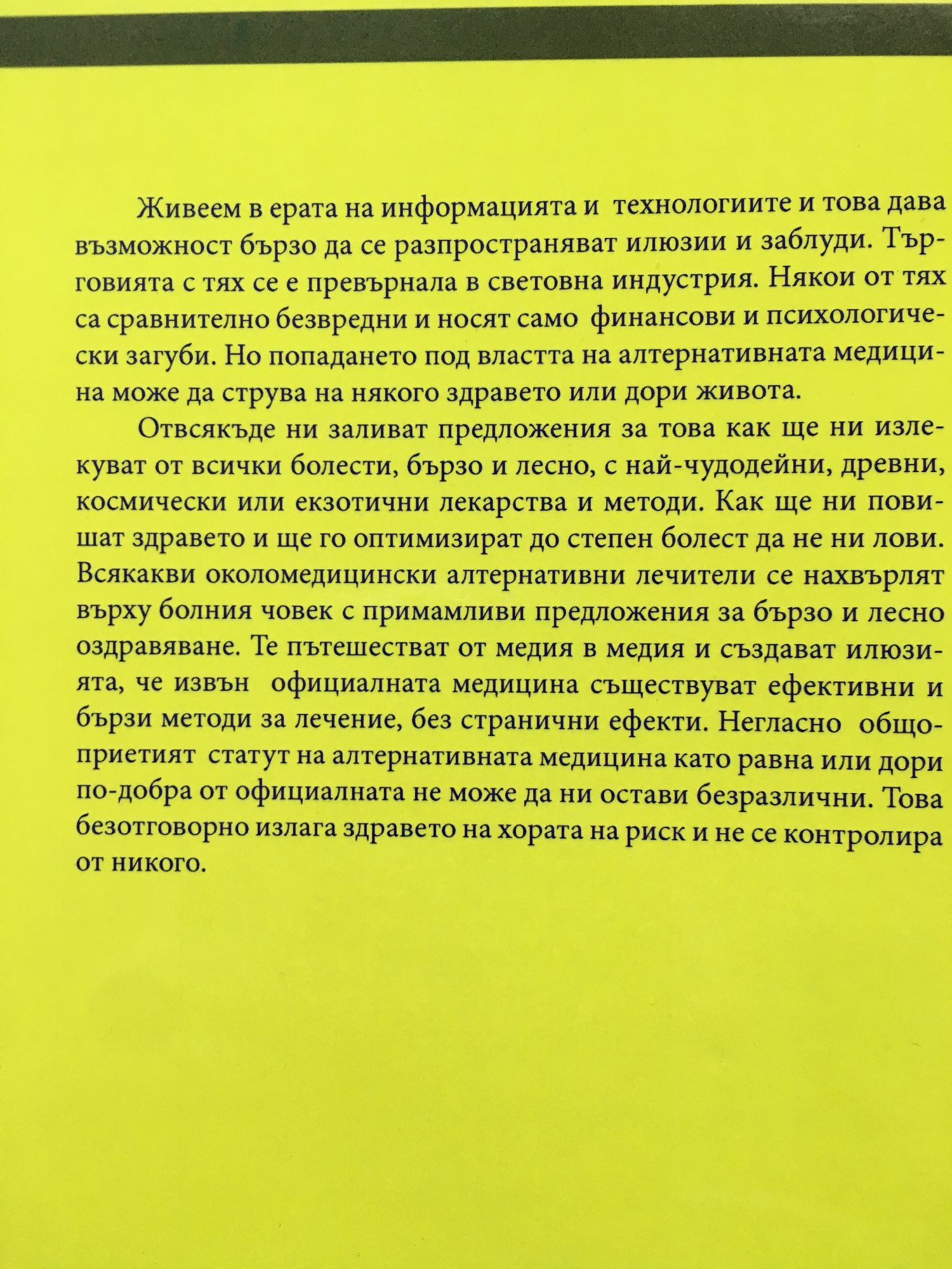 Живеем в ерата на информацията и технологиите и това дава възможност бързо да се разпространяват илюзии и заблуди. Търговията с тях се е превърнала в световна индустрия. Някои от тях са сравнително безвредни и носят само финансови и психологически загуби. Но попадането под властта на алтернативната медицина може да струва на някого здравето или дори живота. От всякъде ни заливат предложения за това как ще ни излекуват от всички болести, бързо и лесно, с най-чудодейни, древни, космически или екзотични лекарства и методи. Как ще ни повишат здравето и ще го оптимизират до степен болест да не ни лови. Всякакви околомедицински алтернативни лечители се нахвърлят върху болния човек с примамливи предложения за бързо и лесно оздравяване. Те пътешестват от медия в медия и създават илюзията, че извън официалната медицина съществуват ефективни и бързи методи за лечение, без странични ефекти. Негласно общоприетият статут на алтернативната медицина като равна или дори по-добра от официалната не може да ни остави безразлични. Това безотговорно излага здравето на хората на риск и не се контролира от никого.