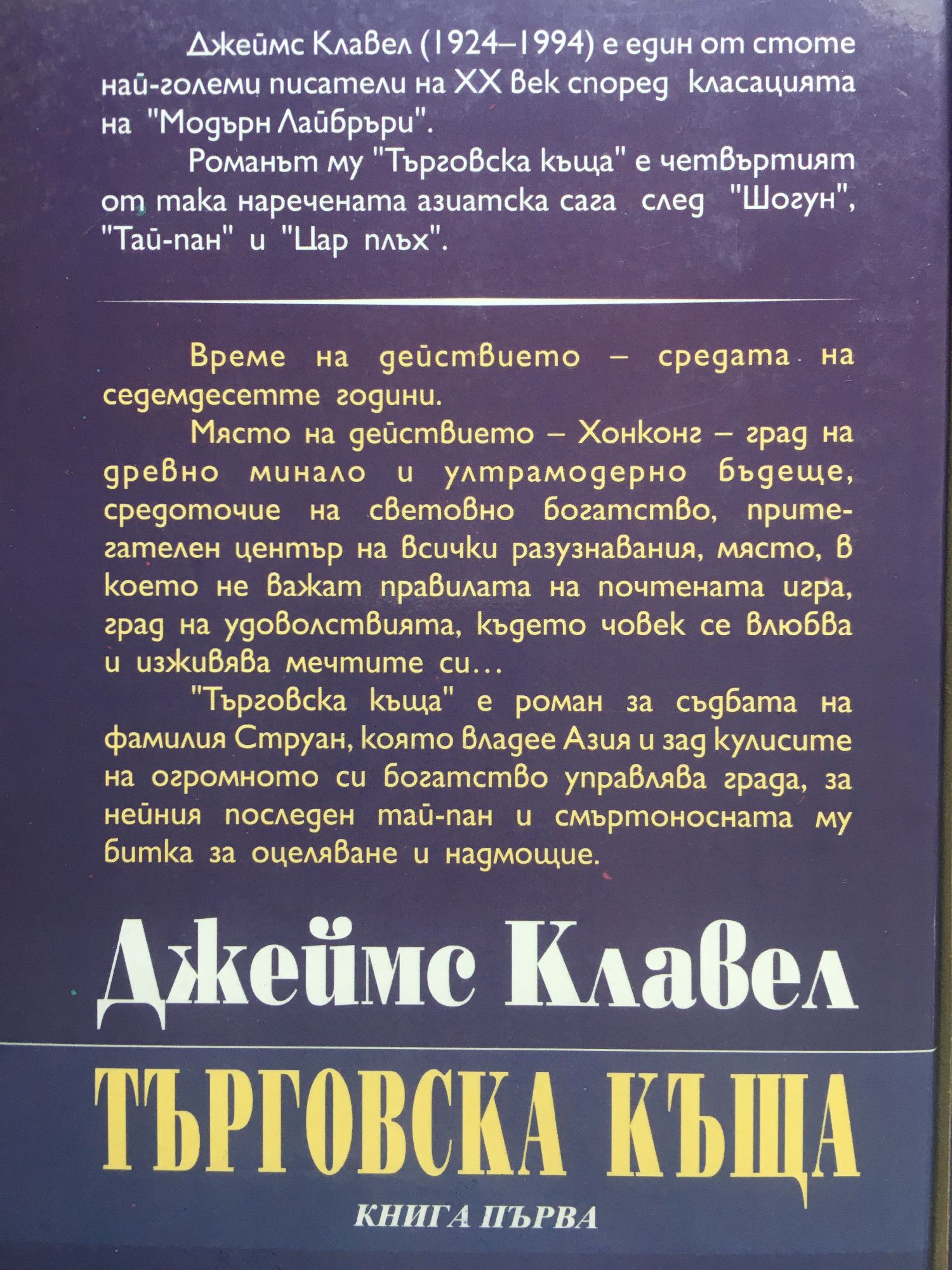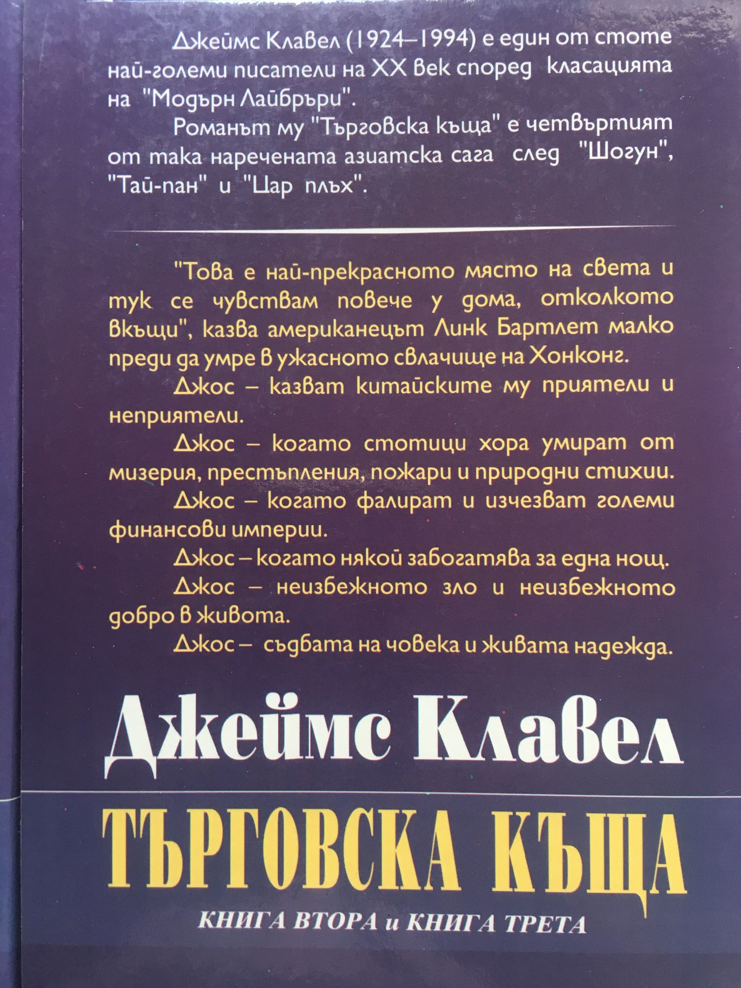 Книга 1: Джеймс Клавел е един от стоте най-големи писатели на XX век според класацията на „Модърн Лайбръри". Романът му „Търговска къща" е част от така наречената азиатска сага заедно е „Шогун", „Тай-пан" и „Цар плъх". Време на действието - средата на 70-те години на XX век. Място на действието - Хонконг, град на древно минало и ултрамодерно бъдеще, средоточие на световно богатство, притегателен център на всички разузнавания, място, където не важат правилата на почтената игра, град на удоволствията, където човек се влюбва и изживява мечтите си... „Търговска къща" е роман за съдбата на фамилия Струан, която владее Азия и зад кулисите на огромното си богатство управлява града, за нейния последен тай-пан и смъртоносната му битка за оцеляване и надмощие. Книга 2 и 3: "Това е най - прекрасното място на света и тук се чувствам повече у дома, отколкото вкъщи", казва американецът Линк Бартлет малко преди да умре в ужасното свлачище на Холдинг. "Джос", казват китайските му приятели и неприятели. Джос - когато стотици хора умират от мизерия, престъпления, пожари и природни стихии. Джос - когато фалират и изчезват големи финансови империи. Джос - когато някой забогатява за една нощ. Джос - неизбежното зло и неизбежното добро в живота. Джос - съдбата на човека и надеждата, която не умира.