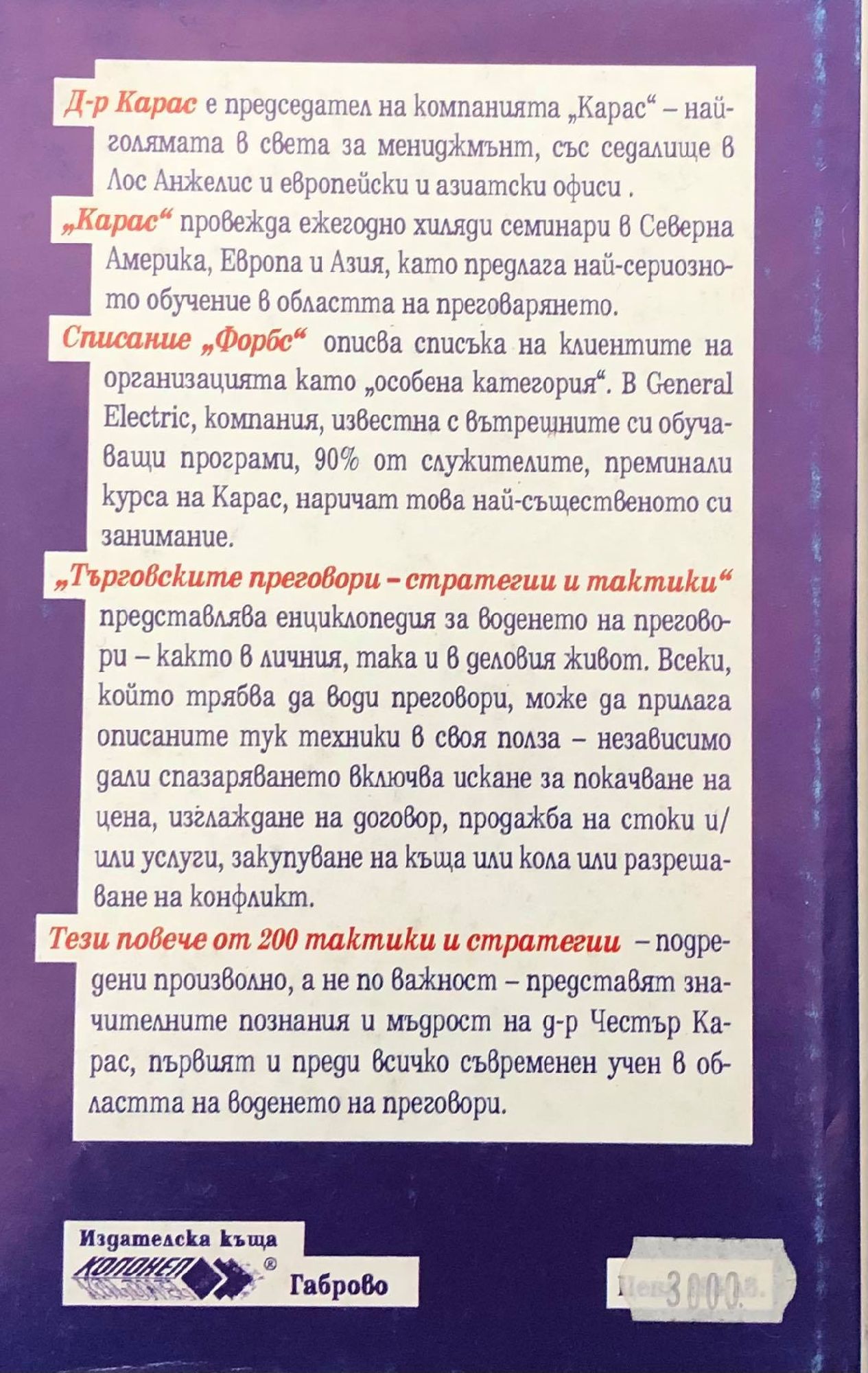 Търговските преговори – стратегии и тактики е най-многотиражната книга на американския експерт по водене на преговорин д-р Честър Луис Карас. В България е издадена за пръв път в началото на 90-те години на ХХ век. Хората се нуждаят от време, за да приемат всичко ново и различно. (с.9) Противопоставянето на всяка промяна е в същността на човешката природа. (с.9) Когато карате хората да заменят старите идеи с нова, вие ги карате да изоставят стари приятели. (с.10) Всеки от нас по някакъв повод е казвал на детето си: "Ако се целиш по-високо, ще постигнеш повече." (с.10) Целта не е желание, а твърдо намерение да се постигне набелязаното, което включва и представата на иднивида за самия себе си. Един неуспех при изпълнението на целта се изпразява в загуба на чувството за собствено достойнство. (с.12)