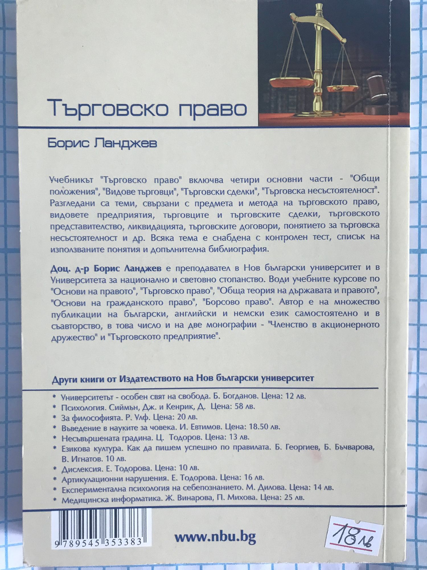 Учебникът "Търговско право" включва четири основни части: Общи положения Видове търговци Търговски сделки Търговска несъстоятелност Разгледани са теми, свързани с предмета и метода на търговското право, видовете предприятия, търговците и търговските сделки, търговското представителство, ликвидацията, търговските договори, понятието за търговска несъстоятелност и др. Всяка тема е снабдена с контролен тест, списък на използваните понятия и допълнителна библиография. Доц. д-р Борис Ланджев е преподавател в Университета за национално и световно стопанство и в Нов български университет. Води учебните курсове по "Основи на правото", "Търговско право", "Обща теория на държавата и правото", "Основи на гражданското право", "Борсово право". Автор е на множество публикации на български, английски и немски език самостоятелно и в съавторство, в това число и на две монографии - "Членство в акционерното дружество" и "Търговското предприятие".