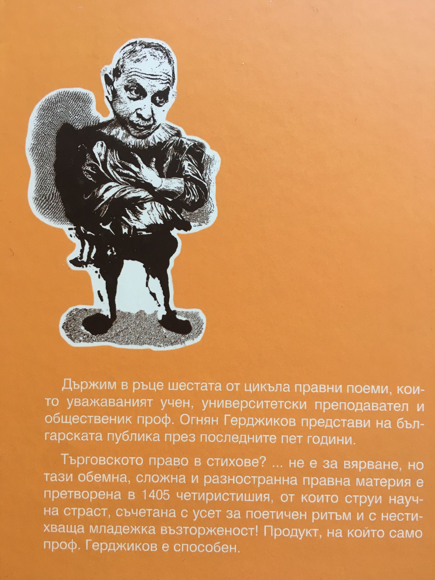 Държим в ръце шестата от цикъла правни поеми, които уважаваният учен, университетски преподавател и общественик проф. Огнян Герджиков представи на българската публика през последните пет години. Търговското право в стихове? ... не е за вярване, но тази обемна, сложна и разностранна правна материя е претворена в 1405 четиристишия, от които струи научна страст, съчетана с усет за поетичен ритъм и с нестихваща младежка възторженост! Продукт, на който само проф. Герджиков е способен.