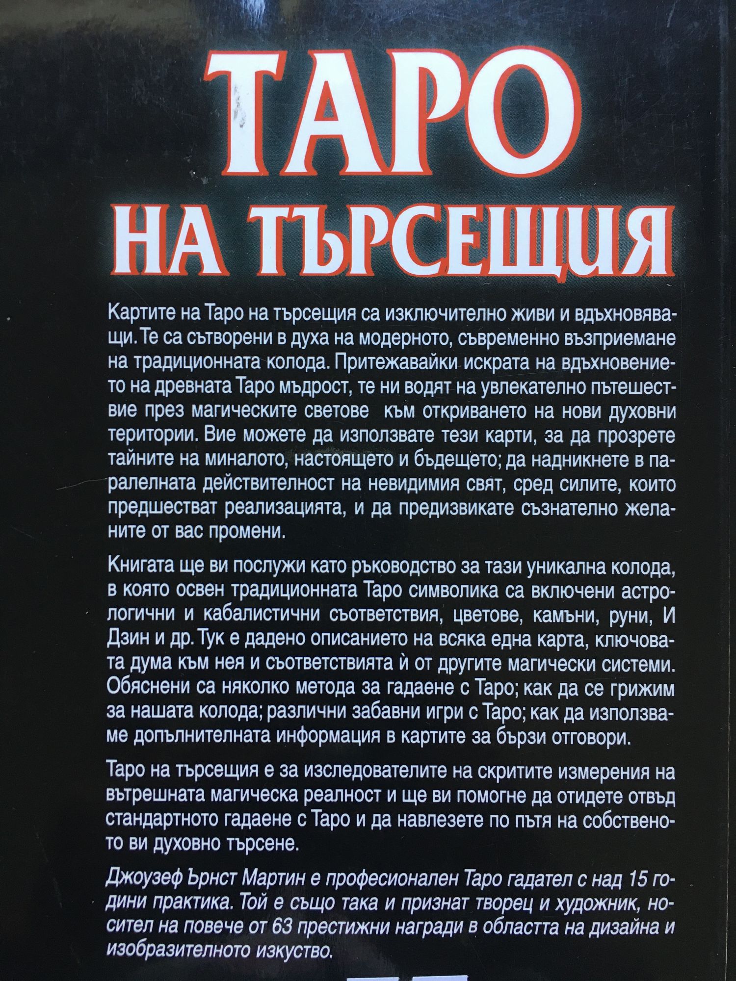 Картите на Таро на търсещия са изключително живи и вдъхновяващи. Те са сътворени в духа на модерното, съвременно възприемане на традиционната колода. Притежавайки искрата на вдъхновението на древната Таро мъдрост, те ни водят на увлекателно пътешествие през магическите светове към откриването на нови духовни територии. Вие можете да използвате тези карти, за да прозрете тайните на миналото, настоящето и бъдещето; да надникнете в паралелната действителност на невидимия свят, сред силите, които предшестват реализацията, и да предизвикате съзнателно желаните от вас промени. Книгата ще ви послужи като ръководство за тази уникална колода, в която освен традиционната Таро символика са включени астрологични и кабалистични съответствия, цветове, камъни, руни, И Дзин и др. Тук е дадено описанието на всяка една карта, ключовата дума към нея и съответствията й от другите магически системи. Обяснени са няколко метода за гадаене с Таро; как да се грижим за нашата колода; различни забавни игри с Таро; как да използваме допълнителната информация в картите за бързи отговори. Таро на търсещия е за изследователите на скритите измерения на вътрешната магическа реалност и ще ви помогне да отидете отвъд стандартното гадаене с Таро и да навлезете по пътя на собственото ви духовно търсене. Джоузеф Ърнст Мартин е професионален Таро гадател с над 15 години практика. Той е също така и признат творец и художник, носител на повече от 63 престижни награди в областта на дизайна и изобразителното изкуство.