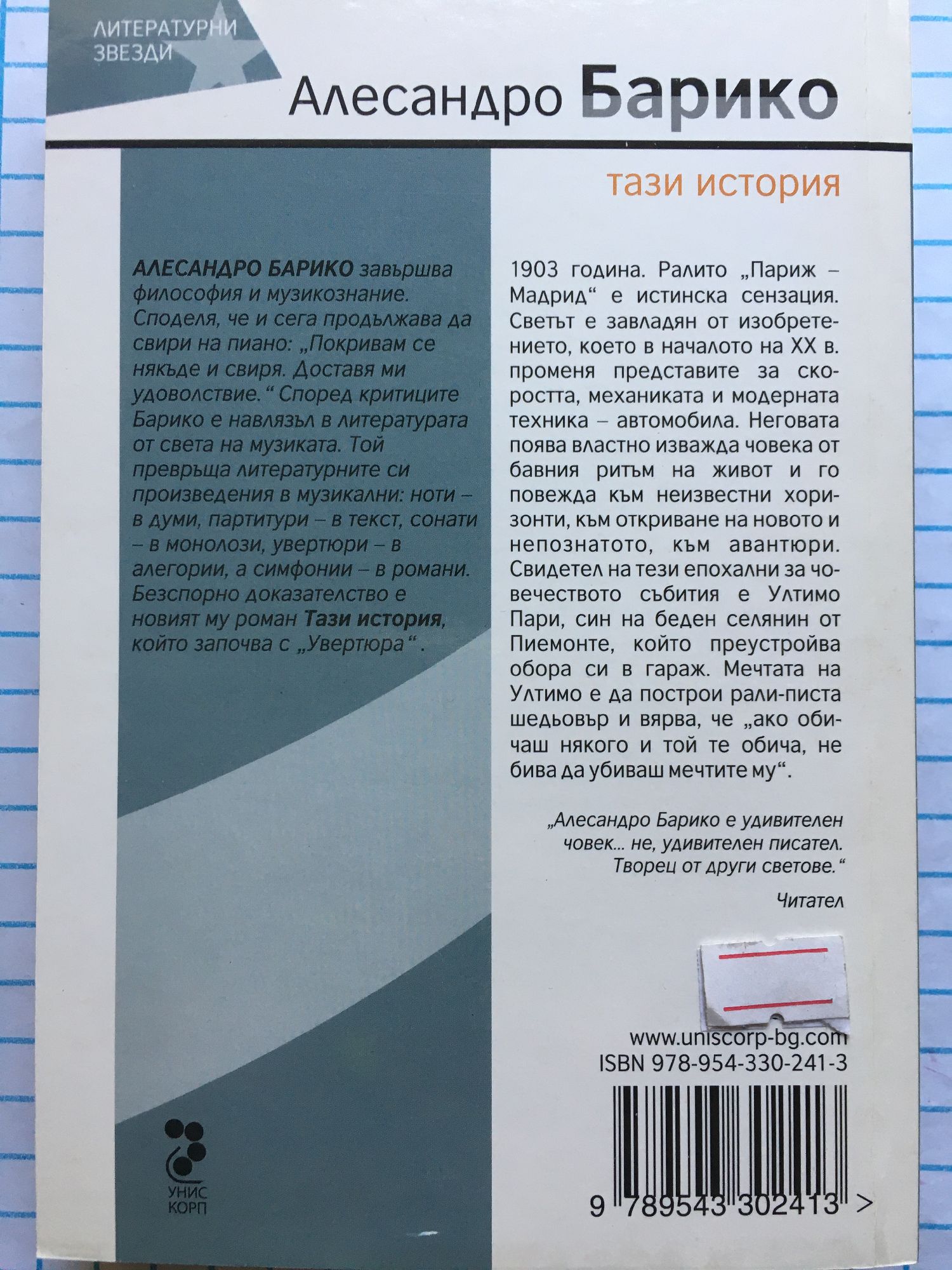 Алесандро Барико е наистина уникален писател, новатор и философ, а романът му „Тази история” е история за човешките мечти и висотата на човешкия дух; вдъхновяващ и емоционален разказ за сбъдването на бляновете и копнежите на душата. Третият роман на Барико ще ни въведе в началото на миналия век, когато човекът става свидетел на едно ново изобретение, призвано да промени света – автомобила. Неговата поява ще промени представите за скоростта, механиката и модерната техника. И също ще промени хоризонта на човека от бавния ритъм на живот към откриване на нови и непознати неща. Свидетел на тези епохални събития за човечеството е Ултимо Пари, син на беден и обикновен селянин от областта Пиемонте, чийто бащата продава единственото си богатство – двадесет и пет крави, за да превърне обора в гараж. Автомобилната страст и пистите ще преобърнат един живот. Ултимо е едно момче, което, както го представя Барико, остарява в опита си да подреди света. Мечтата му е да построи рали-писта шедьовър и вярва, че „ако обичаш някого и той те обича, не бива да убиваш мечтите му”. На петгодишна възраст Ултимо за пръв път вижда автомобил, на деветнадесет вече е в страшна битка при Капорето по време на Първата световна война, на двадесет и пет среща голямата си любов, и е на много повече, когато умира в Южна Америка. „Тази история” е всъщност неговата лична човешка история, проследяваща събитията от началото на ХХ век до 70-те години. След приключването на Първата световна война той заминава за Америка, където среща и руската девойка Елисавета. Тя е жената на неговия живот, голямата му любов, която след мистериозното изчезване на Ултимо, ще възстанови истинската му история и ще възкреси тайните и мечтите му. В един невероятен финал, който може да ни поднесе само фантазията на Барико. Романът на Алесандро Барико е написан интелигентно и дълбоко, така че да навлезе бавно и неусетно в душата и да трогне. Едновременно с това умее да изтръгне сълзи от читателя, защото италианският писател има способността да те пренесе в един фантастичен свят без да губи никога връзка с реалността. Един автор, който умее да разкаже всяка история вдъхновяващо със страст и човещина. Автор, който никога не може да разочарова читателя.