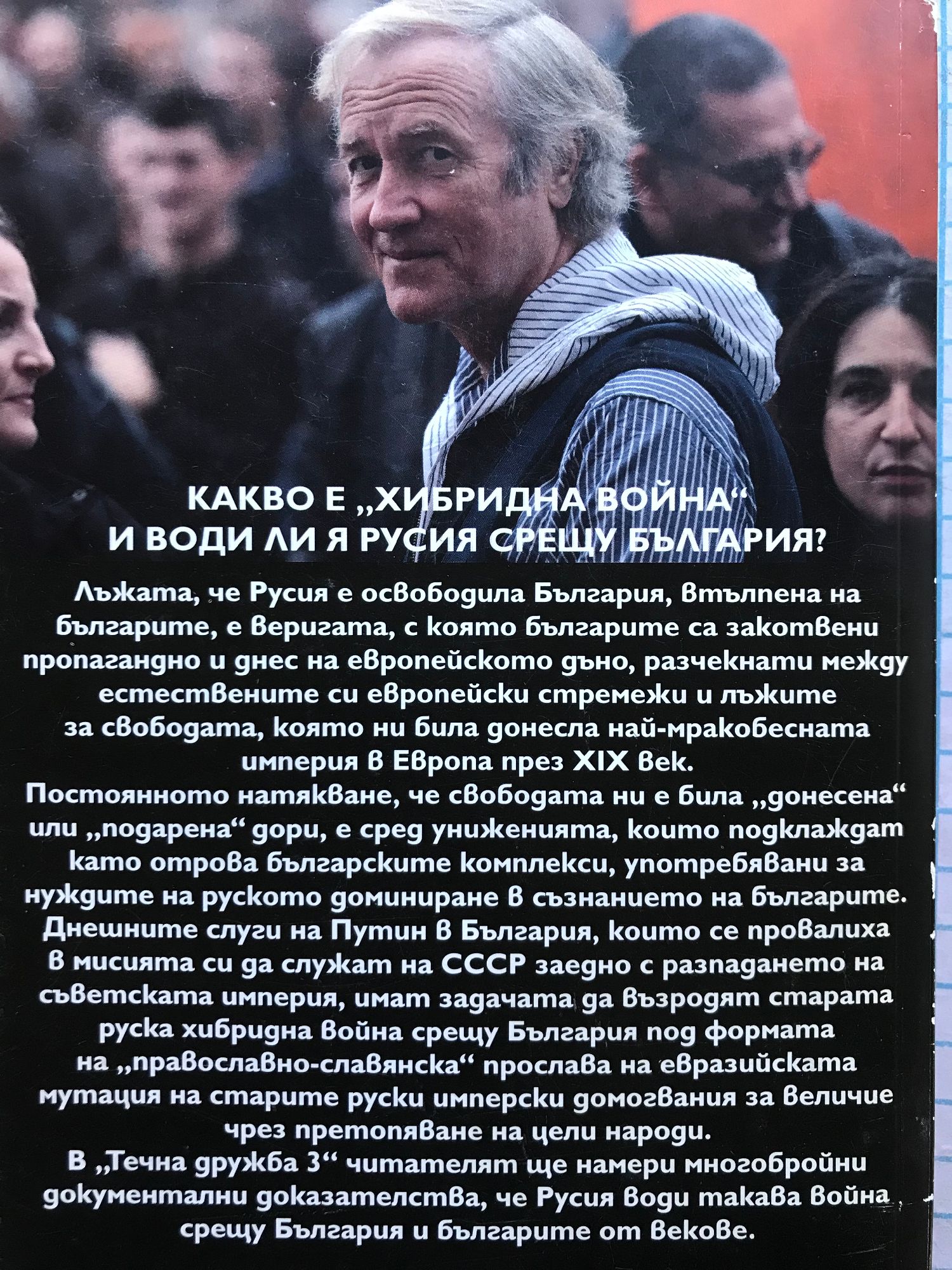 Какво е „хибридна война“ и води ли я Русия срещу България? Лъжата, че Русия е освободила България, втълпена на българите, е веригата, с която българите са закотвени пропагандно и днес на европейското дъно, разчекнати между естествените си европейски стремежи и лъжите за свободата, която ни била донесла най-мракобесната империя в Европа през XIX век. Постоянното натякване, че свободата ни е била „донесена“ или „подарена“ дори, е сред униженията, които подклаждат като отрова българските комплекси, употребявани за нуждите на руското доминиране в съзнанието на българите. Днешните слуги на Путин в България, които се провалиха в мисията си да служат на СССР заедно с разпадането на съветската империя, имат задачата да възродят старата руска хибридна война срещу България под формата на „православно-славянска“ прослава на евразийската мутация на старите руски имперски домогвания за величие чрез претопяване на цели народи. В „Течна дружба 3“ читателят ще намери многобройни документални доказателства, че Русия води такава война срещу България и българите от векове.