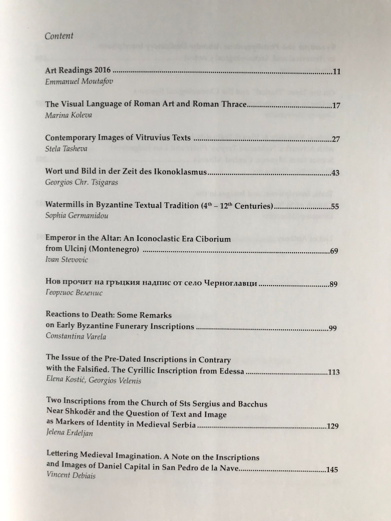Сборникът представя статии от проведената през 2016 година международна научна конференция „Текстове. Надписи. Образи“ в рамките на ежегодния научен форум Изкуствоведски четения 2016, организиран от Института за изледване на изкуствата.